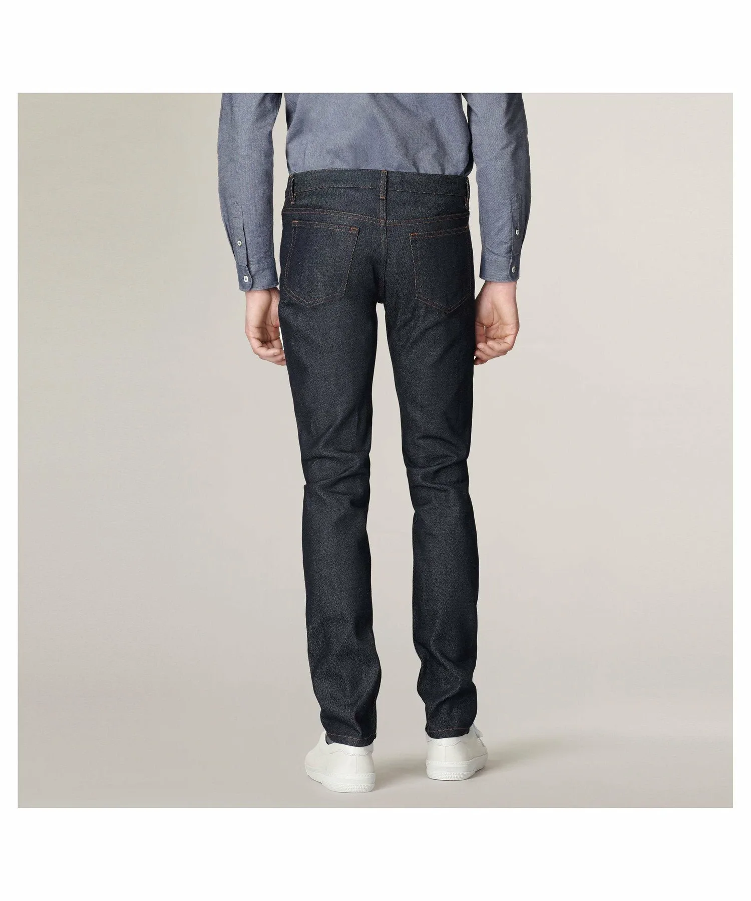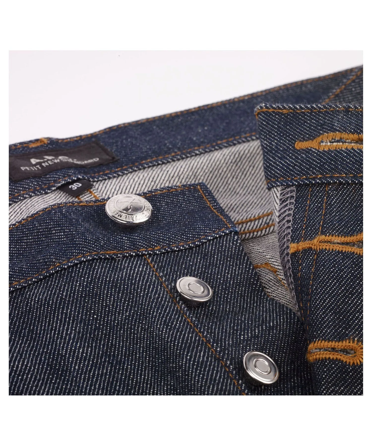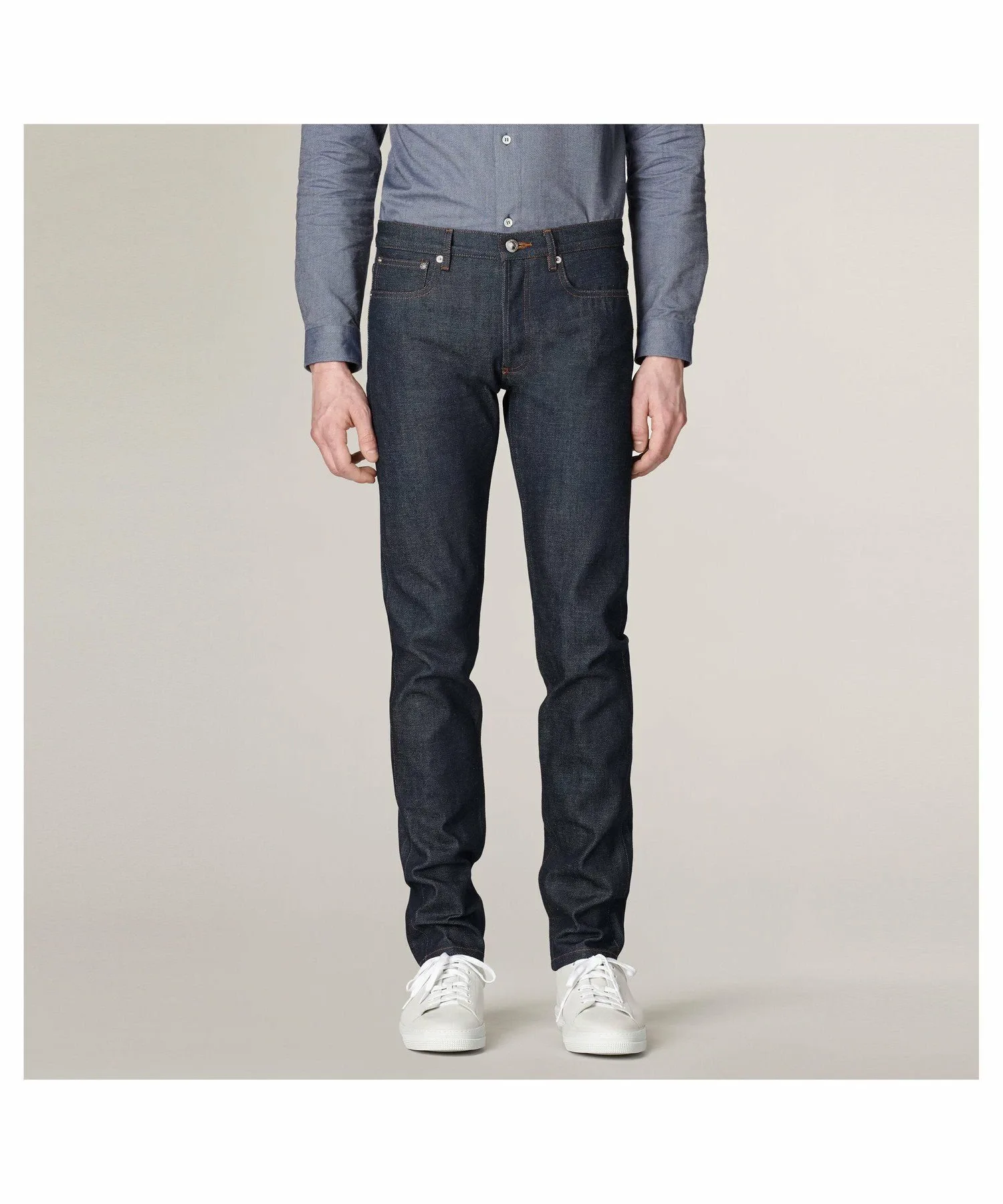 Японский нерафинированный деним. Джинсы унисекс. Узкие штанины. Зауженный низ. Средняя посадка. Прямой пояс. Пять карманов. Застежка на пуговицах. Надпись "APCrueMadamepresduLuxembourg" на пуговице пояса. Красная кромка. Оранжевая строчка. 14,50 унций.