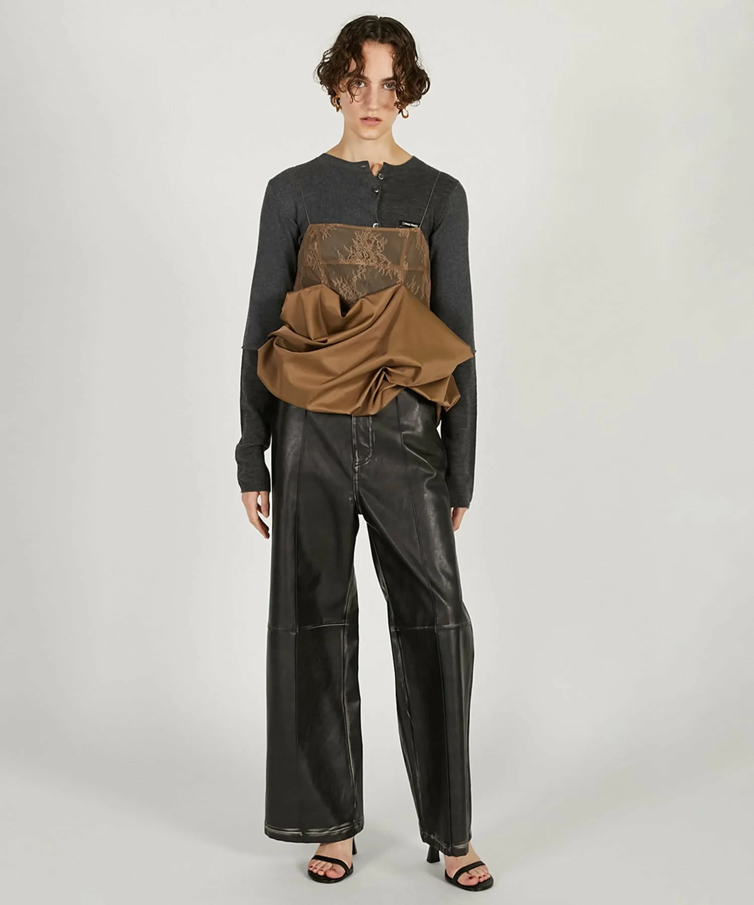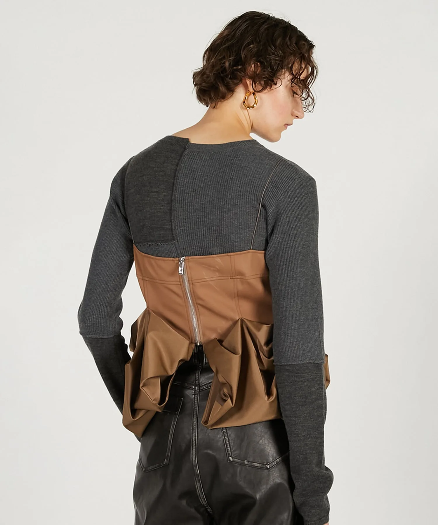 Контрастные материалы позволяют носить эту вещь как отдельно, так и в сочетании с другими элементами гардероба.