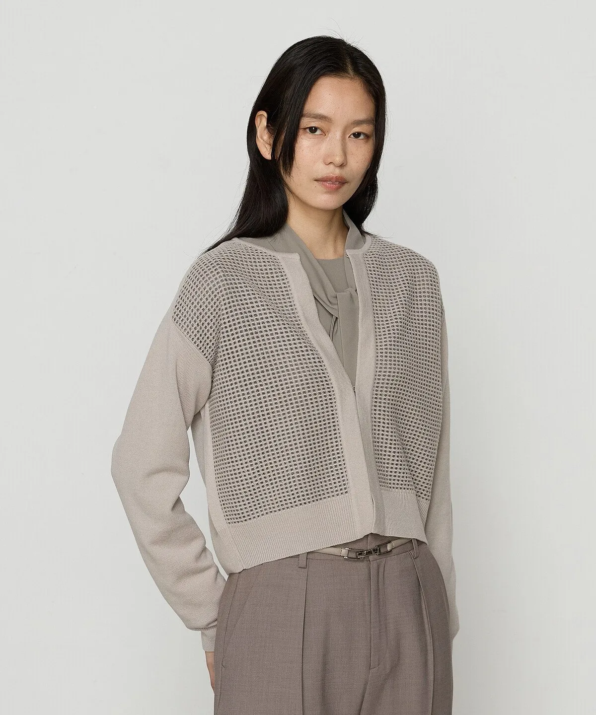 Этот вязаный кардиган сочетает в себе плотную трикотажную вязку и узор «ламе».