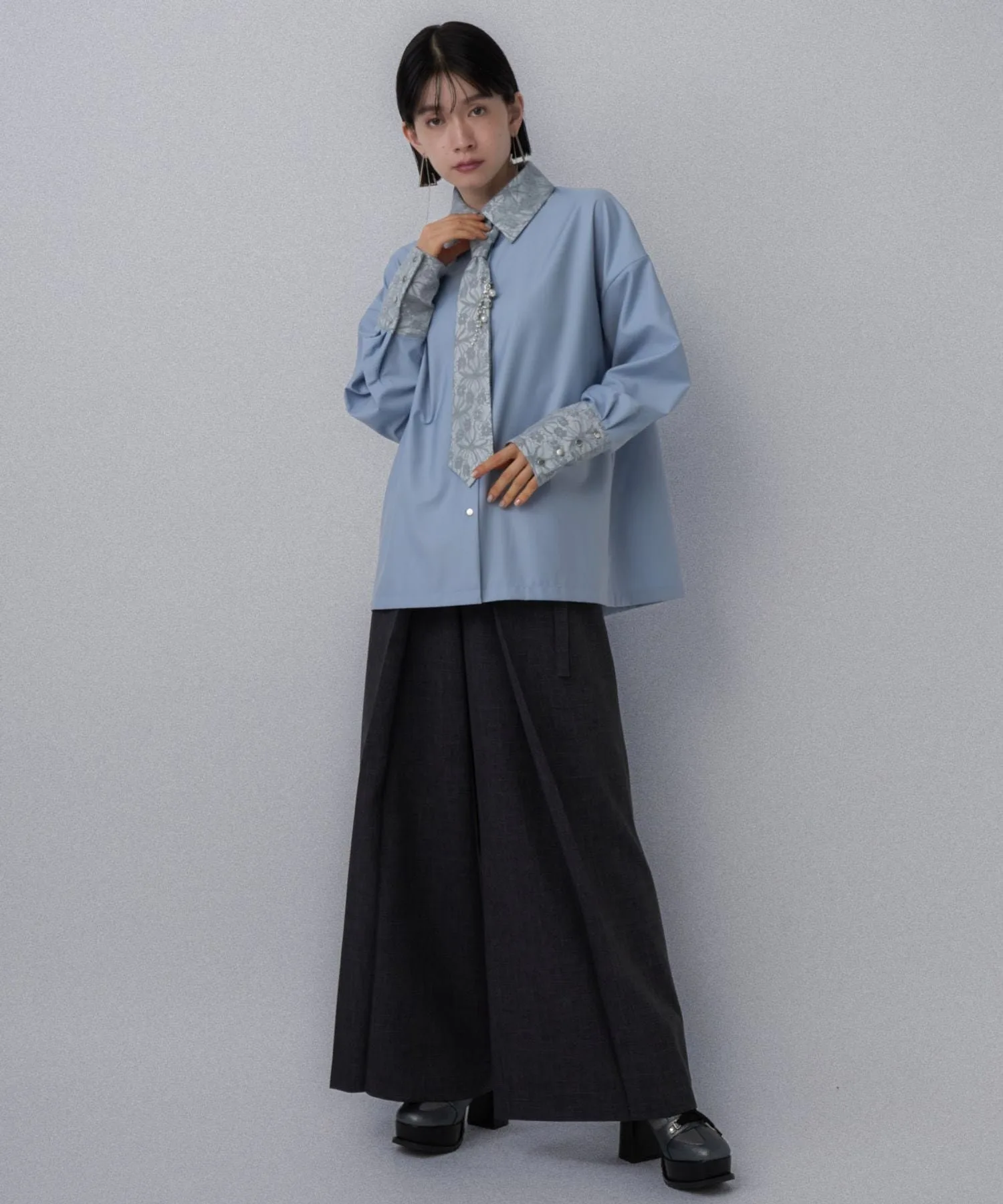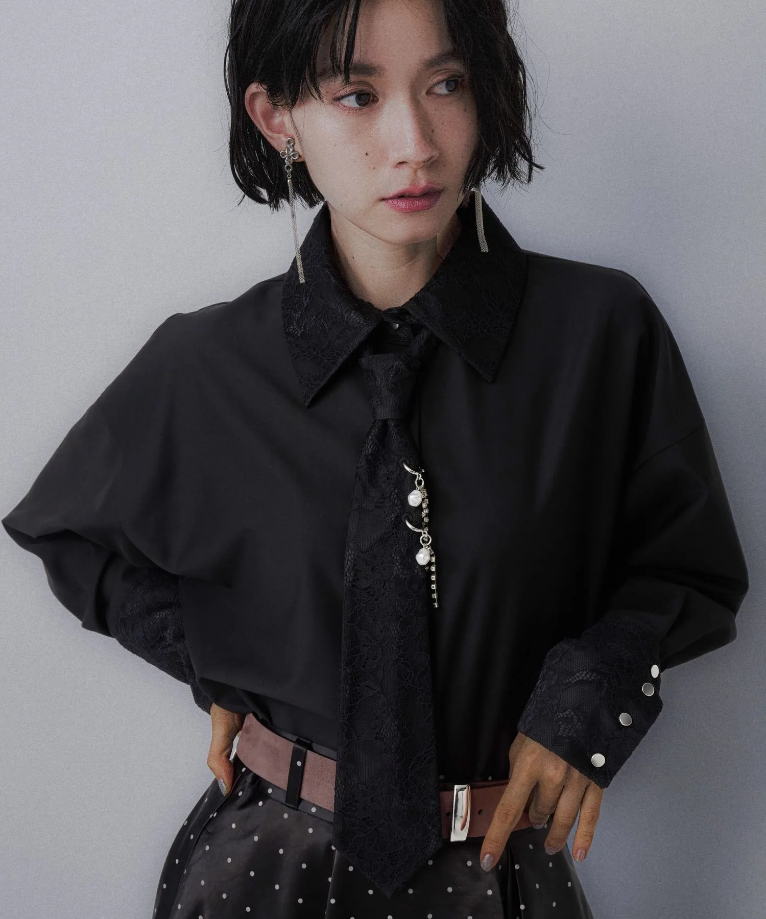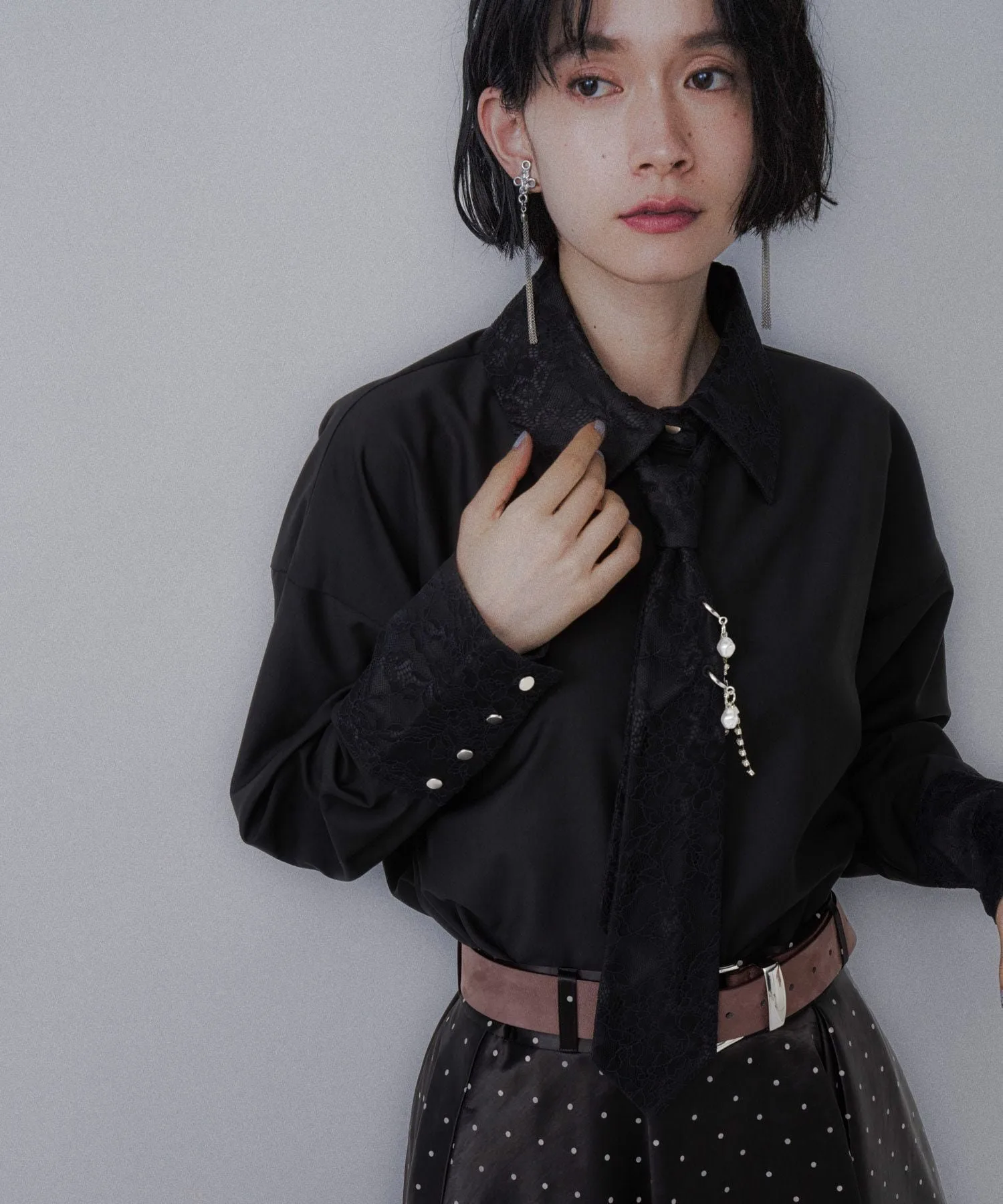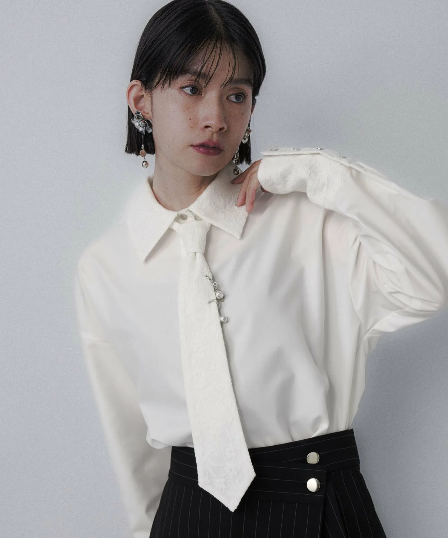 □Кружевные узоры на воротнике, галстуке и рукавах добавляют женственности