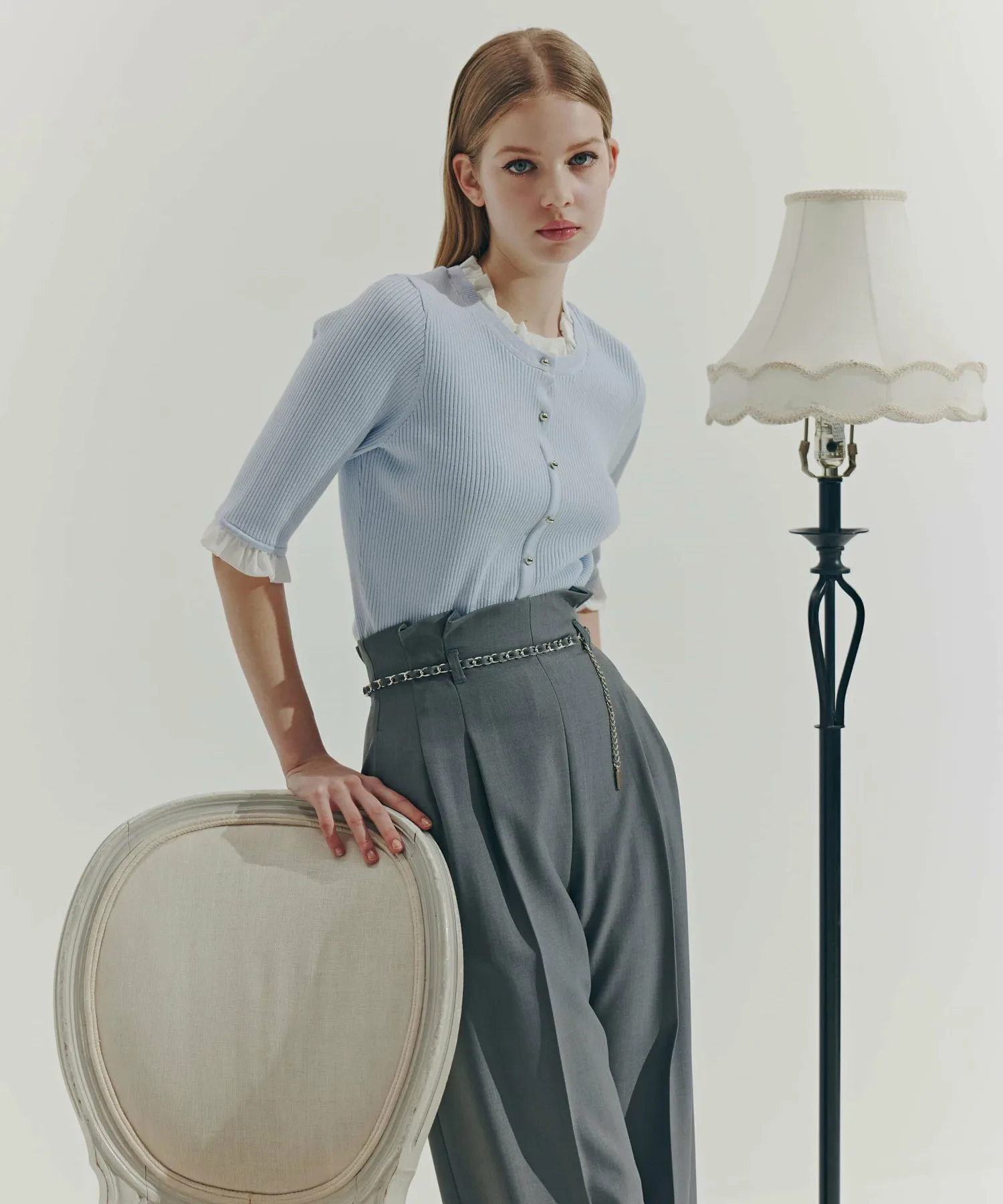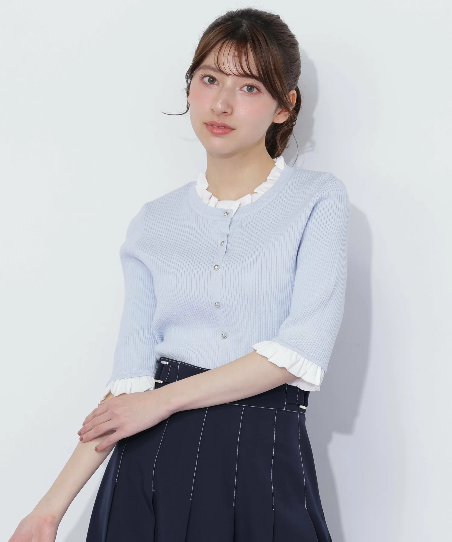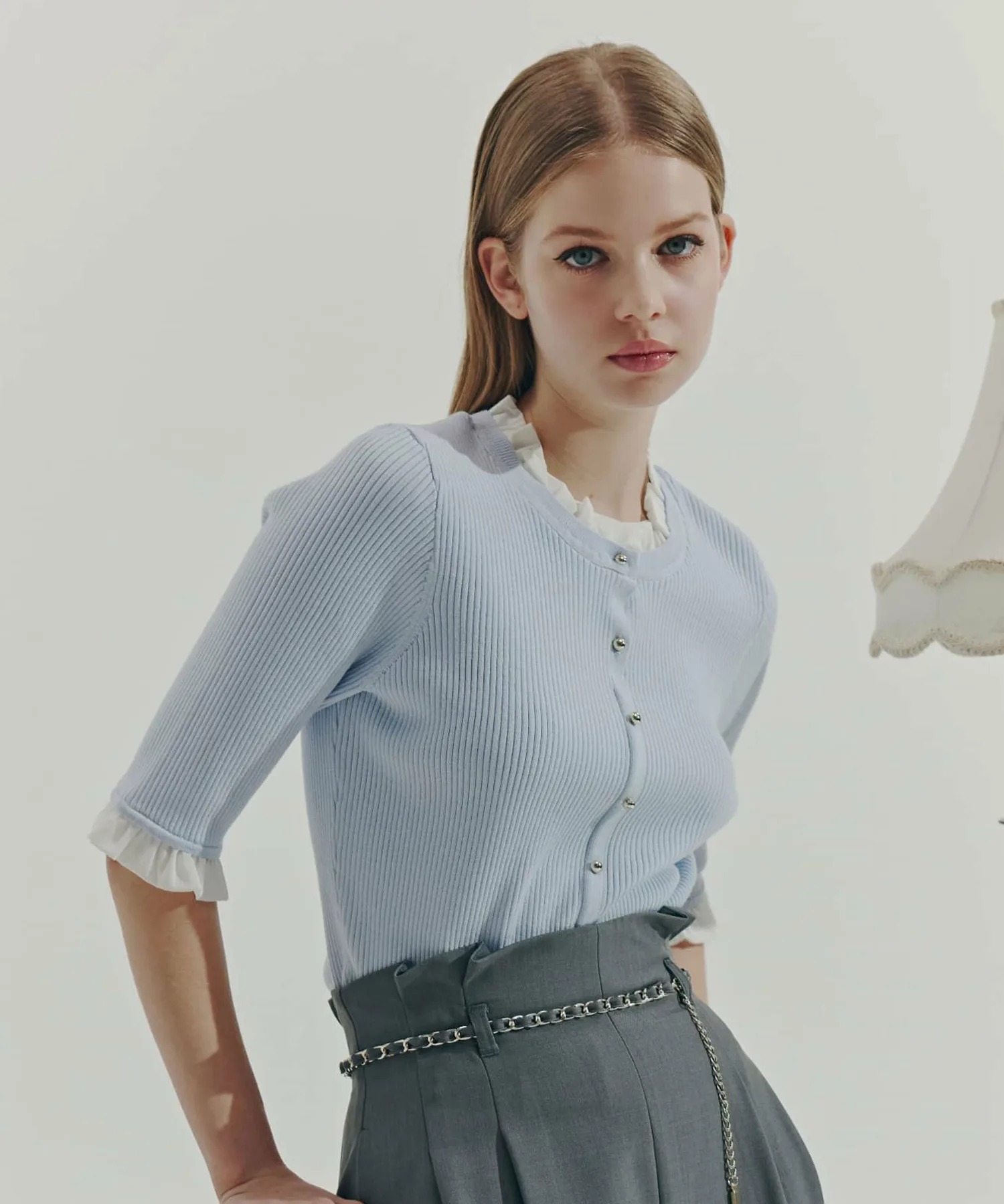 Компактная трикотажная блузка в рубчик, которая выглядит как рубашка с оборками, надетая поверх другой одежды. Изящные оборки на воротнике и манжетах, а также элегантные блестящие золотые пуговицы — главные детали. Планка имитирует воротник, поэтому изнанку не видно через зазоры между пуговицами спереди, и блузку можно носить как самостоятельное изделие.