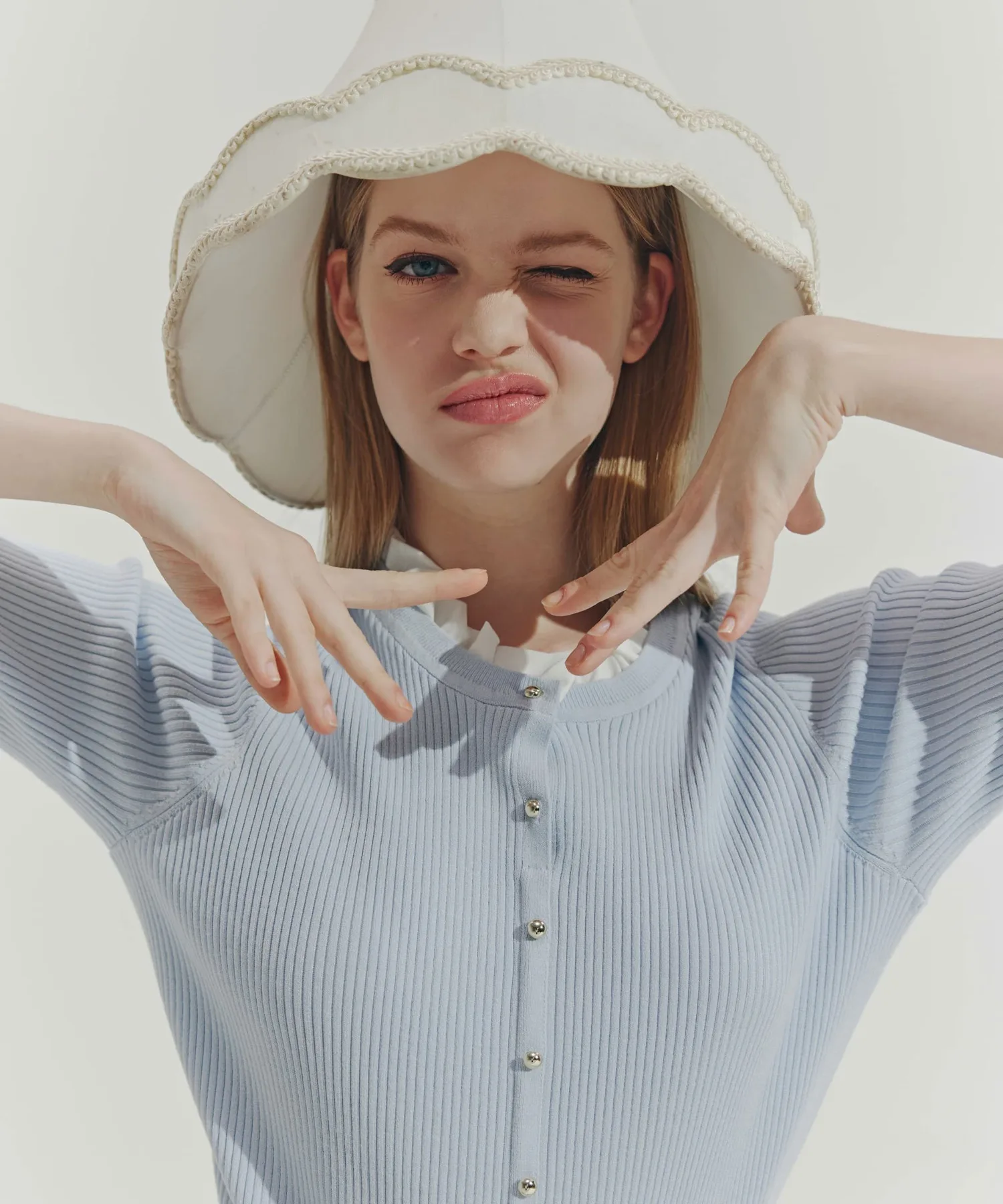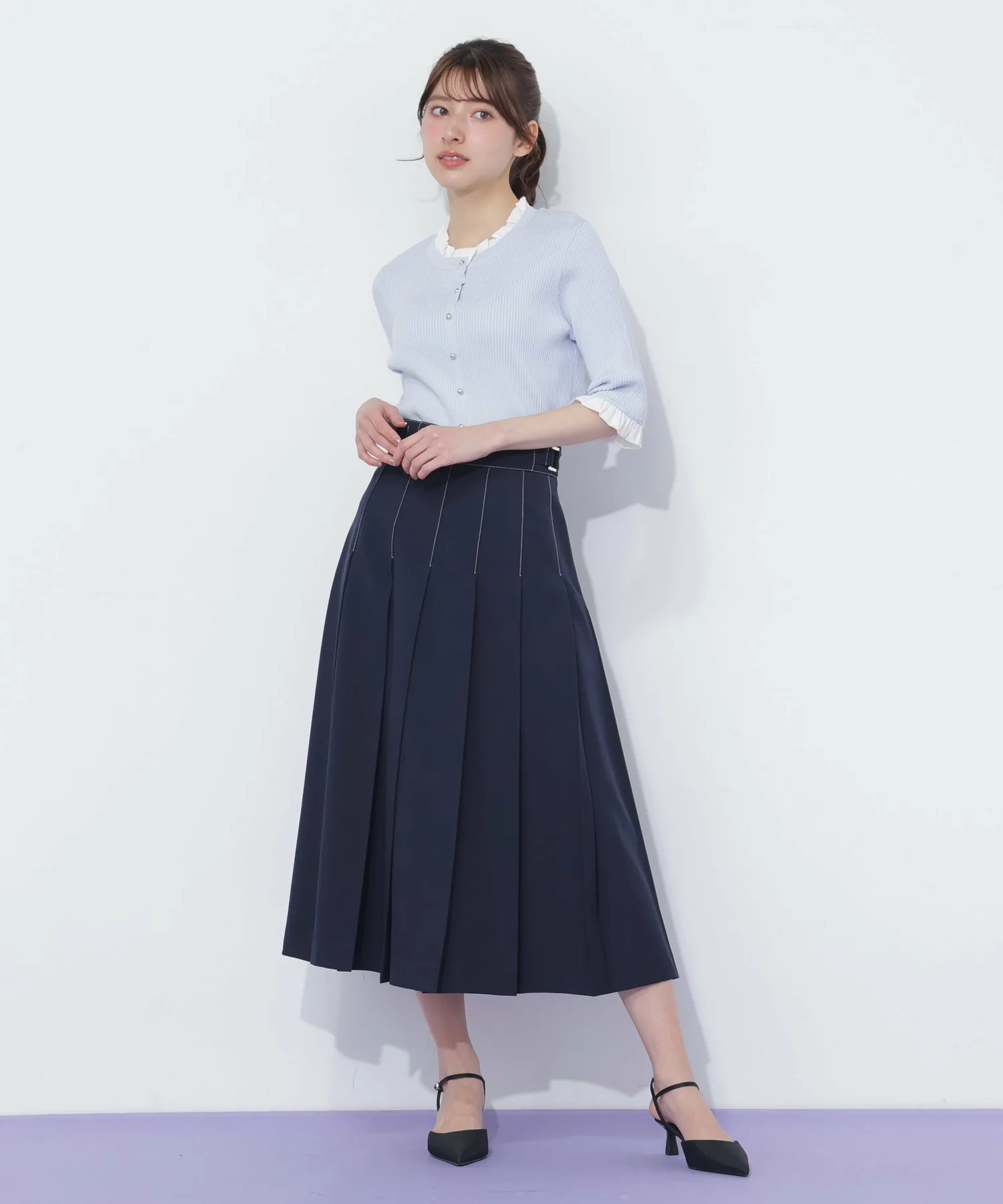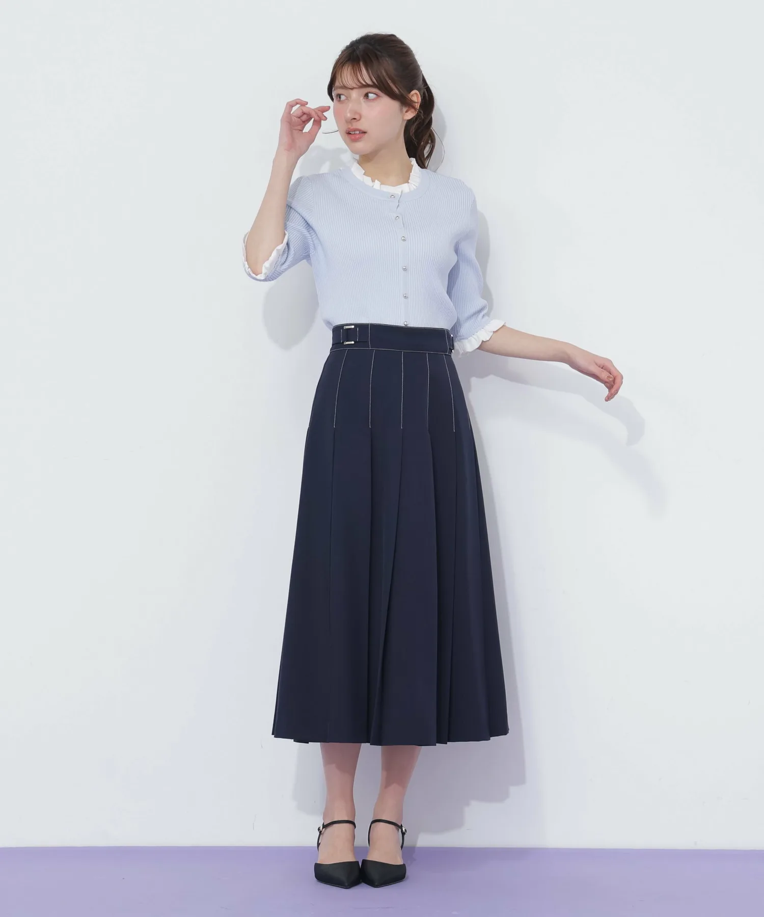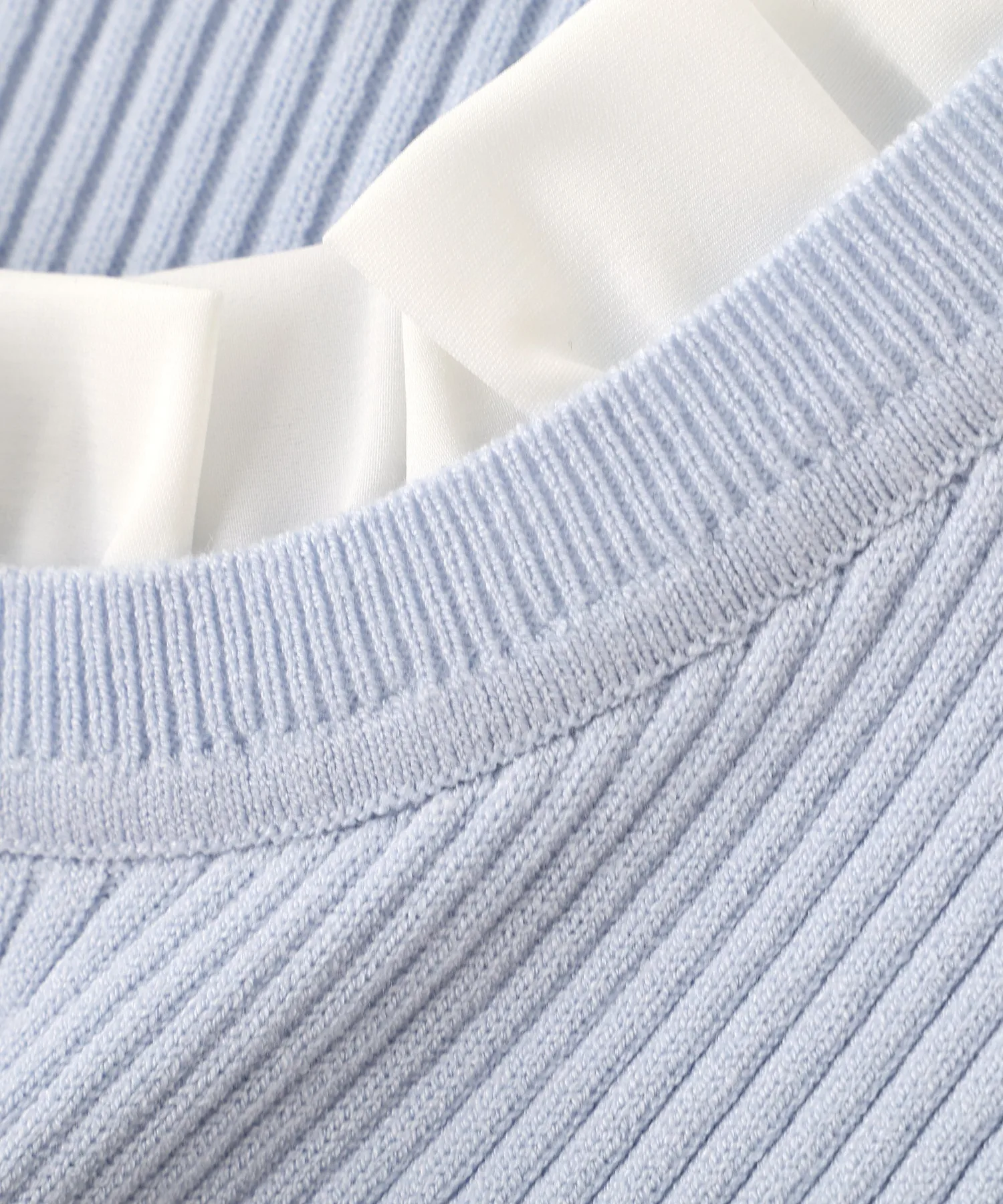 Компактная трикотажная блузка в рубчик, которая выглядит как рубашка с оборками, надетая поверх другой одежды. Изящные оборки на воротнике и манжетах, а также элегантные блестящие золотые пуговицы — главные детали. Планка имитирует воротник, поэтому изнанку не видно через зазоры между пуговицами спереди, и блузку можно носить как самостоятельное изделие.