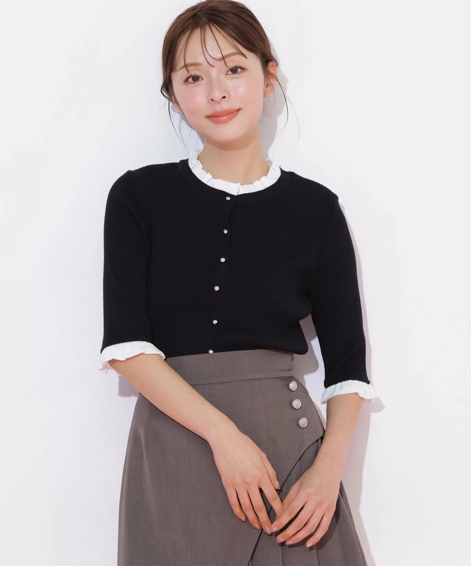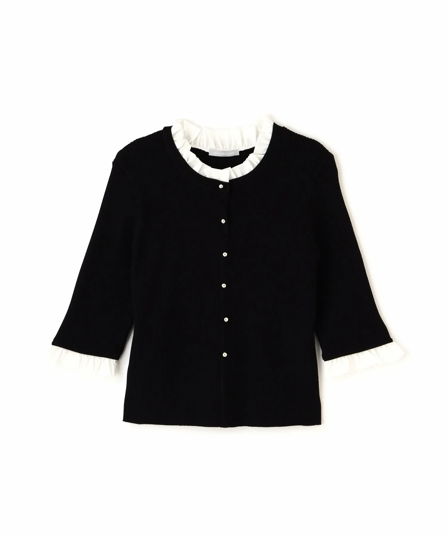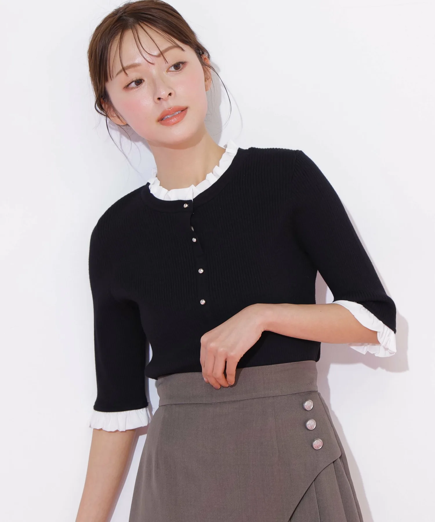 Компактная трикотажная блузка в рубчик, которая выглядит как рубашка с оборками, надетая поверх другой одежды. Изящные оборки на воротнике и манжетах, а также элегантные блестящие золотые пуговицы — главные детали. Планка имитирует воротник, поэтому изнанку не видно через зазоры между пуговицами спереди, и блузку можно носить как самостоятельное изделие.