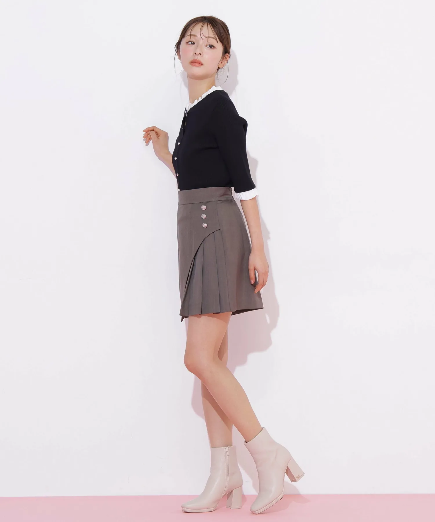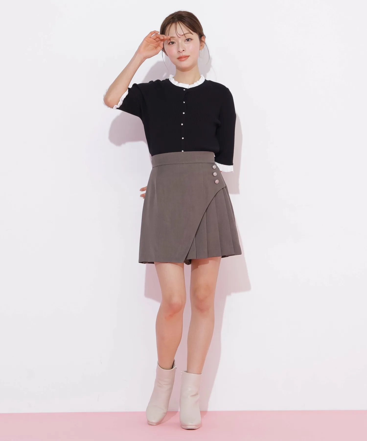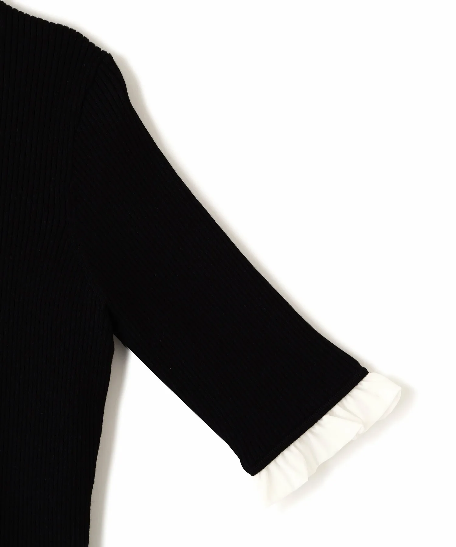 Компактная трикотажная блузка в рубчик, которая выглядит как рубашка с оборками, надетая поверх другой одежды. Изящные оборки на воротнике и манжетах, а также элегантные блестящие золотые пуговицы — главные детали. Планка имитирует воротник, поэтому изнанку не видно через зазоры между пуговицами спереди, и блузку можно носить как самостоятельное изделие.