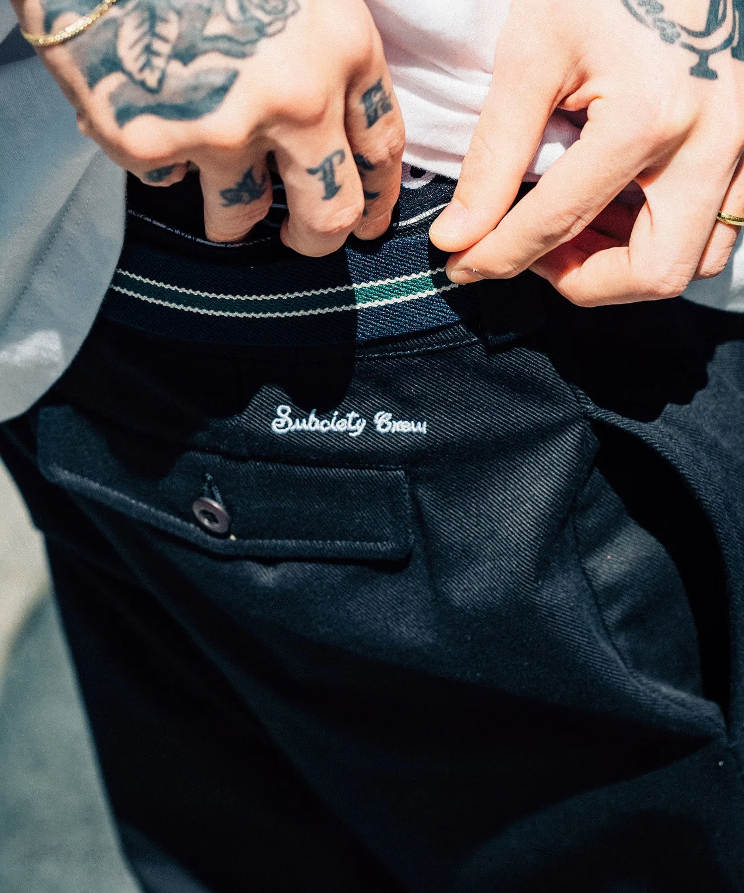 Задняя часть пояса выполнена из ткани кремового цвета с оригинальным серым узором «пейсли», а над боковым карманом курсивом вышита надпись «Subcietycrew».
