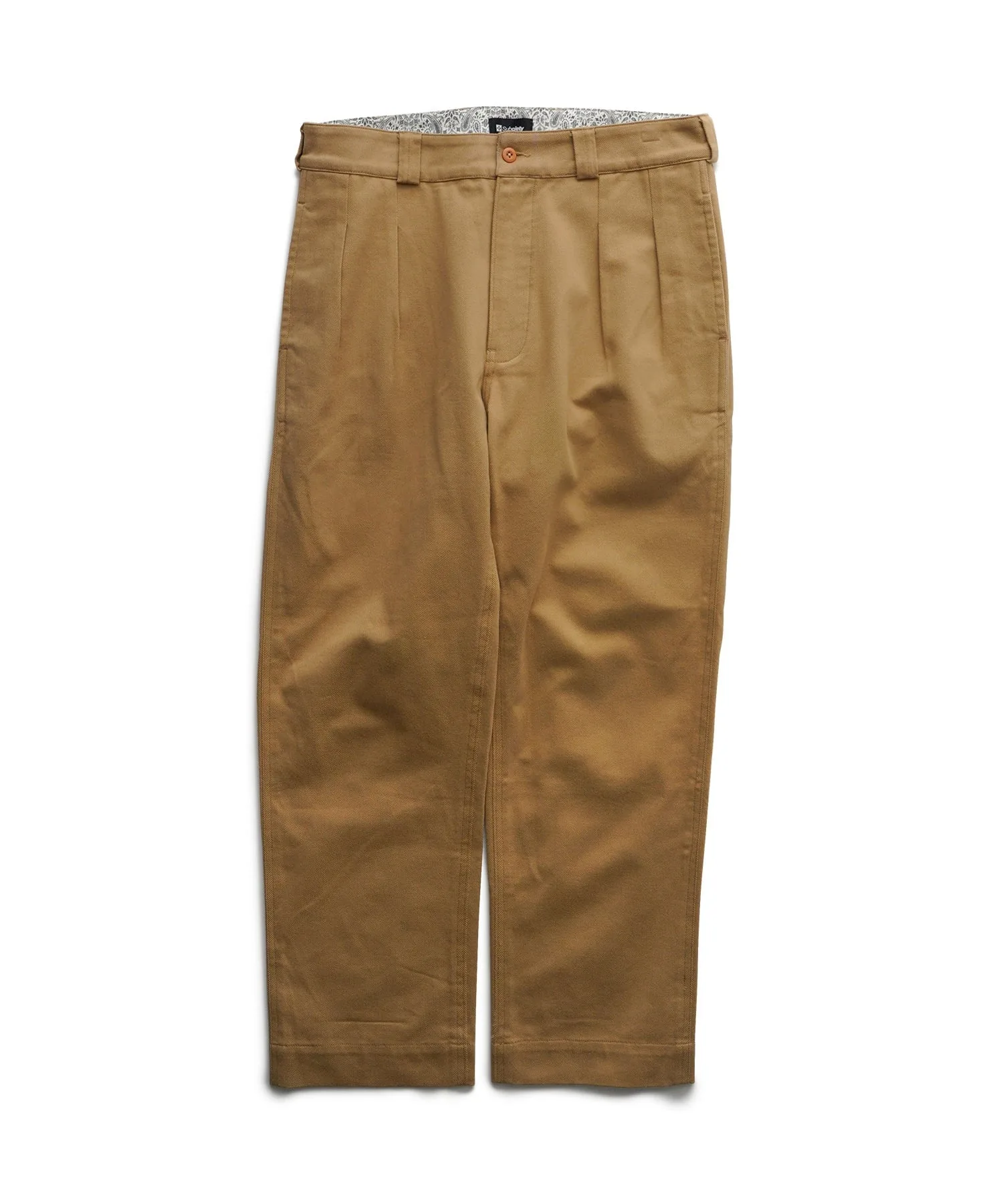 Задняя часть пояса выполнена из ткани кремового цвета с оригинальным серым узором «пейсли», а над боковым карманом курсивом вышита надпись «Subcietycrew».