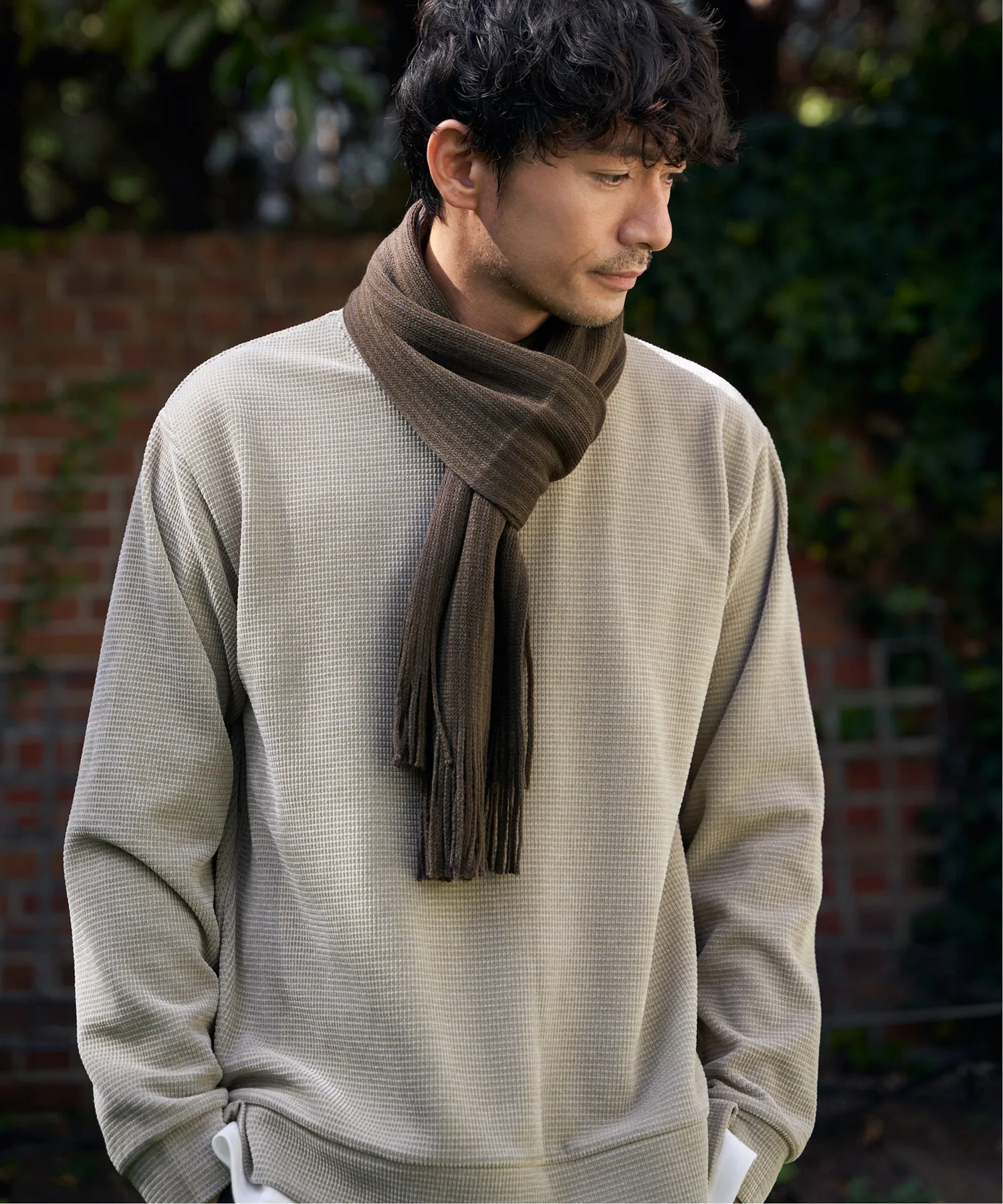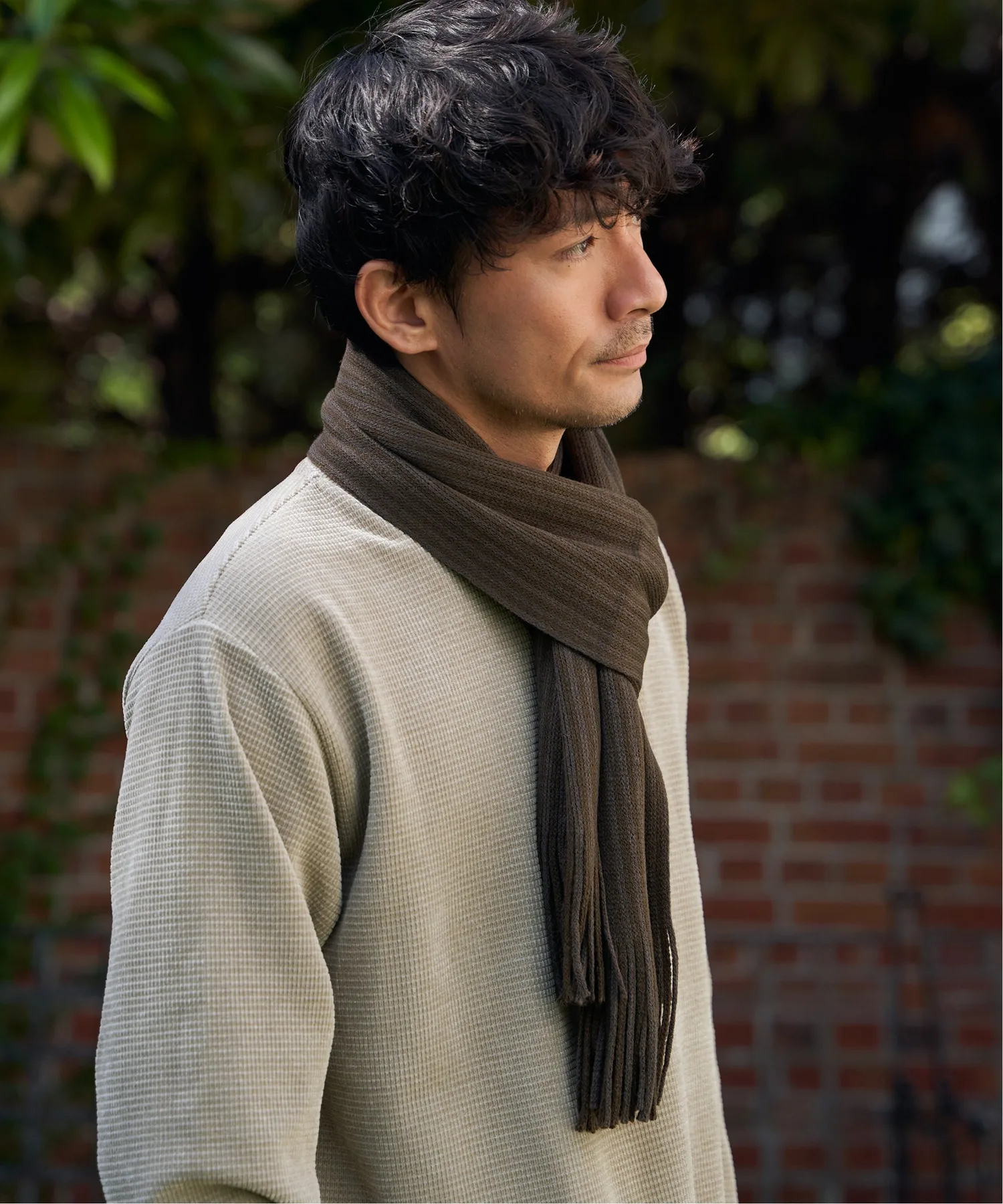 Этот шарф отличается элегантным эффектом тени, созданным полосатым узором, выраженным через трехмерное плетение.
