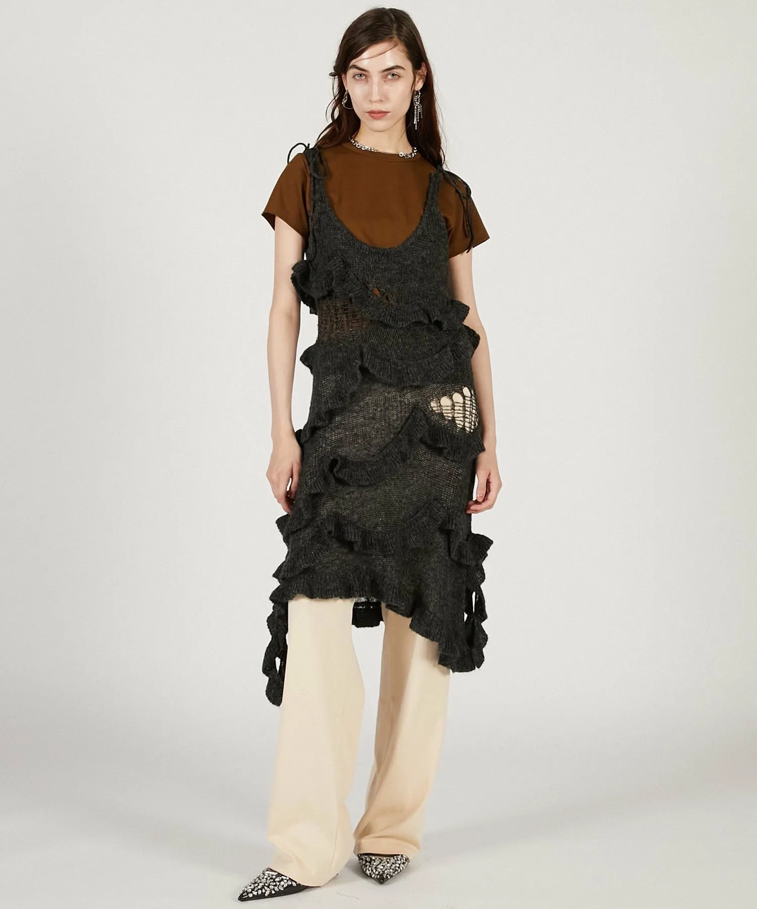 Эффектное платье-комбинация, сочетающее в себе контрастные элементы: мягкость мохерового материала и эффект состаривания.
