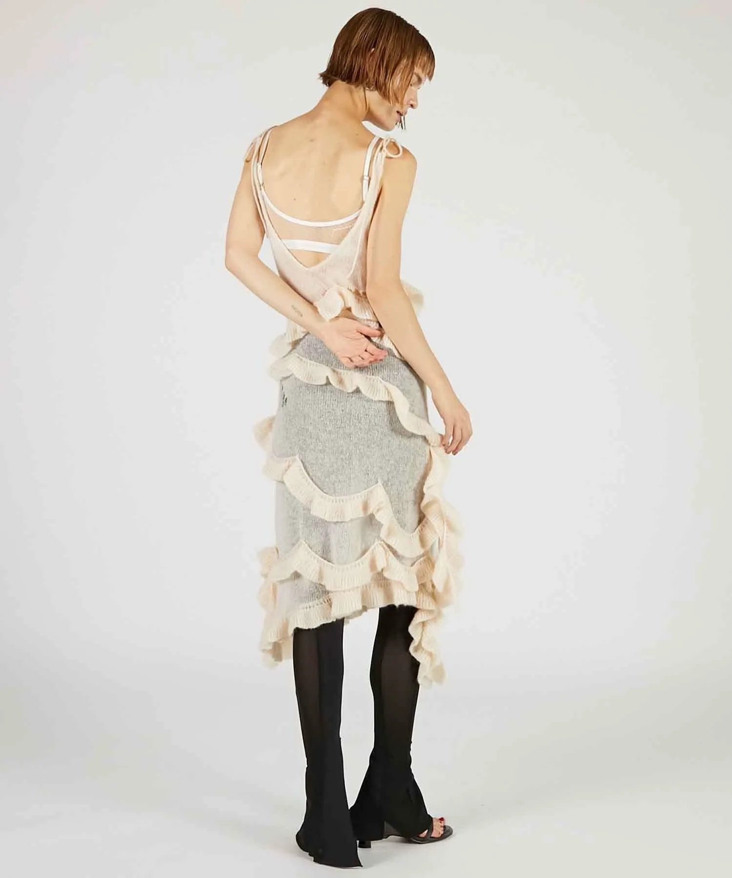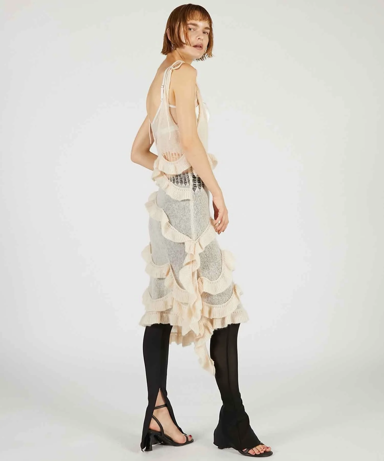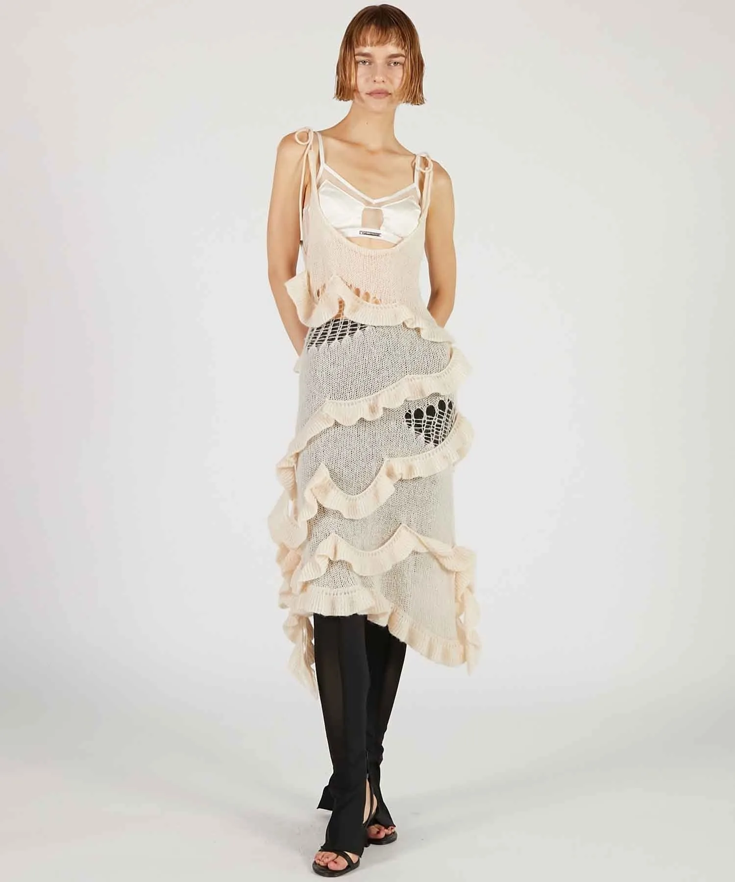 Главная особенность — щедрая оборка из той же пряжи, обвивающая все тело.