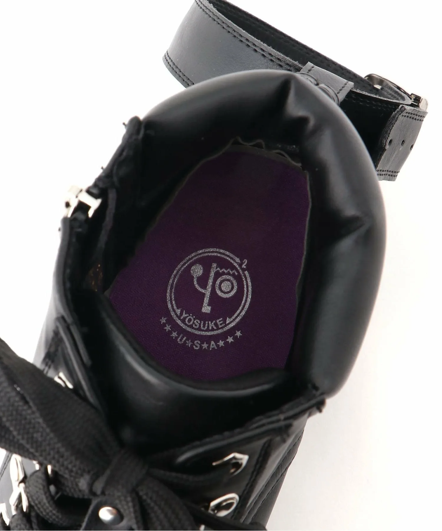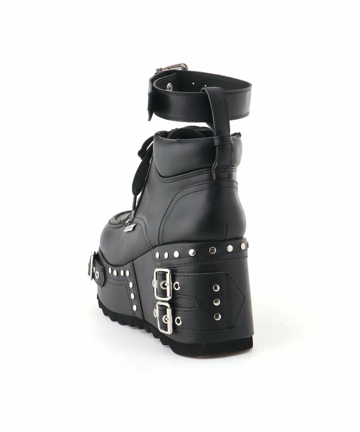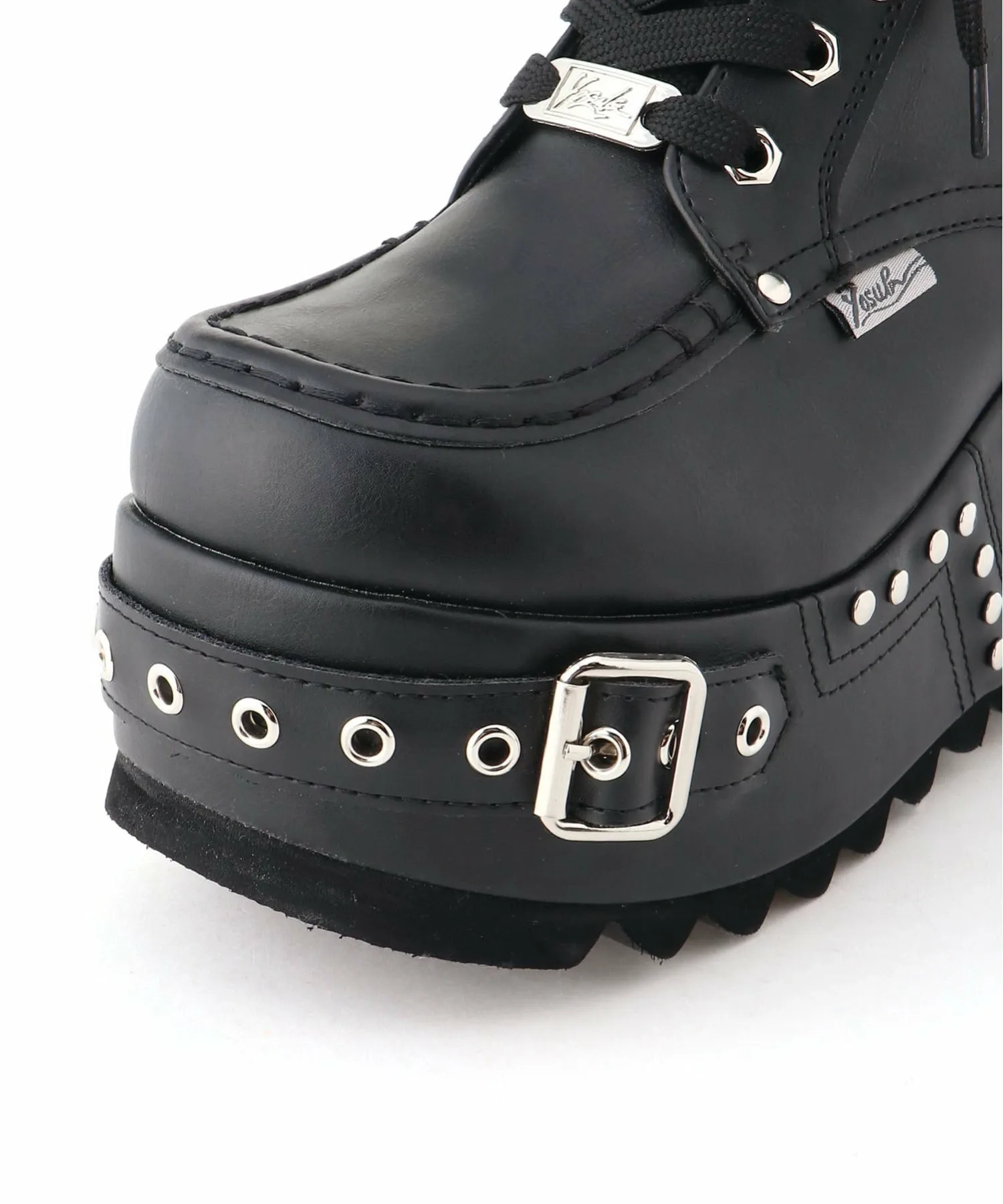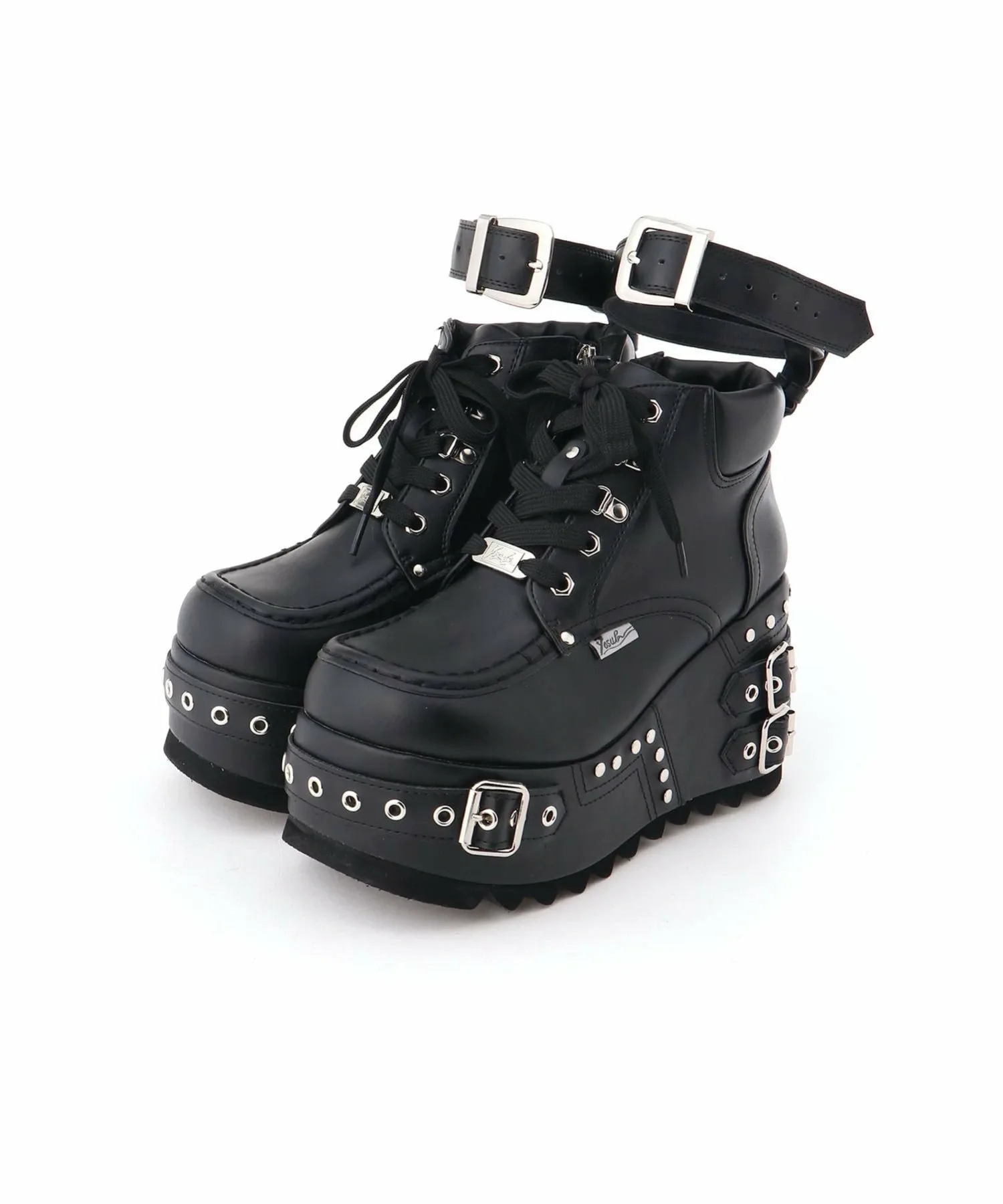 Эти ботинки на платформе выполнены в типичном для YOSUKE дизайне с немного грубыми линиями, украшены ремешками и металлическими элементами вокруг подошвы.