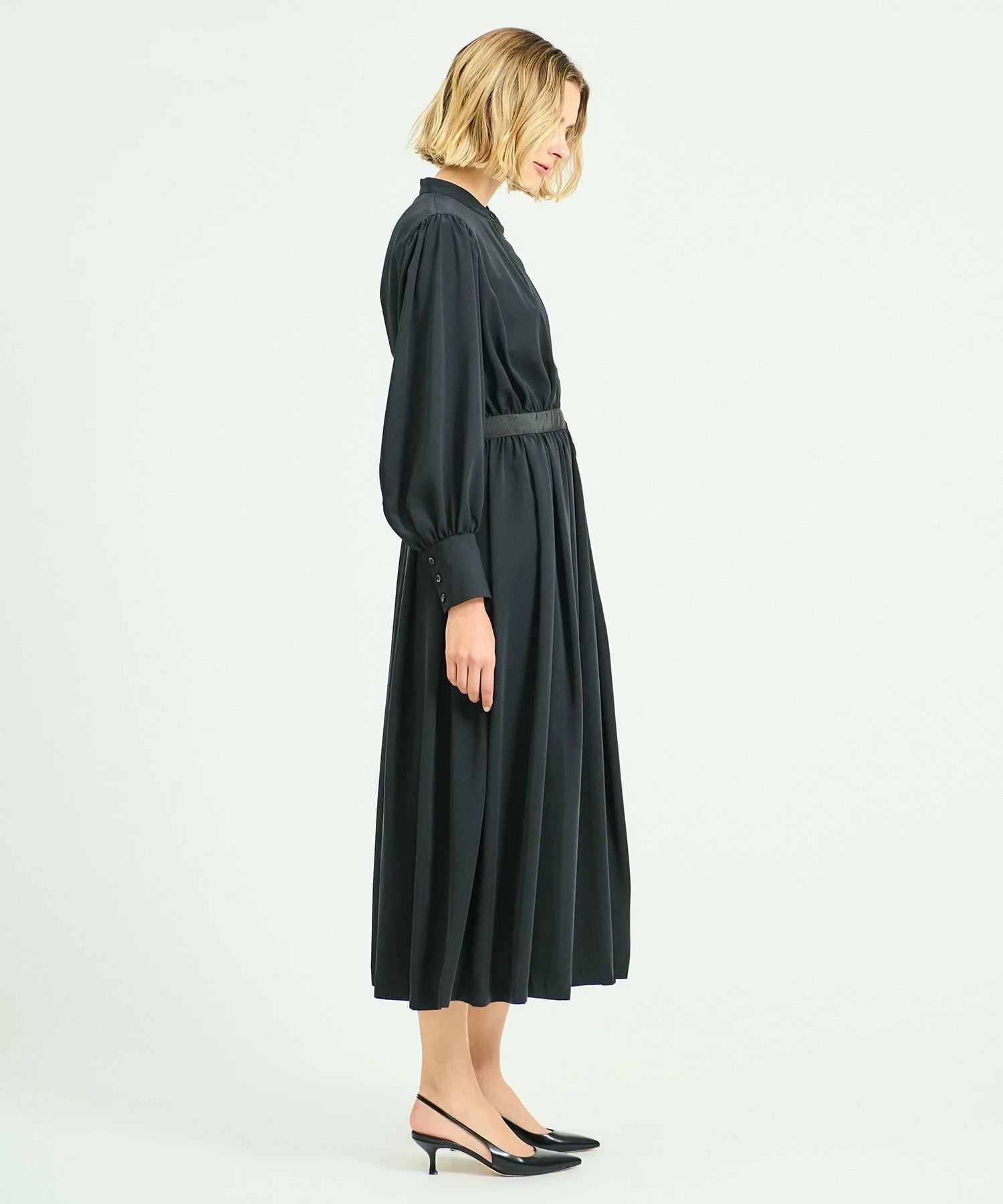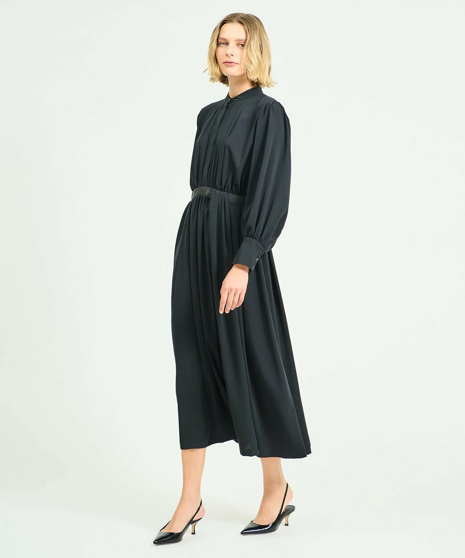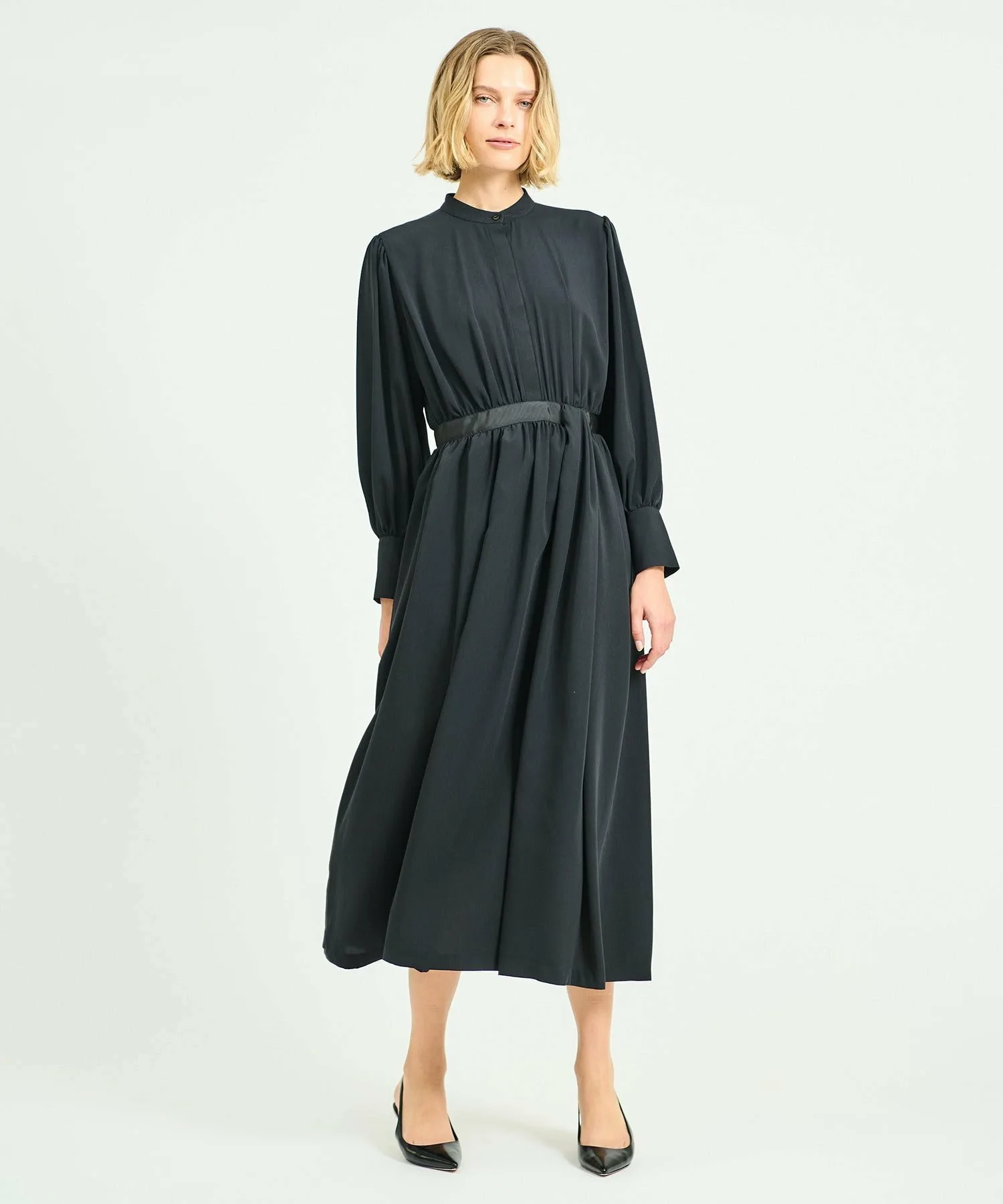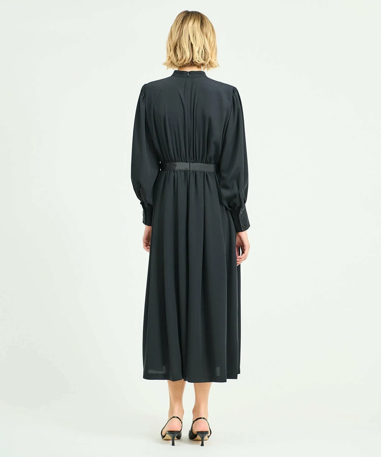 Платье, выполненное в стиле рубашки с воротником Мао, сочетает в себе расклешенную юбку со складками. Декоративные ленты на спинке воротника и на талии.