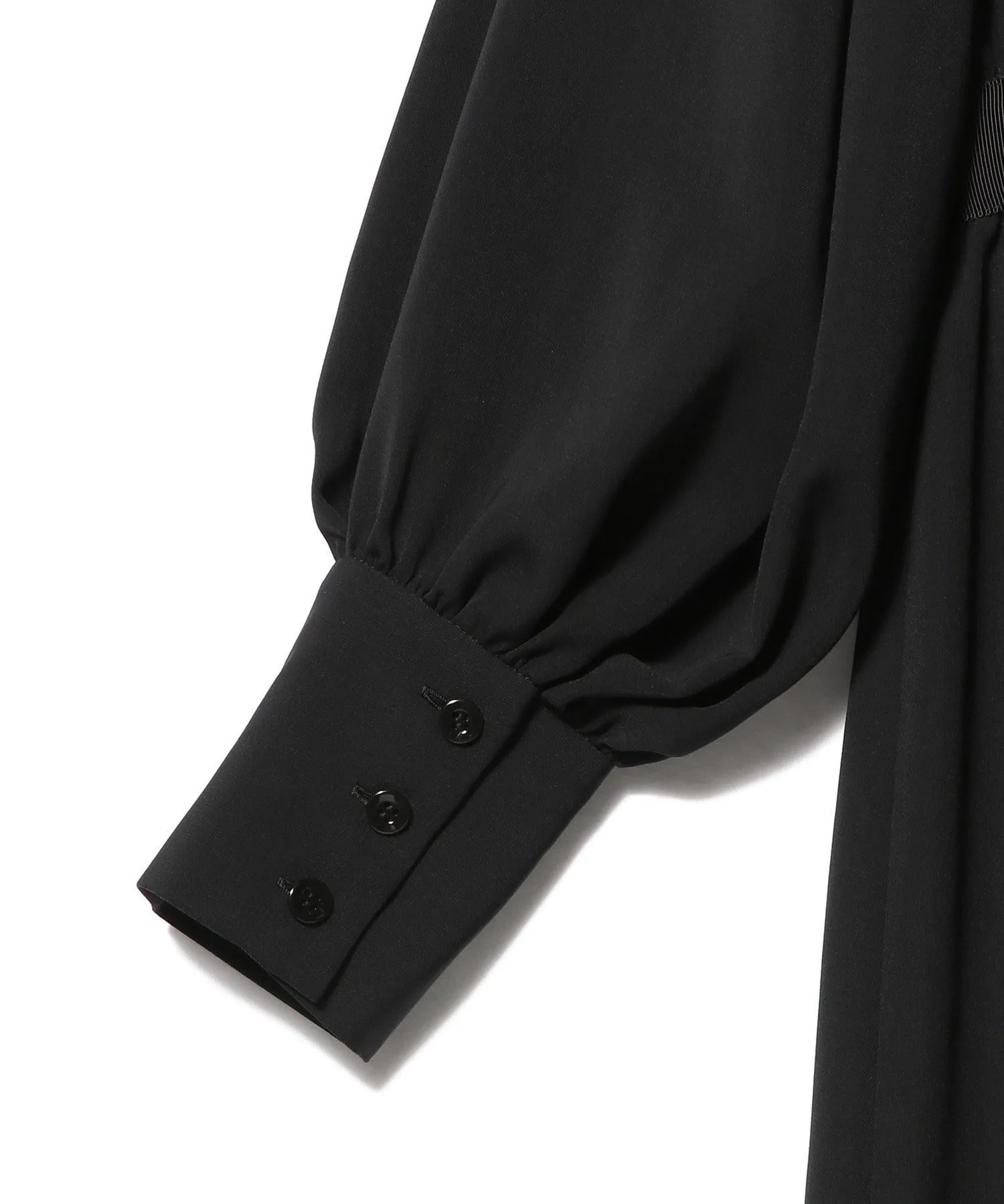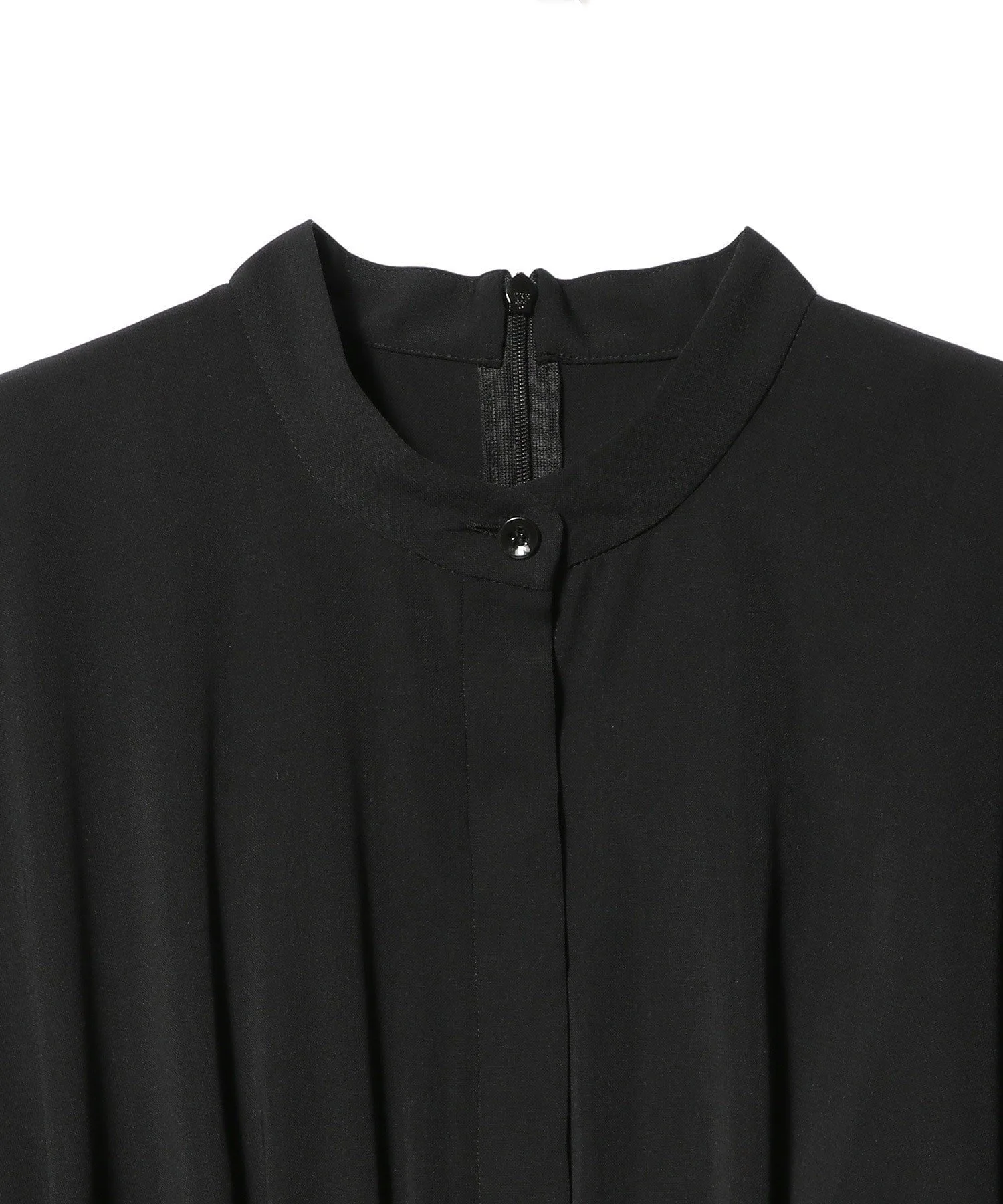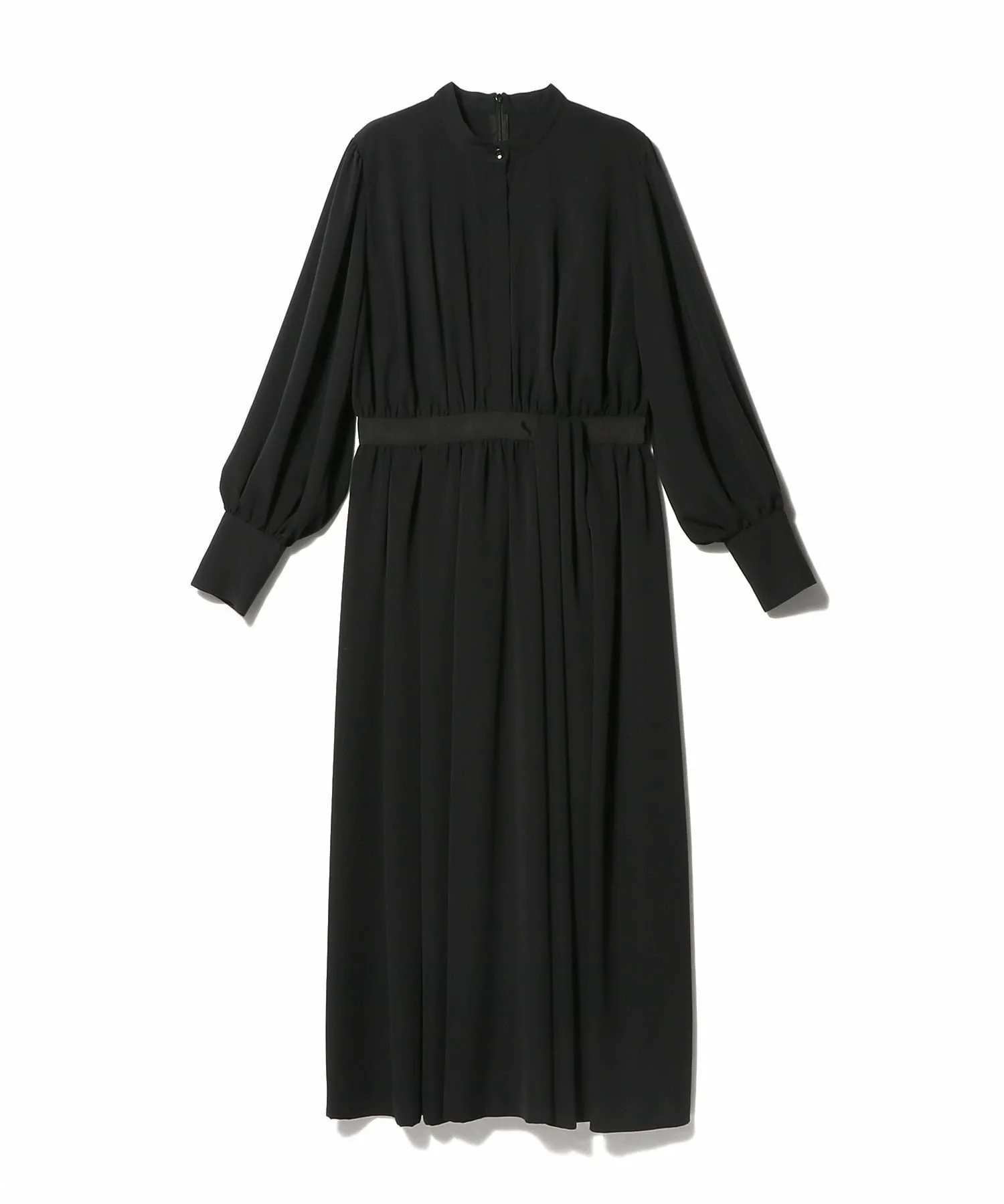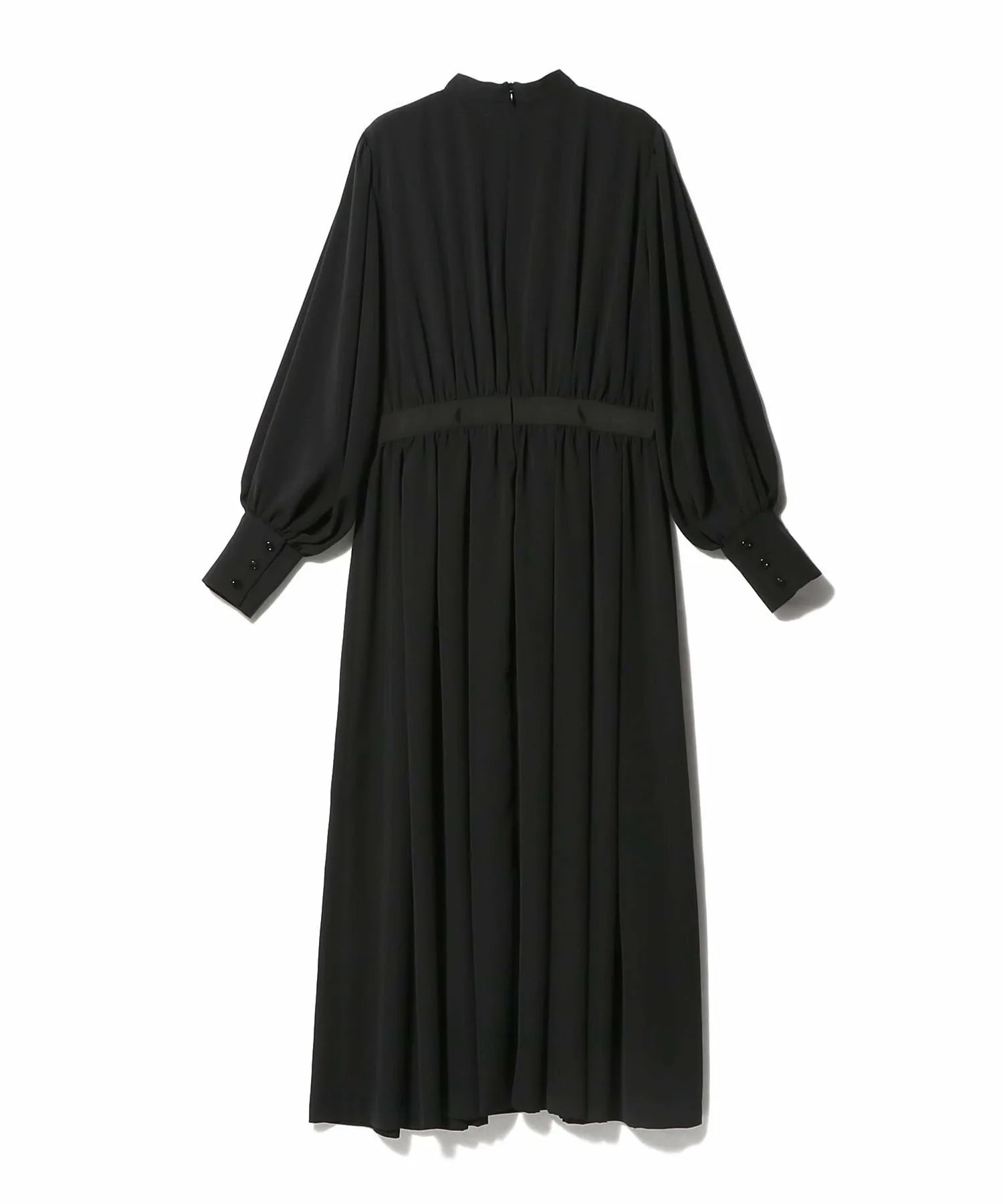 Платье, выполненное в стиле рубашки с воротником Мао, сочетает в себе расклешенную юбку со складками. Декоративные ленты на спинке воротника и на талии.