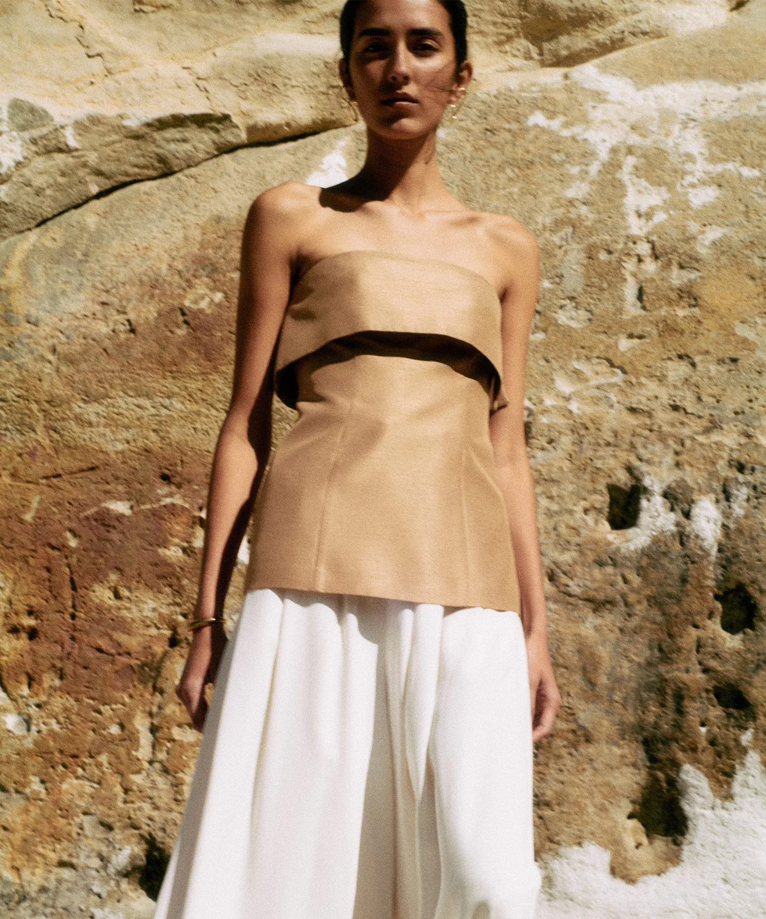 Элегантный блеск триацетатного шантунга создает простое, но изысканное впечатление.