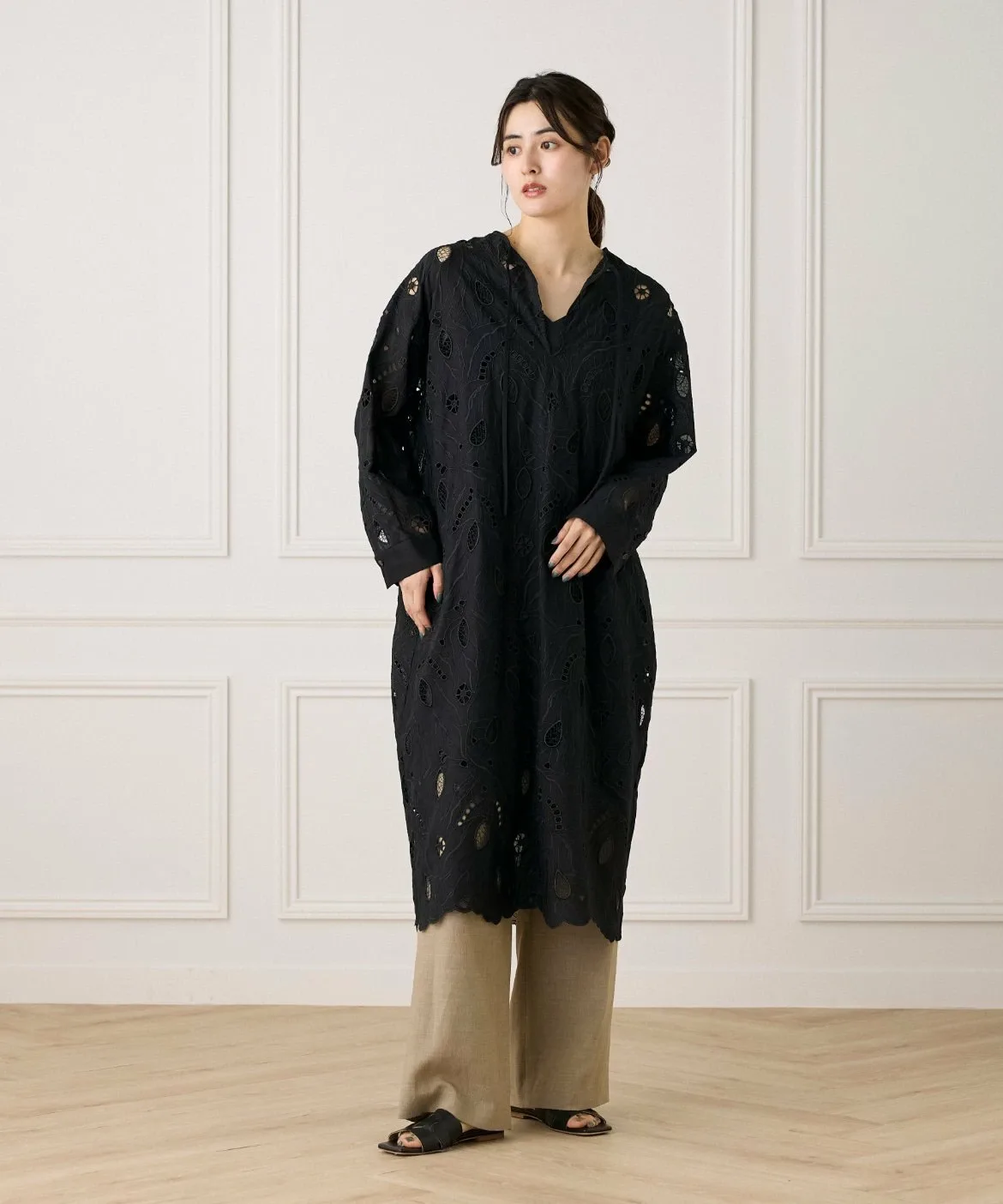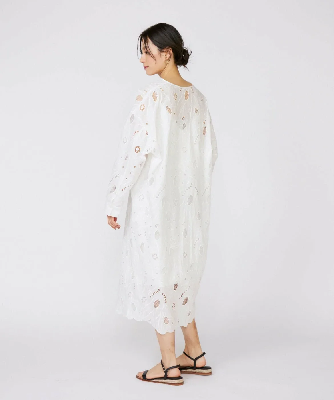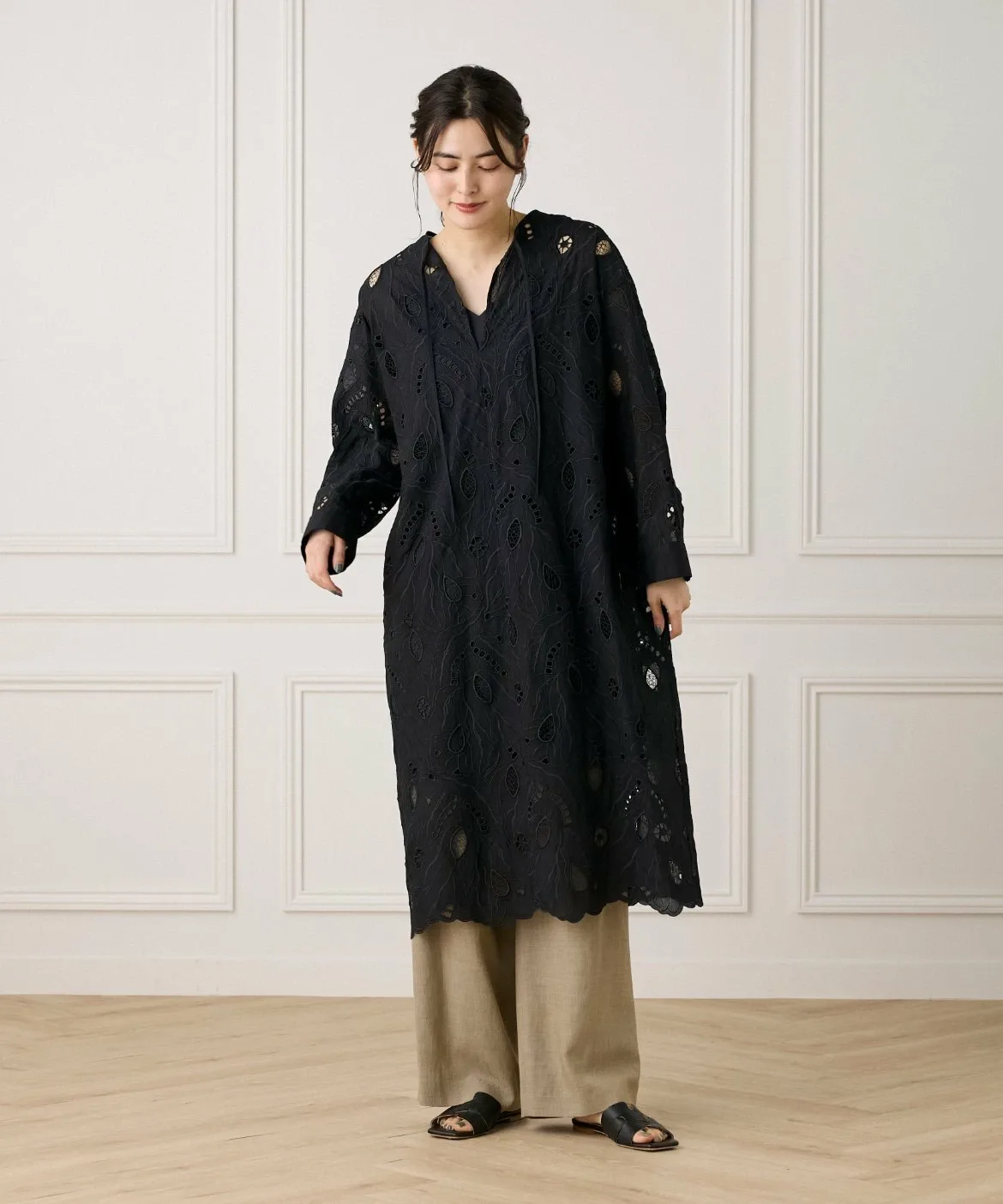 Это платье-кафтан отличается оригинальной вышитой кружевной отделкой и манжетами в стиле рубашки, что позволяет избежать слишком повседневного вида. Рекомендуется сочетать его с широкими брюками для создания изысканного образа, но его также можно носить поверх купальника на курорте. Это универсальная и элегантная вещь для взрослых.