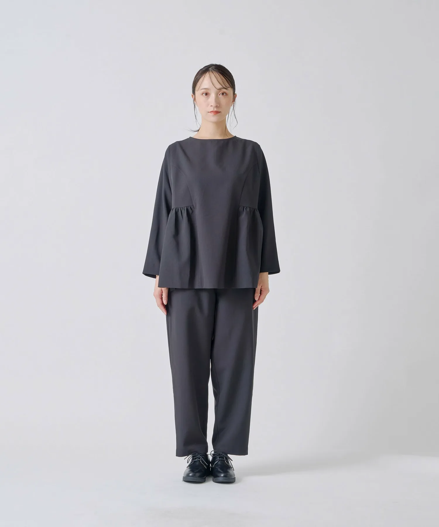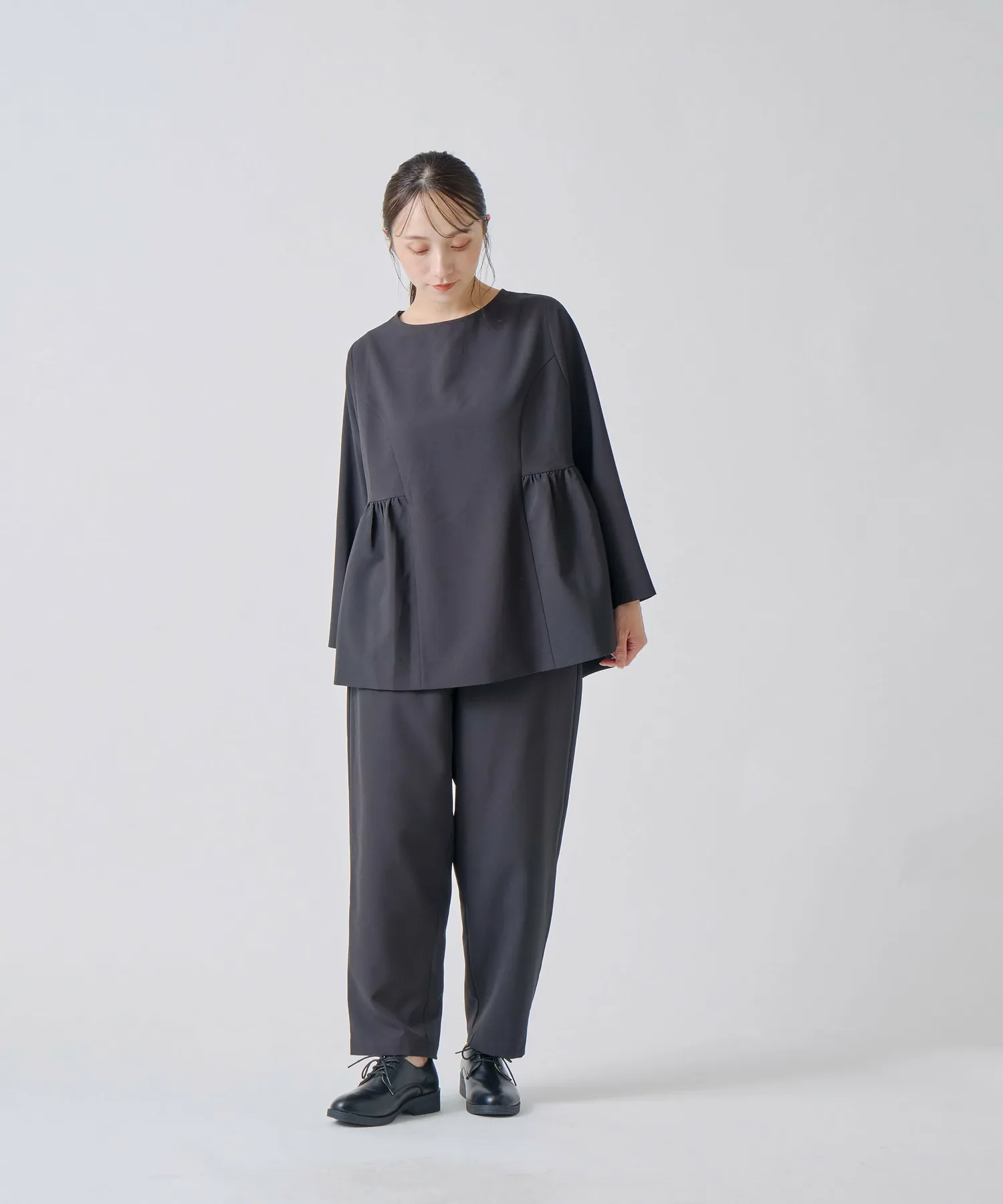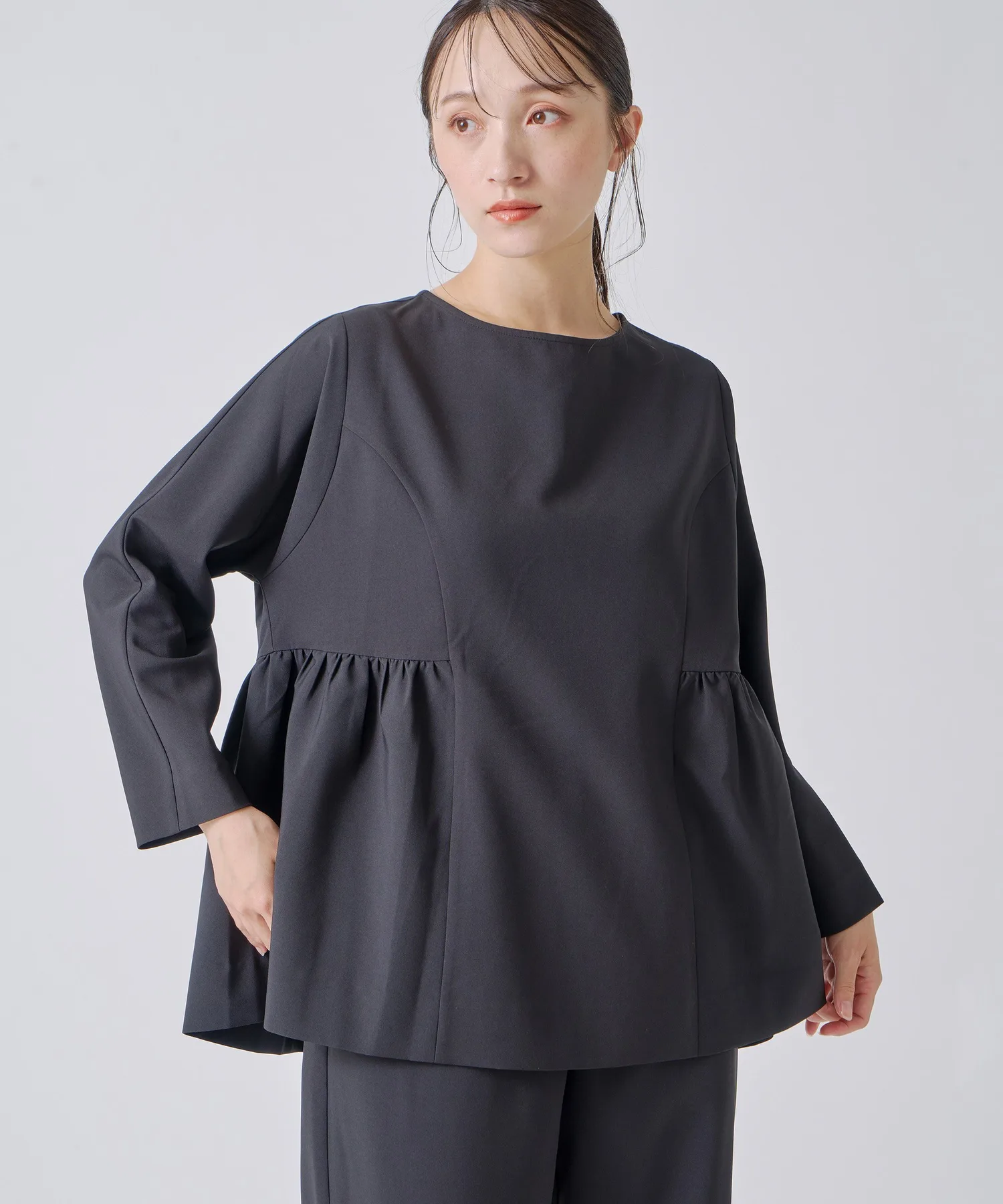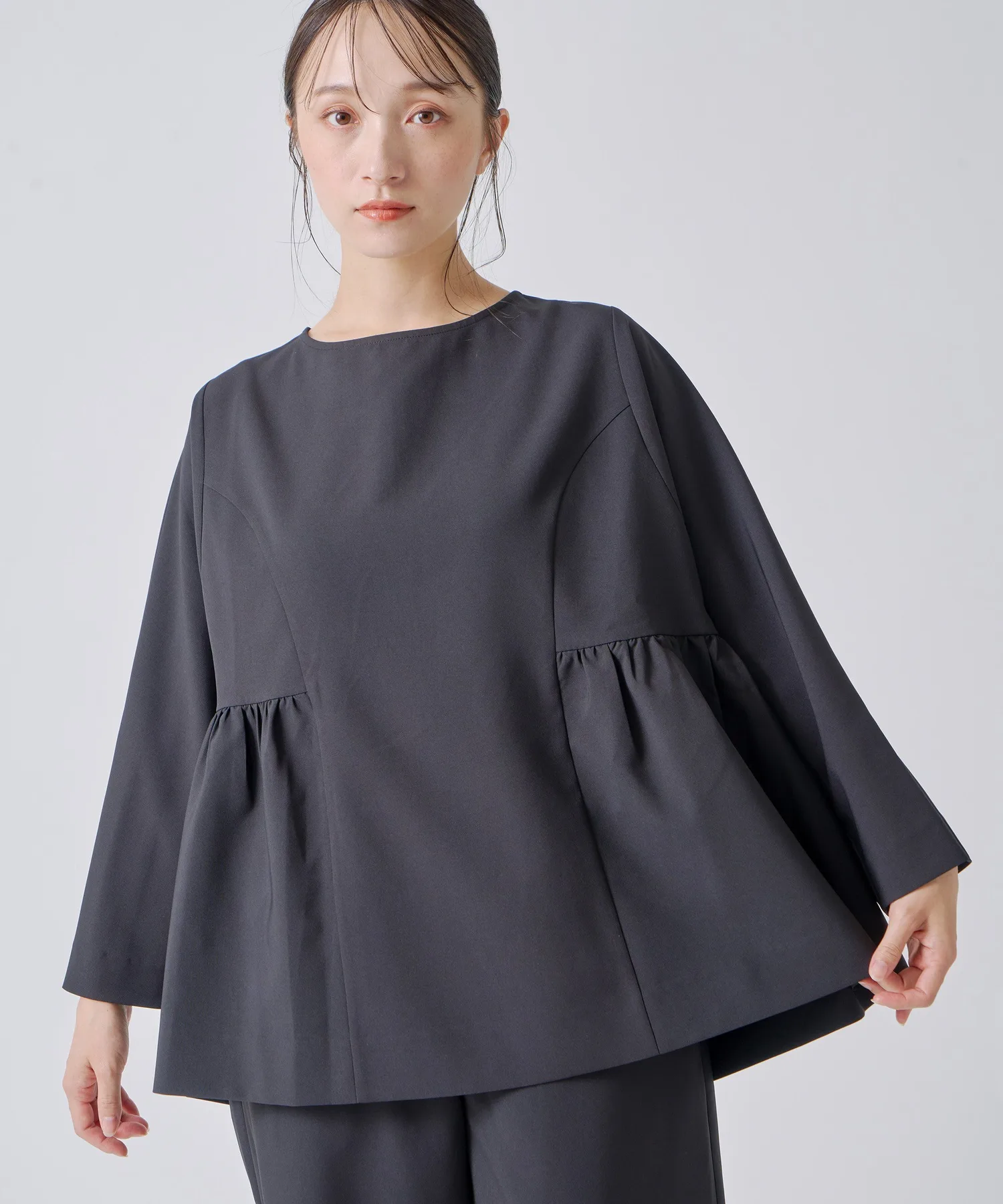 Изделие сочетает в себе простую элегантность с круглым вырезом и женственность благодаря сборкам на талии.