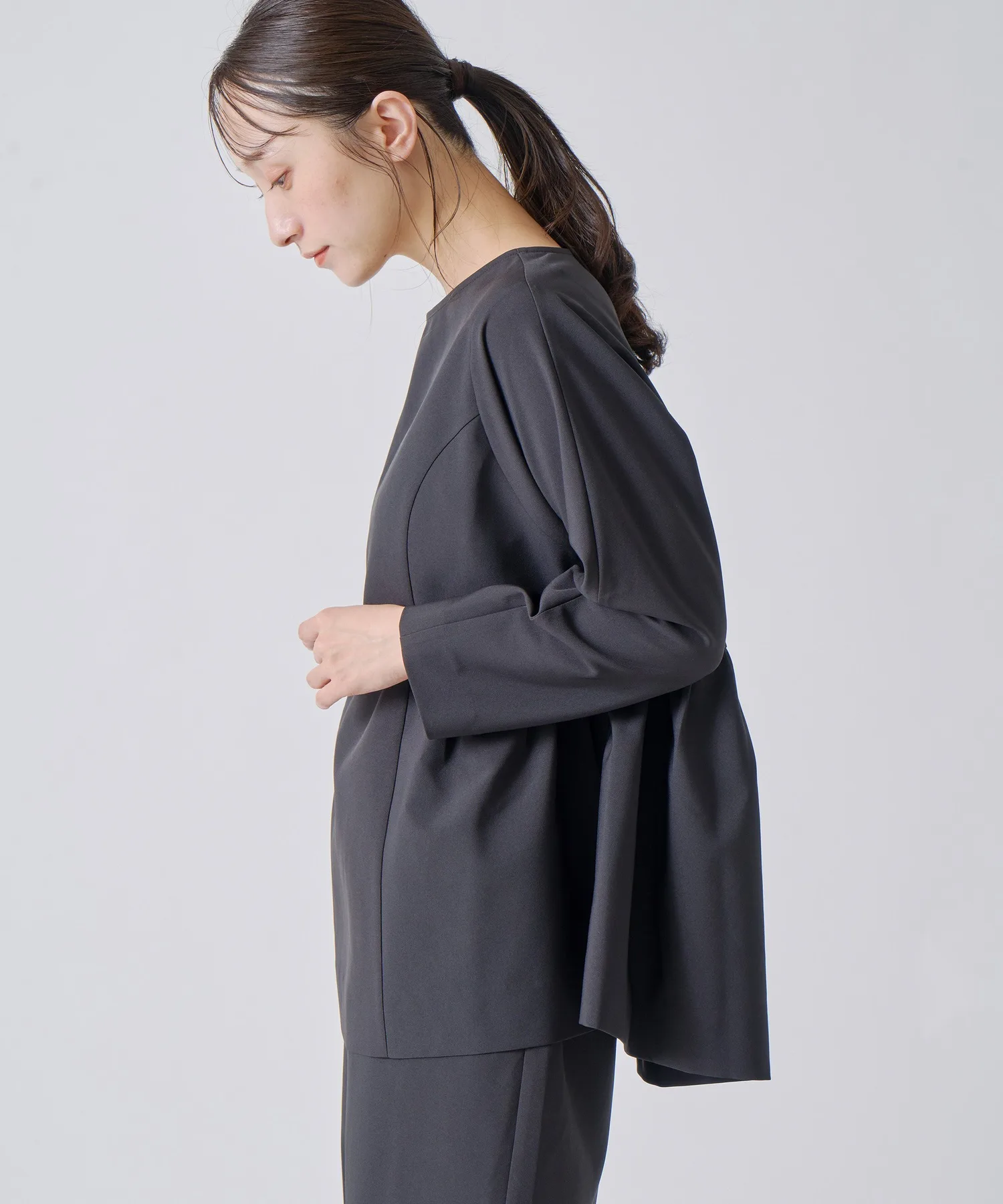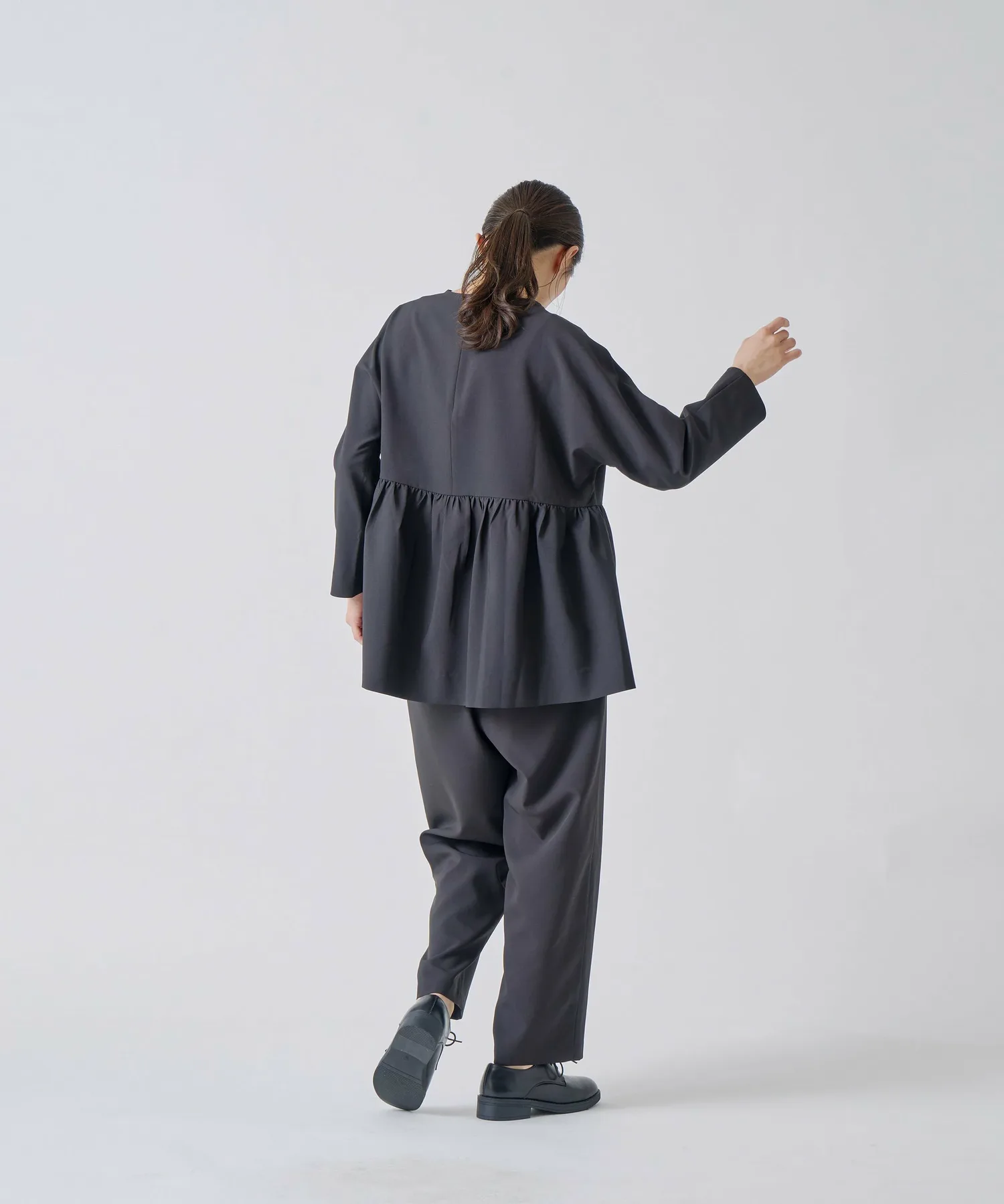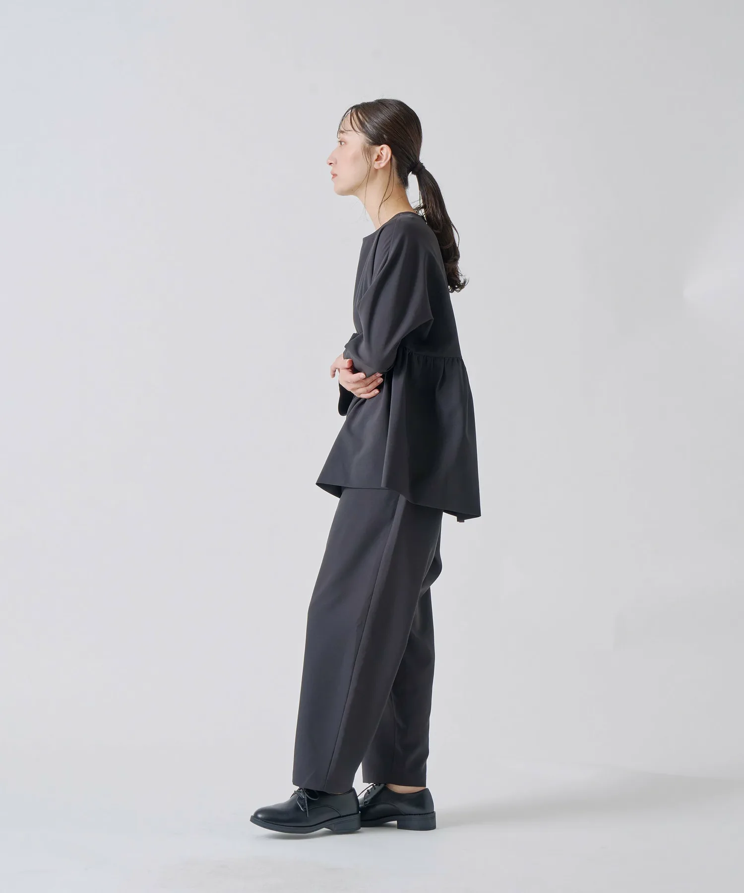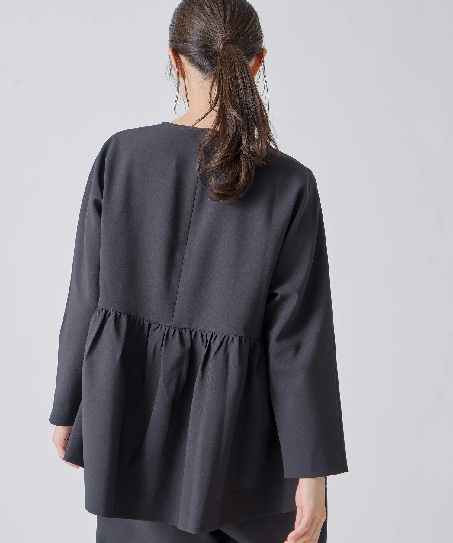 Изделие сочетает в себе простую элегантность с круглым вырезом и женственность благодаря сборкам на талии.