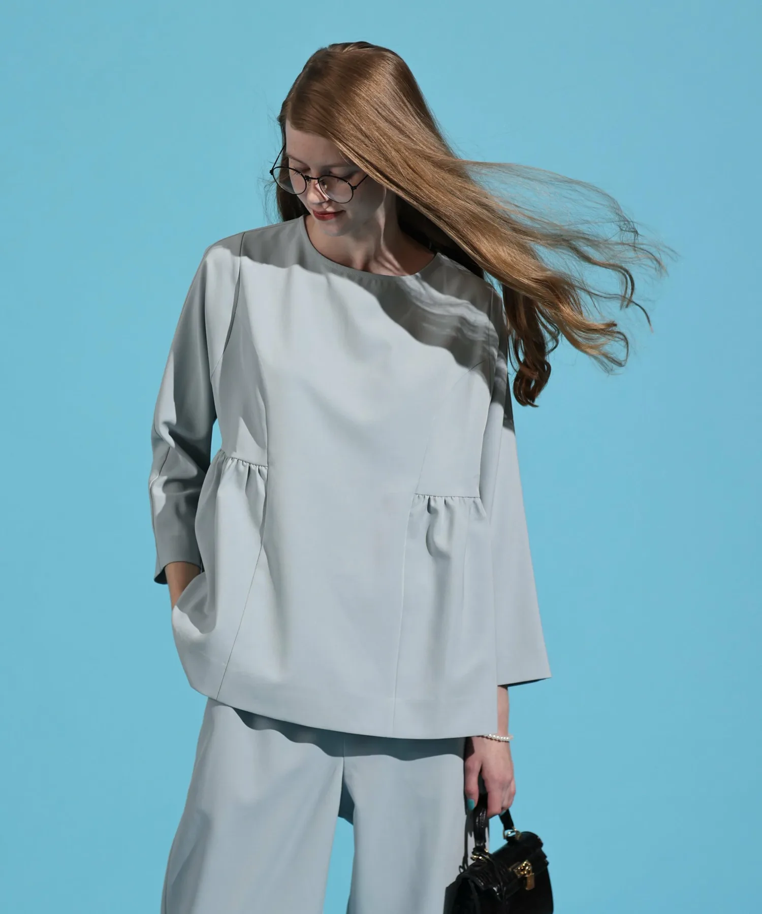 Изделие сочетает в себе простую элегантность с круглым вырезом и женственность благодаря сборкам на талии.