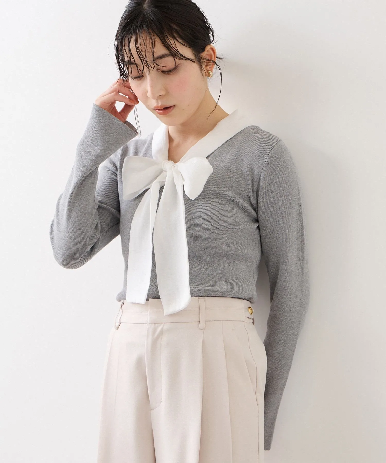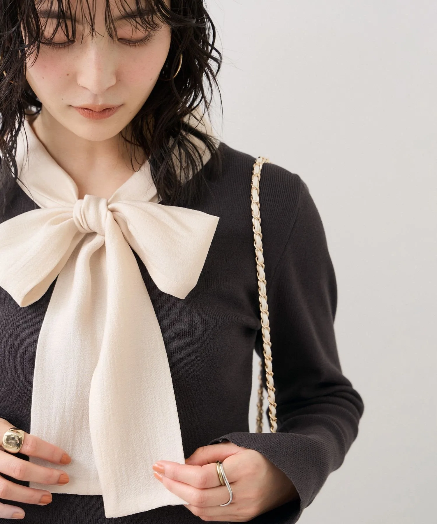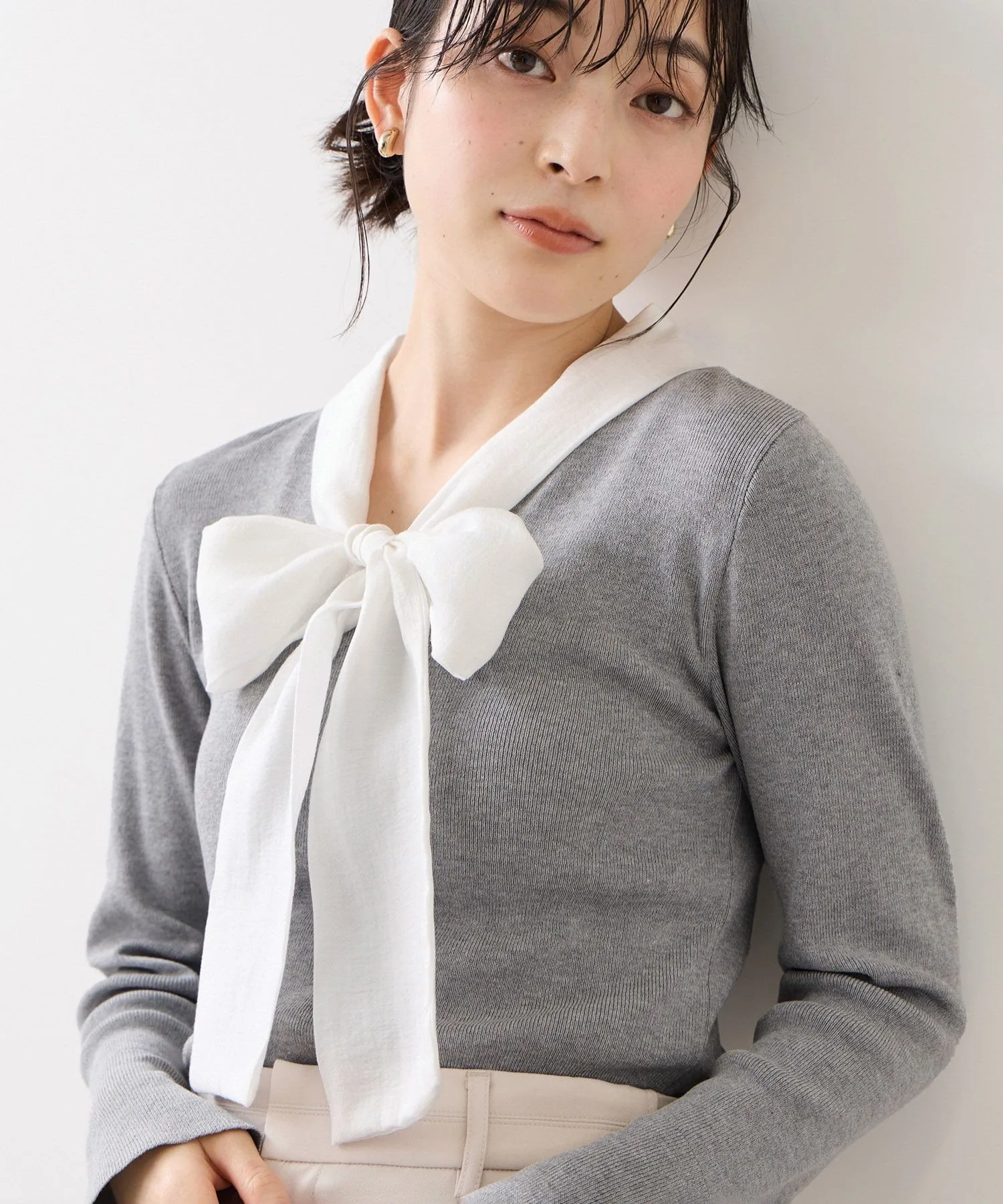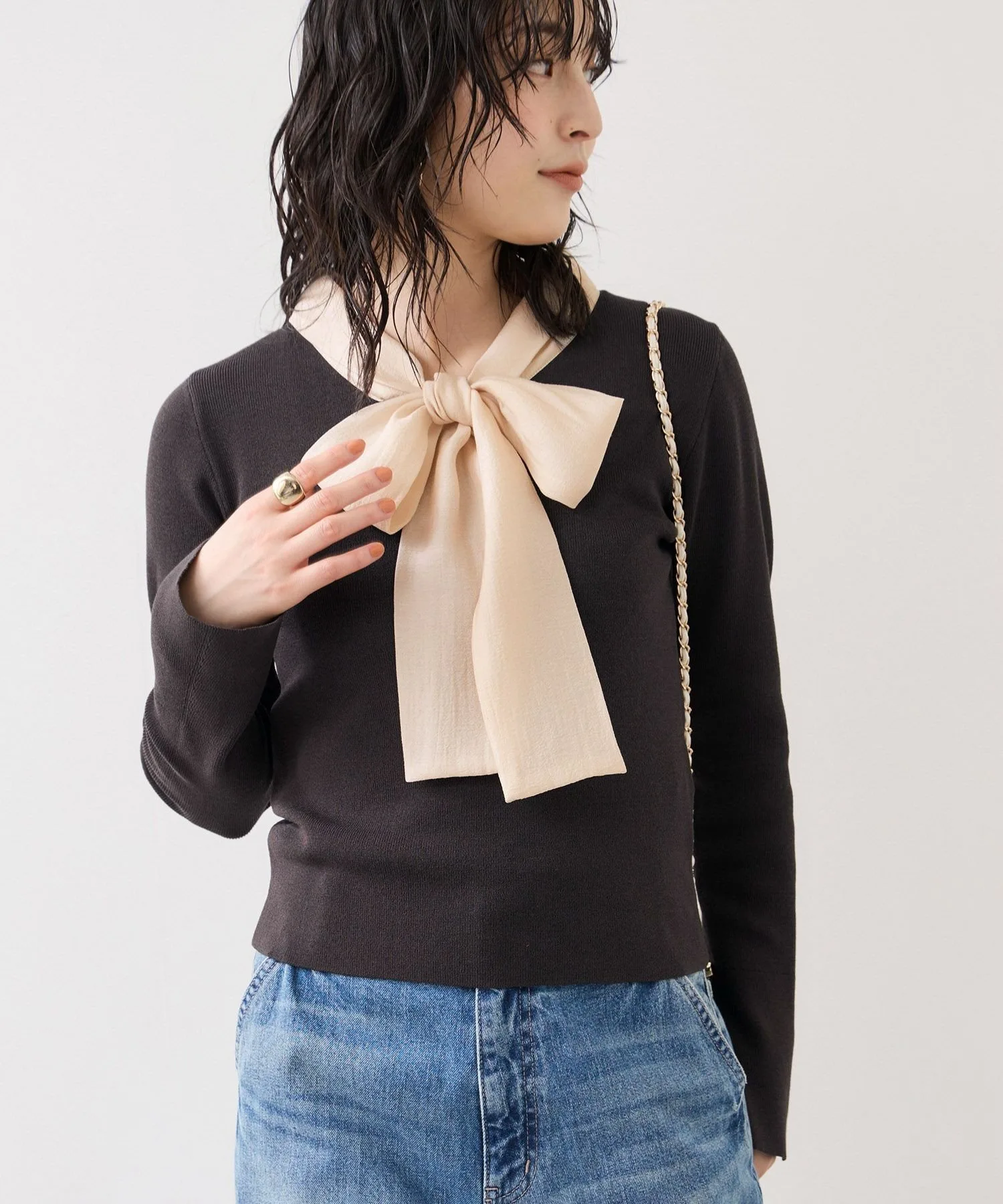 Великолепный вязаный пуловер с бантом из ленты, который можно носить как самостоятельно, так и под верхней одеждой. [Весна 2026] [26SS]
