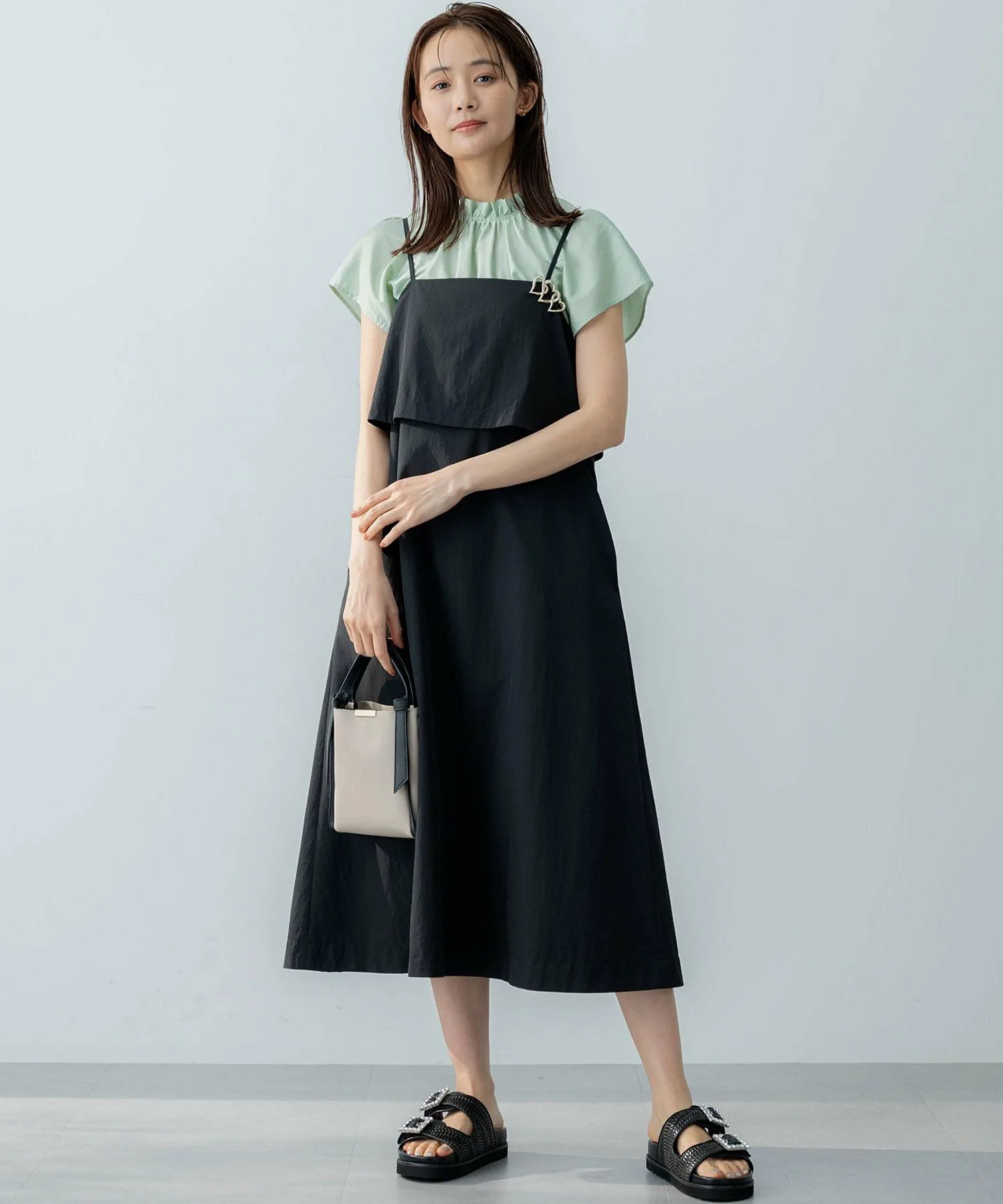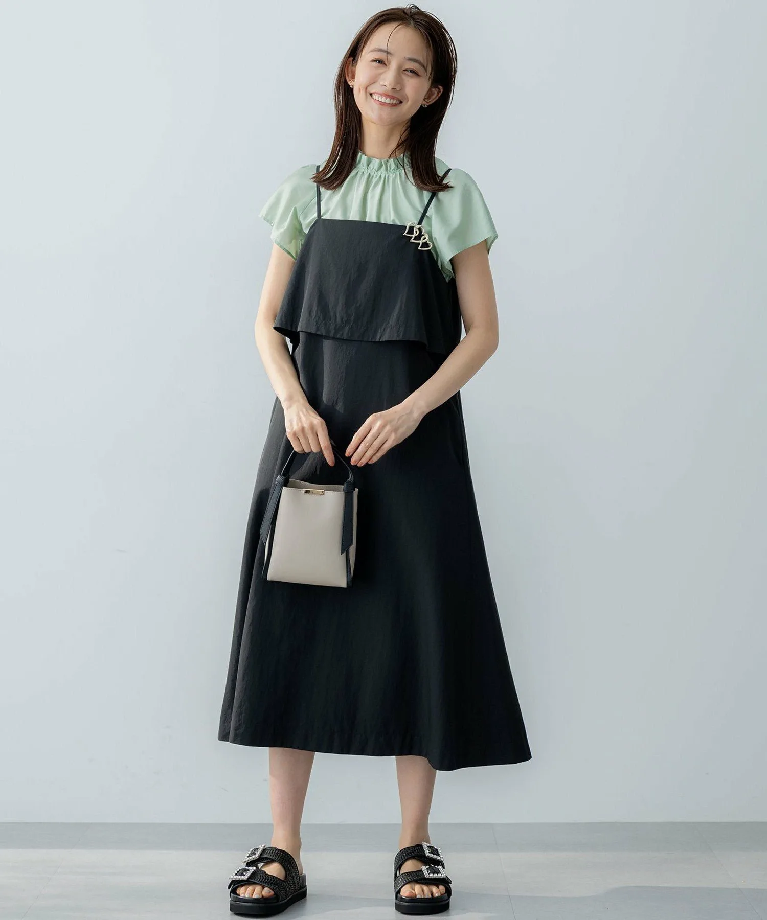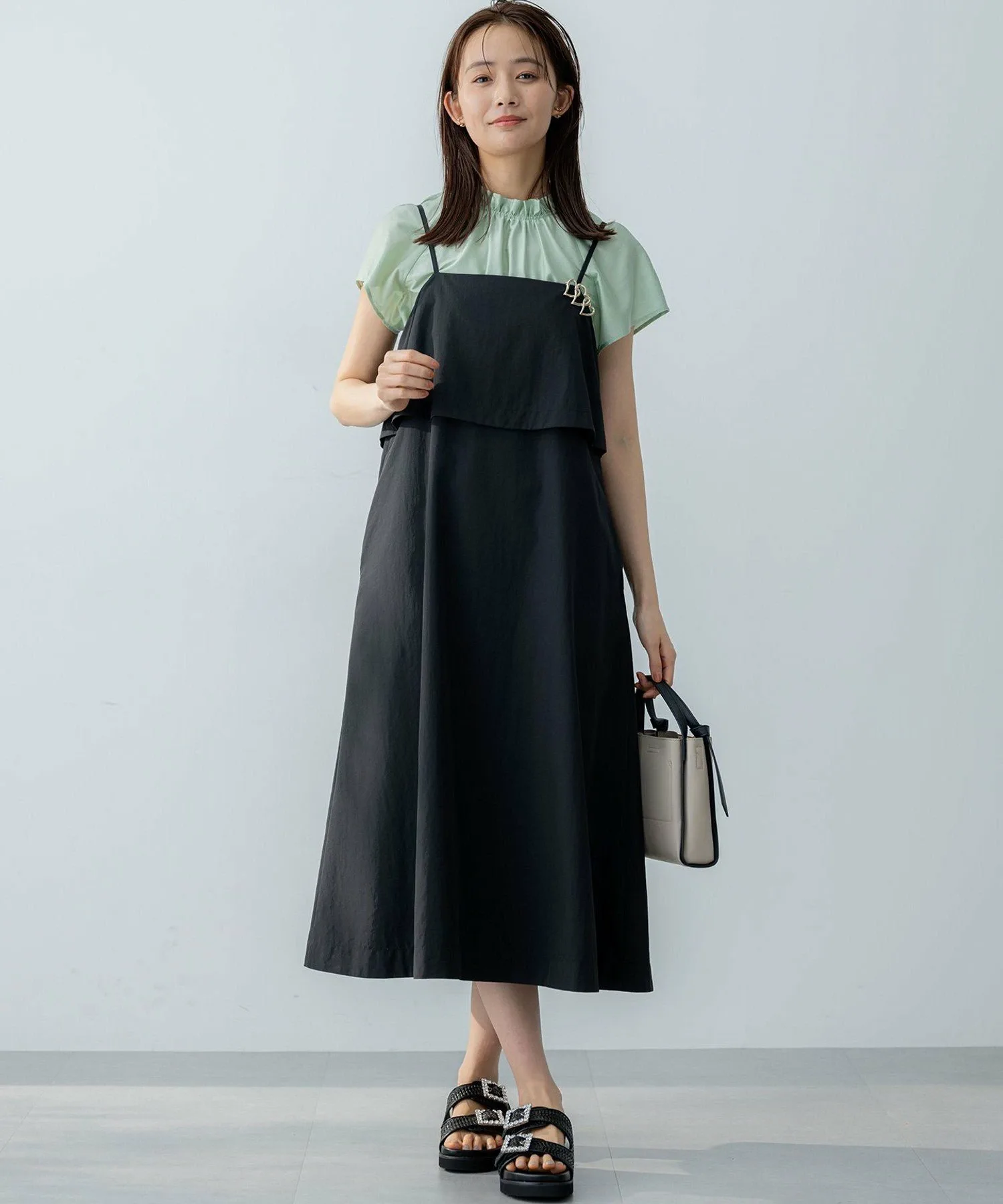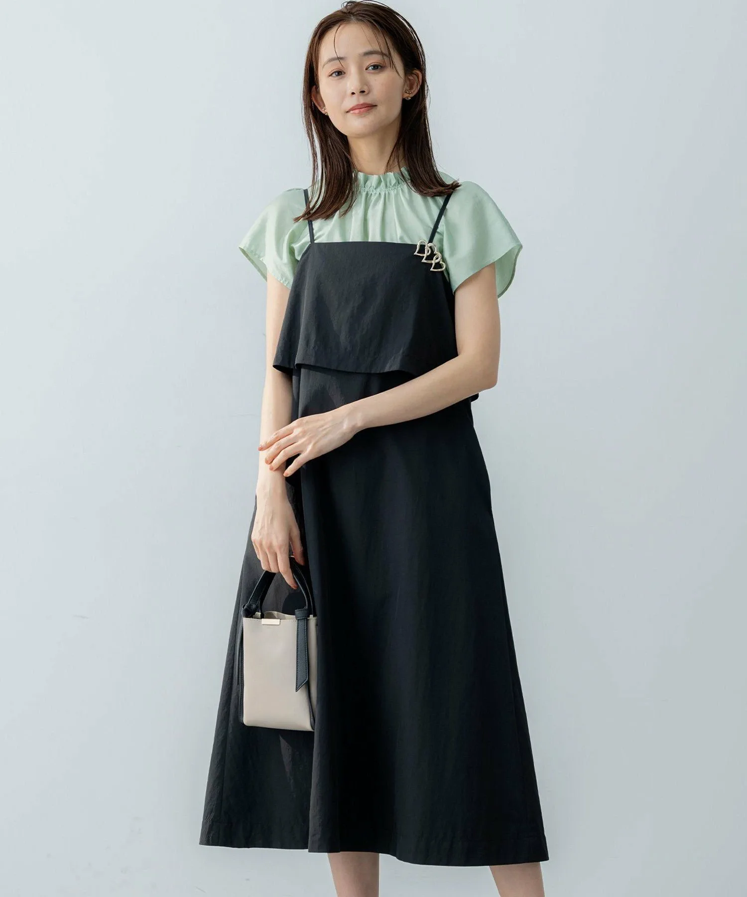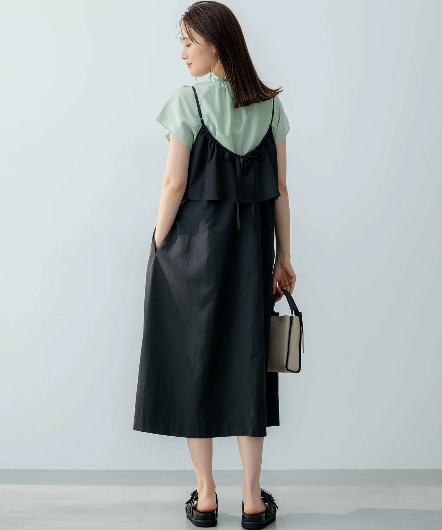 Дизайн・Верхняя часть платья выполнена из многослойной ткани, которая колышется при каждом движении, создавая зрелый, женственный образ. ・Спинка с лентой обеспечивает обзор на 360 градусов. ・Тонкие бретельки, придающие изящный вид, имеют регулятор, позволяющий легко регулировать длину. ・Слегка свободный крой без молнии делает надевание и снятие легким и удобным.