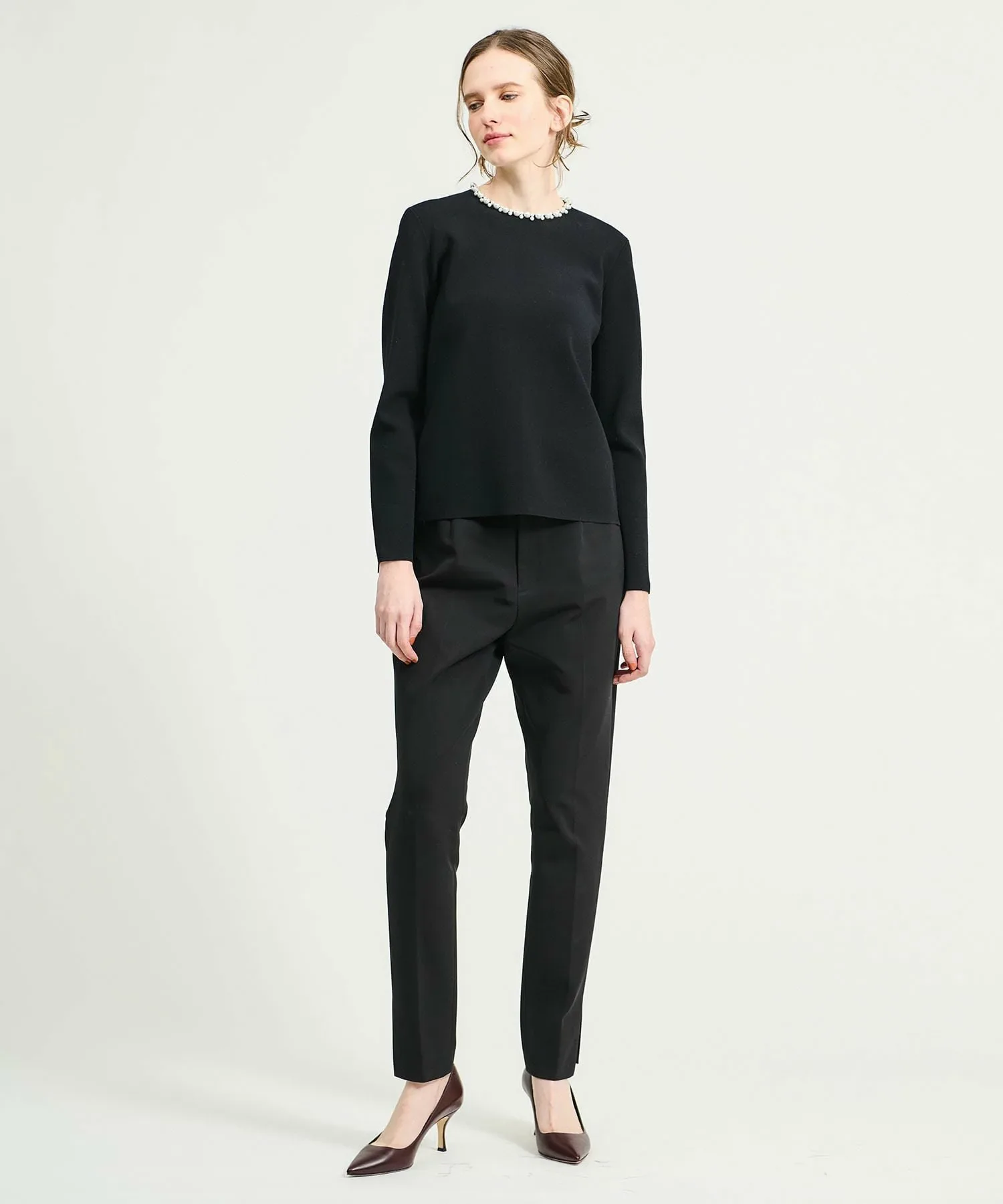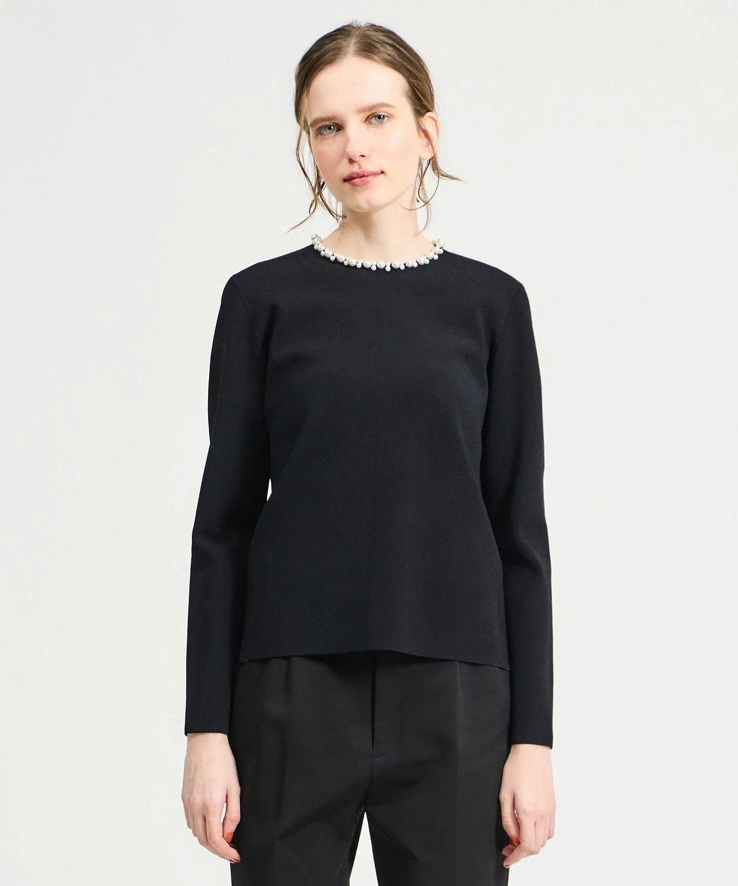 Жемчужные бусы вокруг воротника добавляют образу гламура, поэтому его можно носить и без аксессуаров.