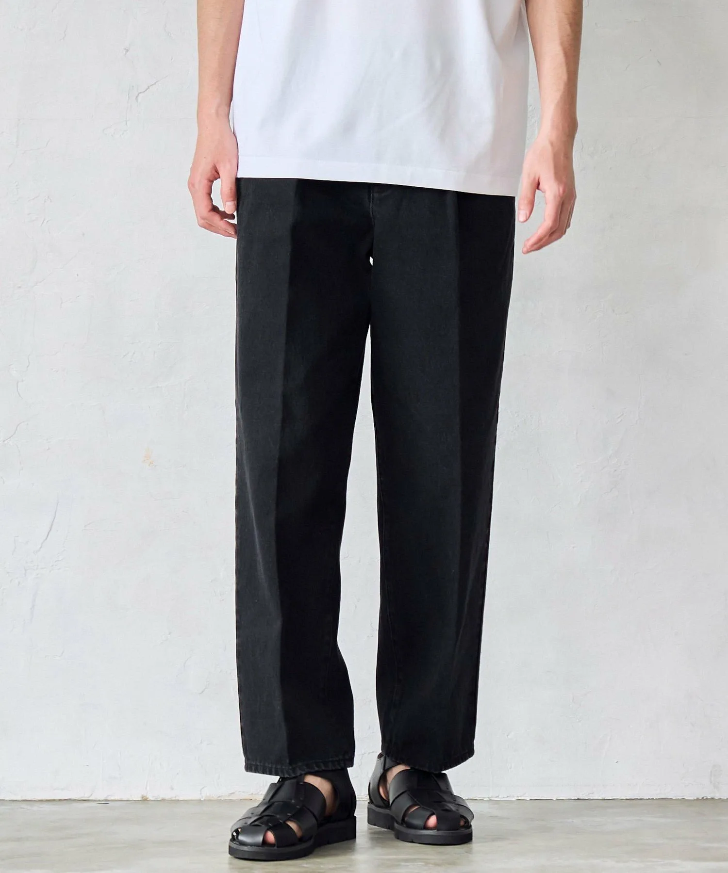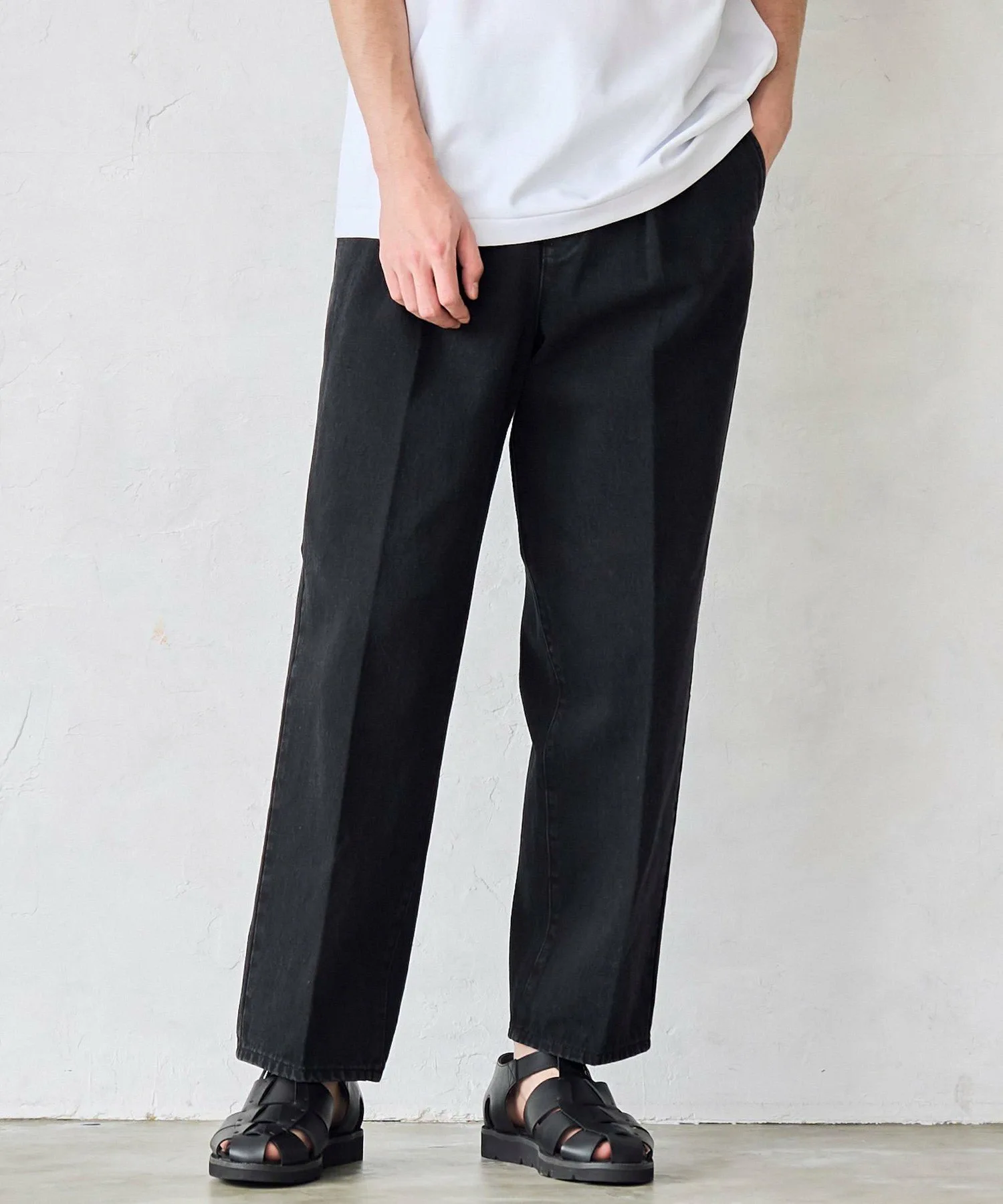 Повседневные джинсовые брюки с центральной складкой и зауженным силуэтом выглядят современно и стильно.