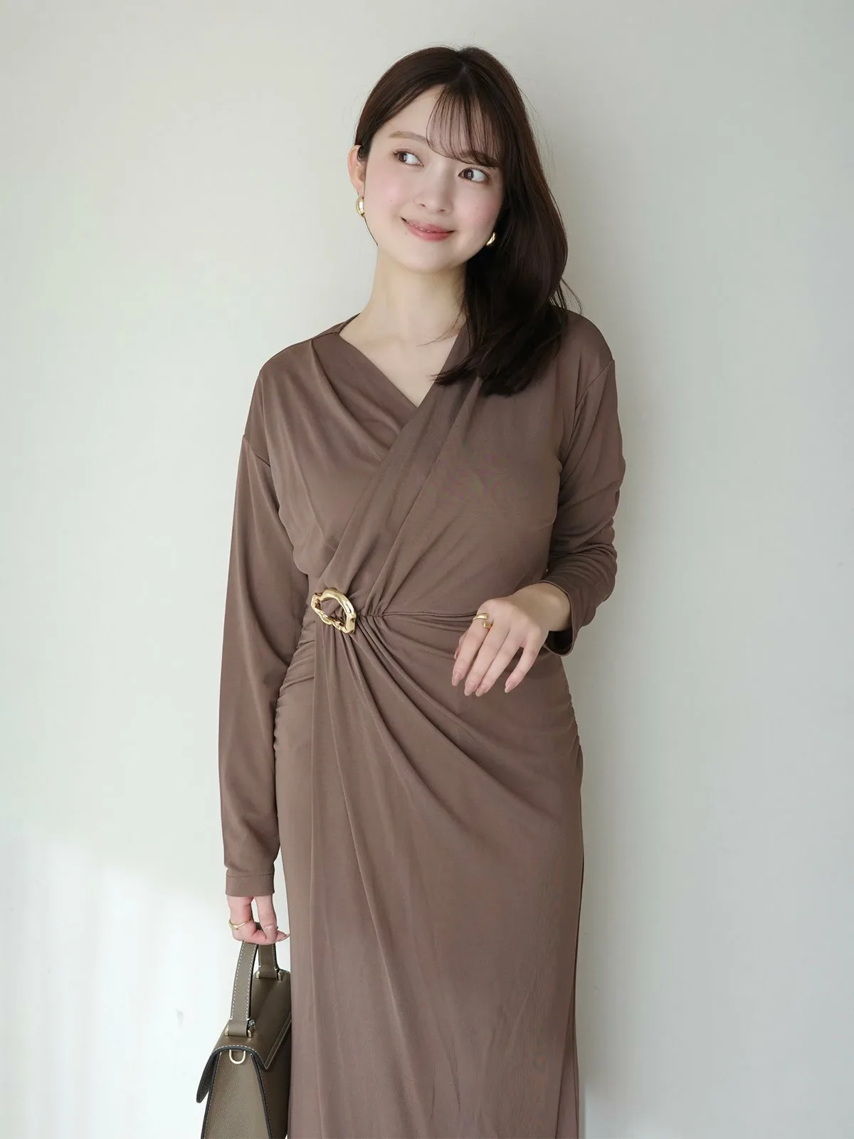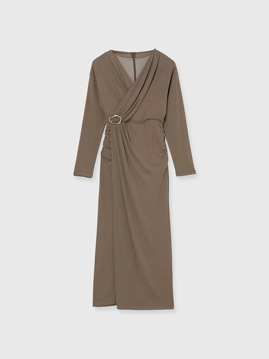 Элегантное платье с выразительными драпировками, которые прекрасно облегают фигуру, и оригинальной брошью в качестве изюминки.