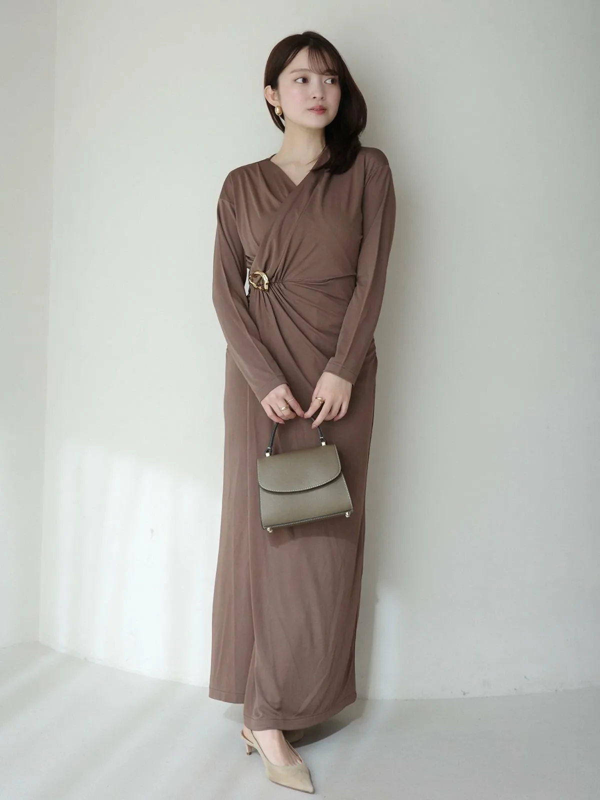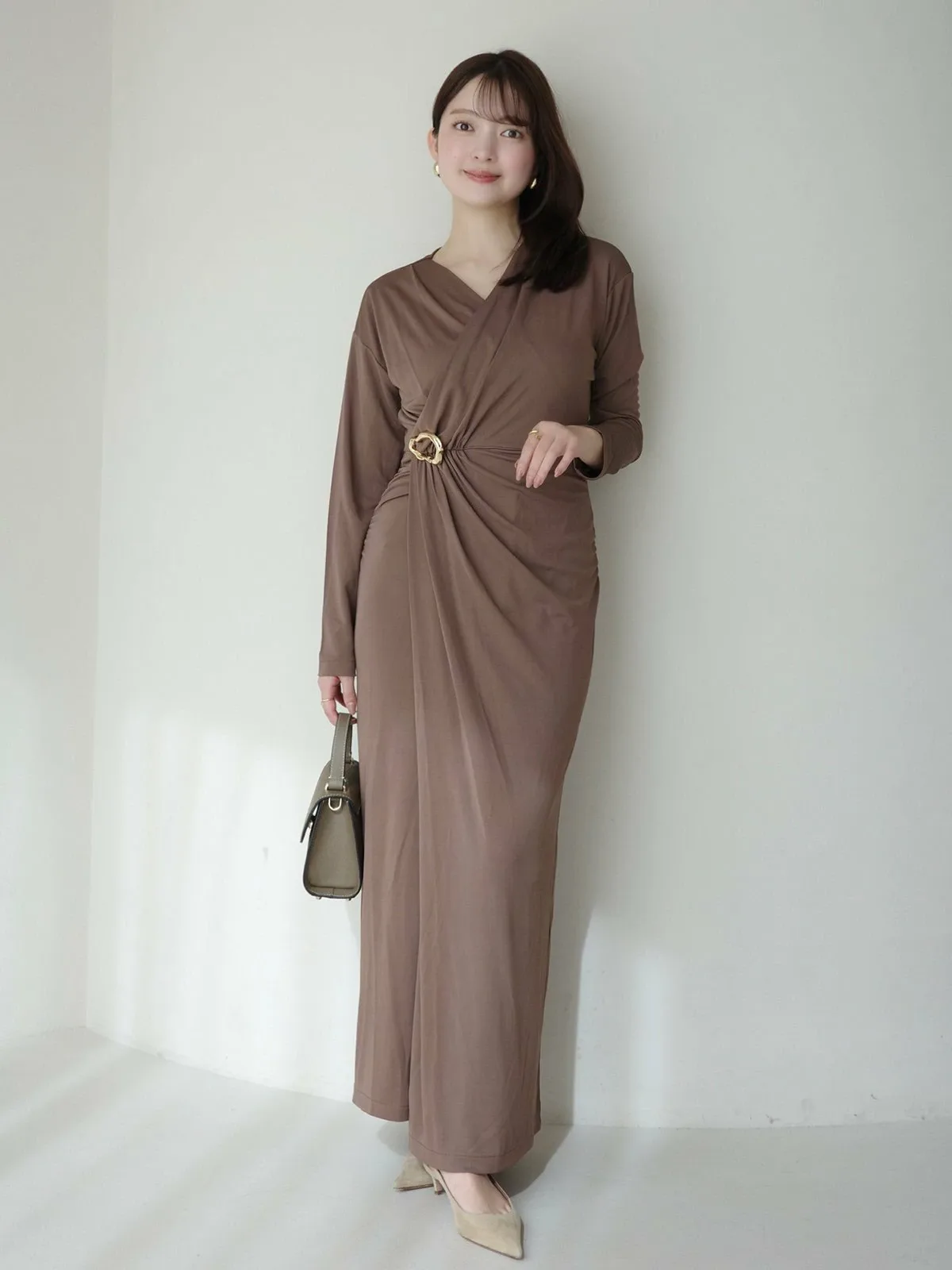 Складки с одной стороны тщательно отрегулированы, чтобы максимально усилить драпировку ткани, создавая изящный силуэт вокруг талии и плавно расширяясь к подолу.