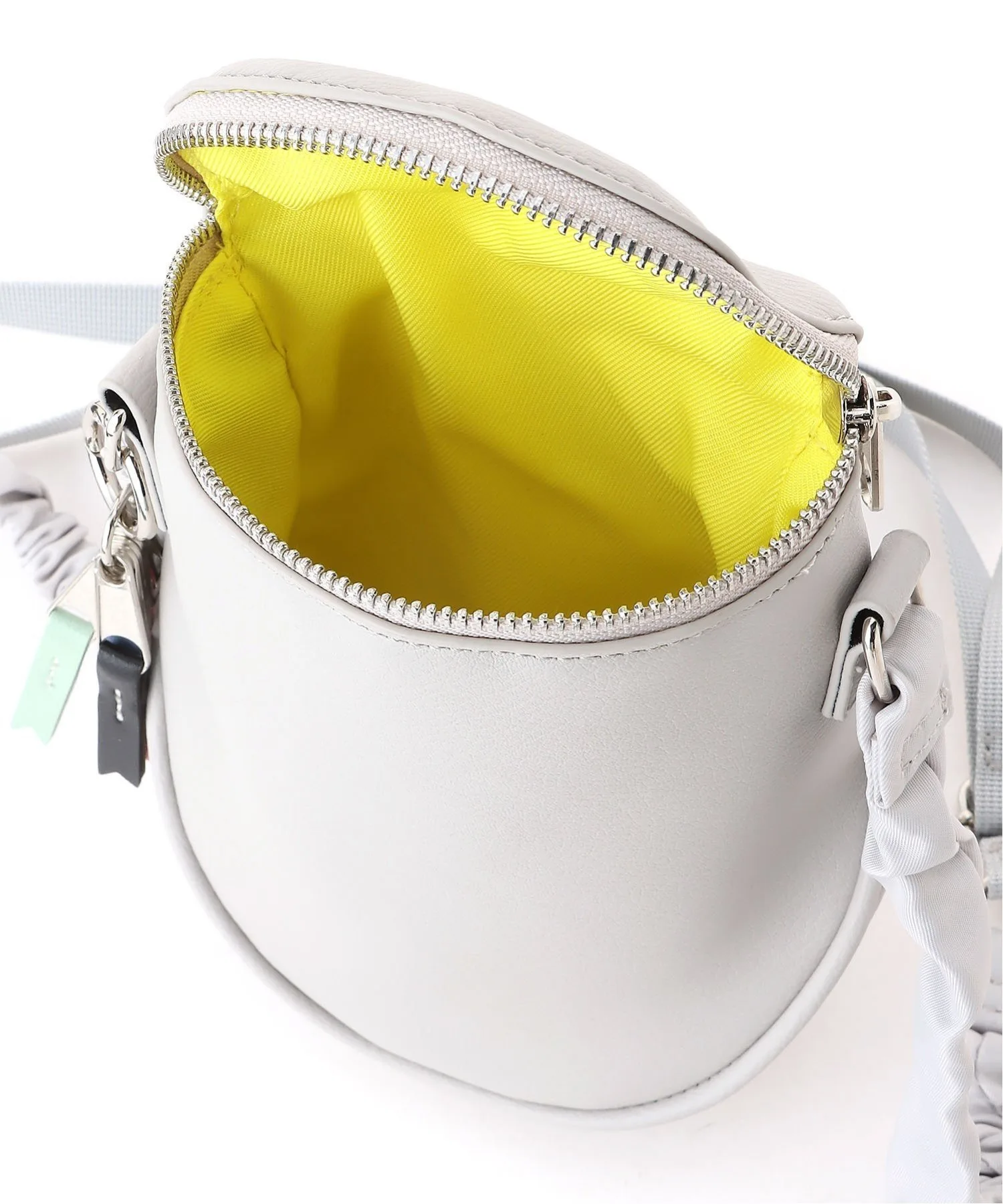 Эта милая круглая сумка через плечо — привлекательный аксессуар, украшенный семицветными лентами.