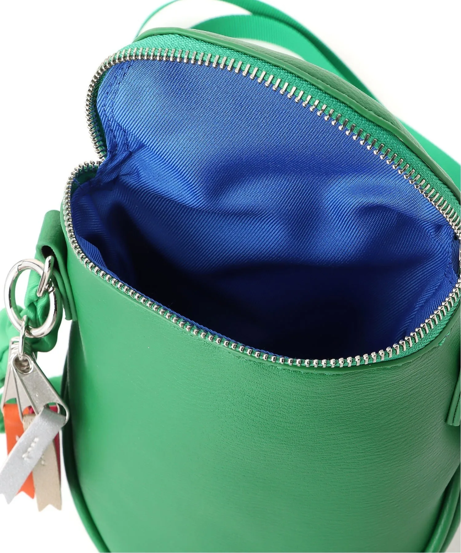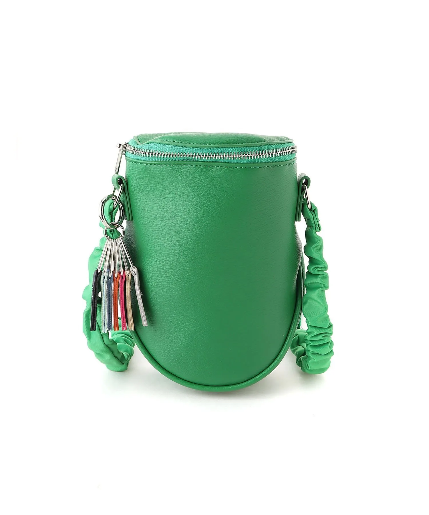Эта милая круглая сумка через плечо — привлекательный аксессуар, украшенный семицветными лентами.