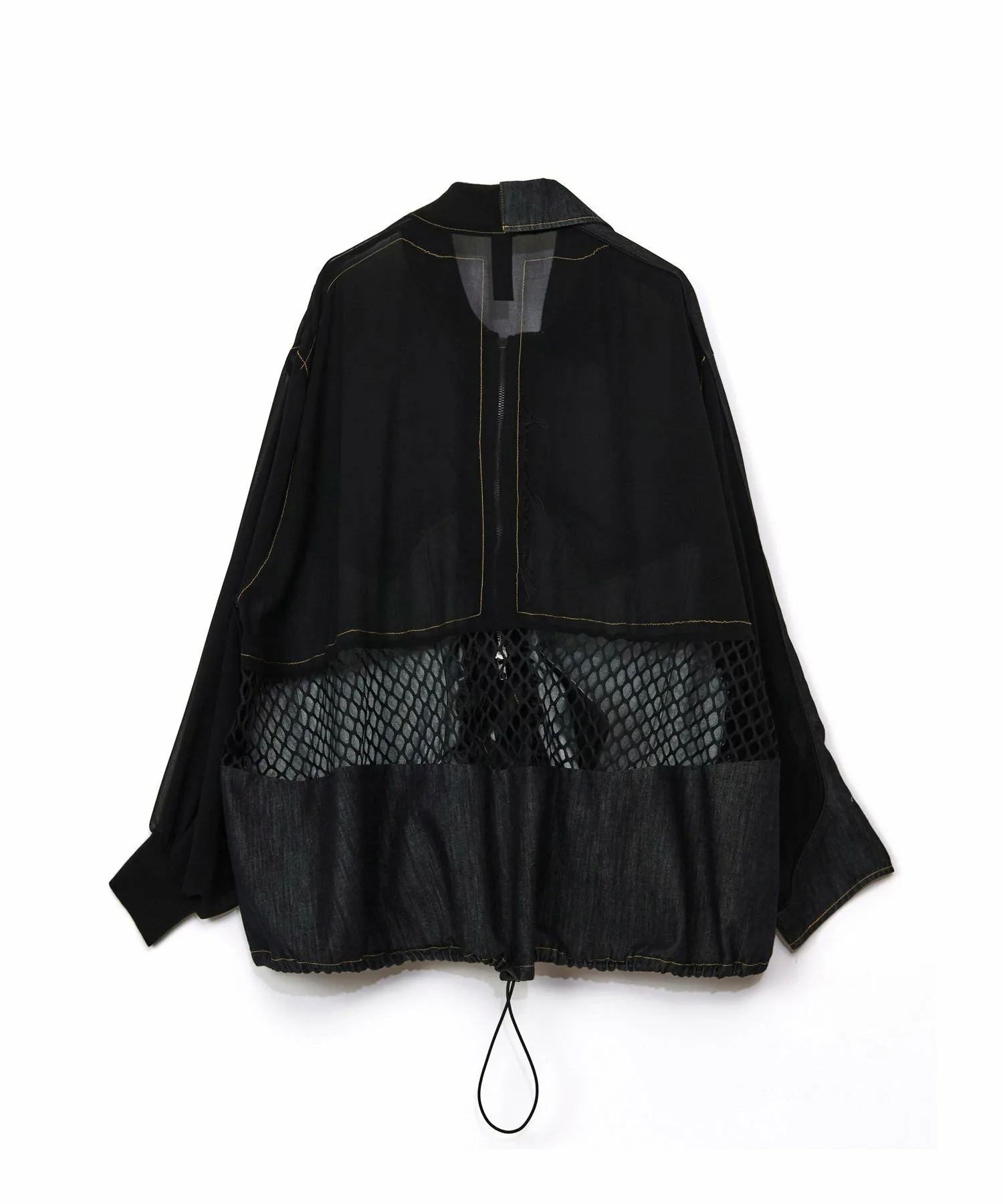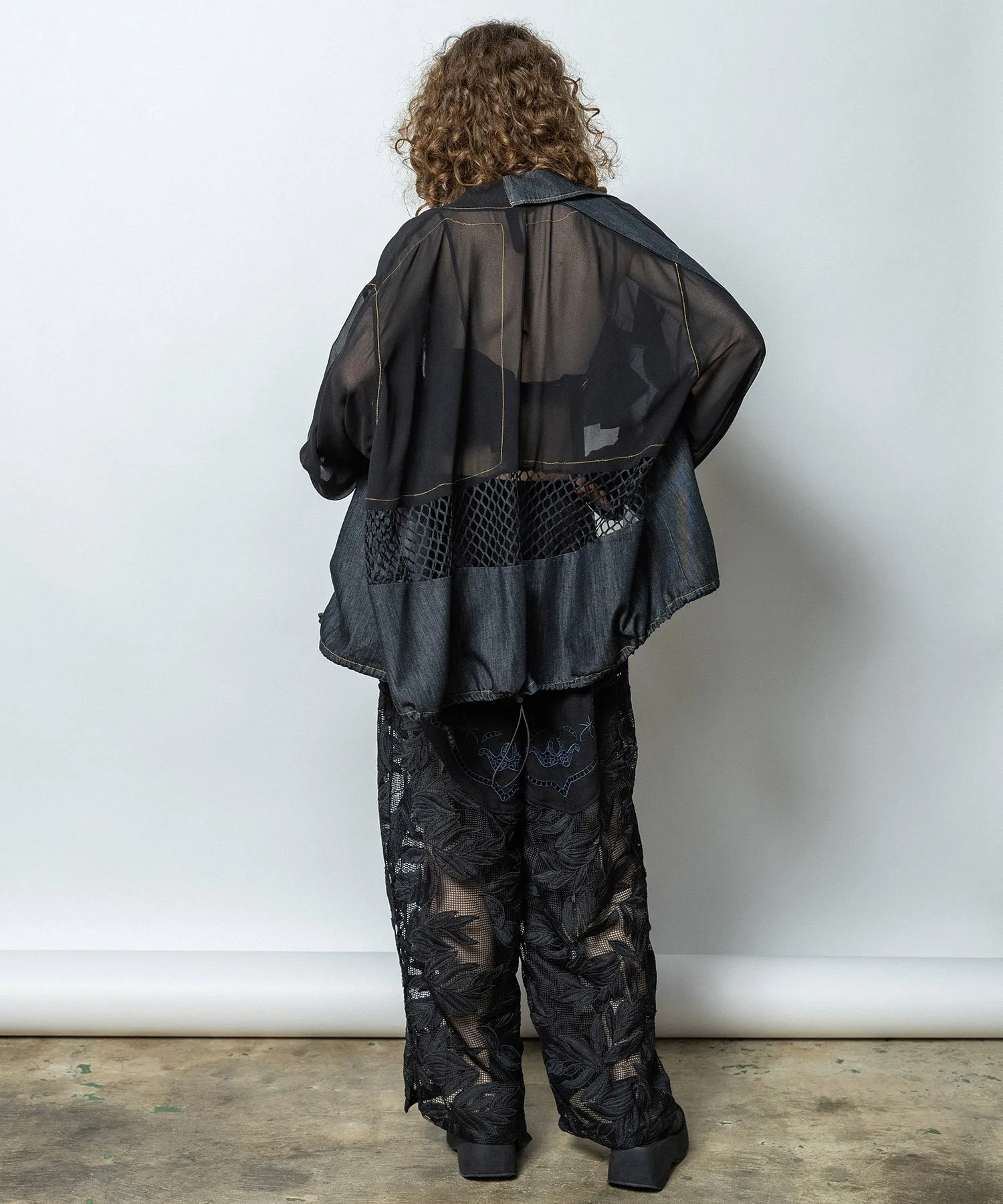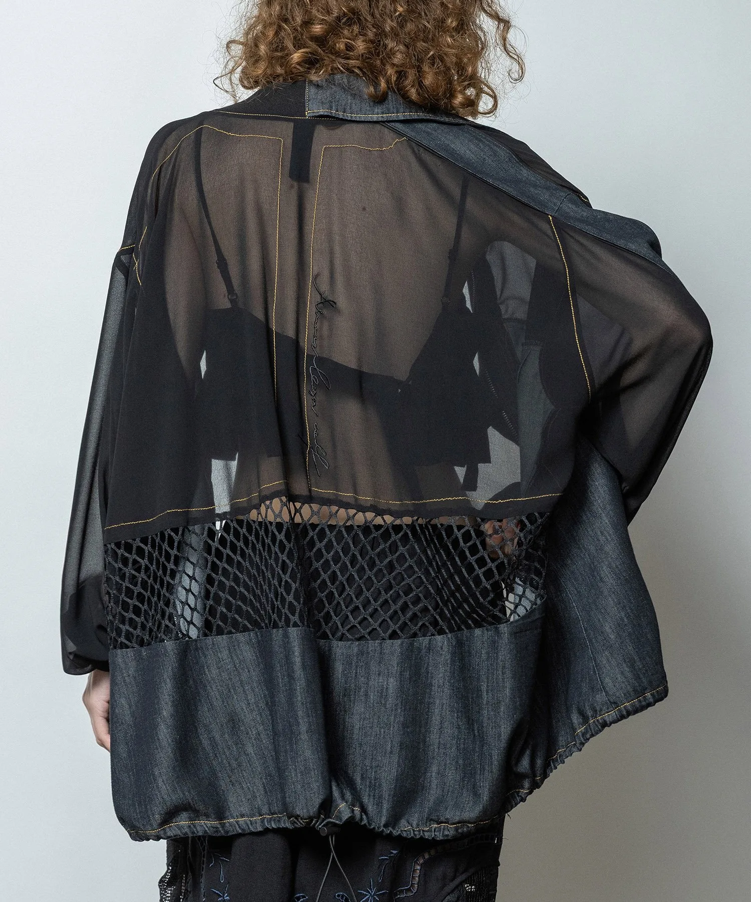 Карманы в форме стрелки с атласной окантовкой в тон джинсовой ткани добавляют винтажный шарм и являются ключевым элементом дизайна. Верхняя часть и рукава выполнены из прохладного шифона, подходящего для летней носки. Общий крой свободный, а низ и планка могут быть собраны шнурком, что позволяет менять объемный силуэт. На спине — строчка в тон и вышивка логотипа, а в центре — уникальное сочетание прозрачной сетки и другого материала. Этот не подкладочный, очень легкий блузон идеально подходит для весны и лета.
