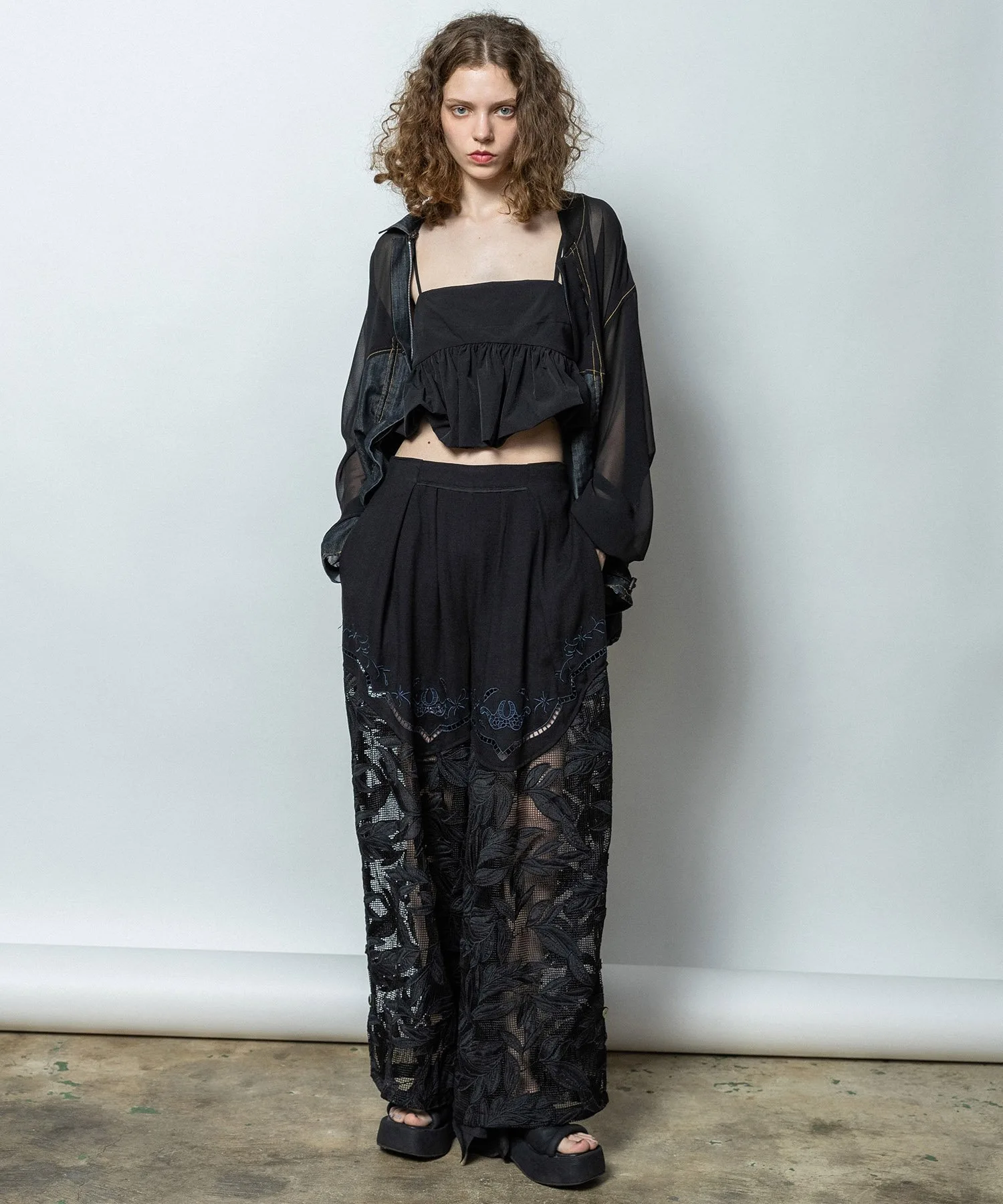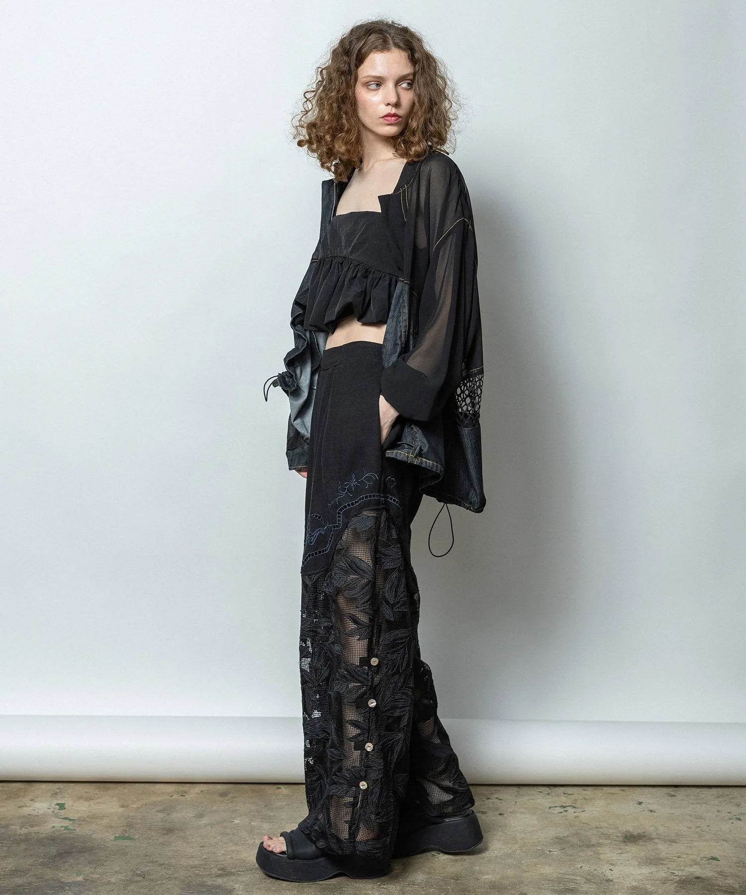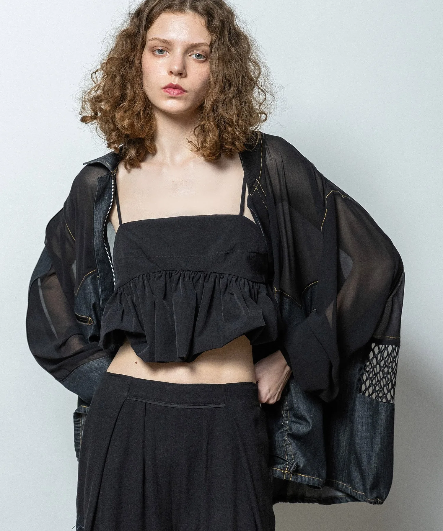 Карманы в форме стрелки с атласной окантовкой в тон джинсовой ткани добавляют винтажный шарм и являются ключевым элементом дизайна. Верхняя часть и рукава выполнены из прохладного шифона, подходящего для летней носки. Общий крой свободный, а низ и планка могут быть собраны шнурком, что позволяет менять объемный силуэт. На спине — строчка в тон и вышивка логотипа, а в центре — уникальное сочетание прозрачной сетки и другого материала. Этот не подкладочный, очень легкий блузон идеально подходит для весны и лета.