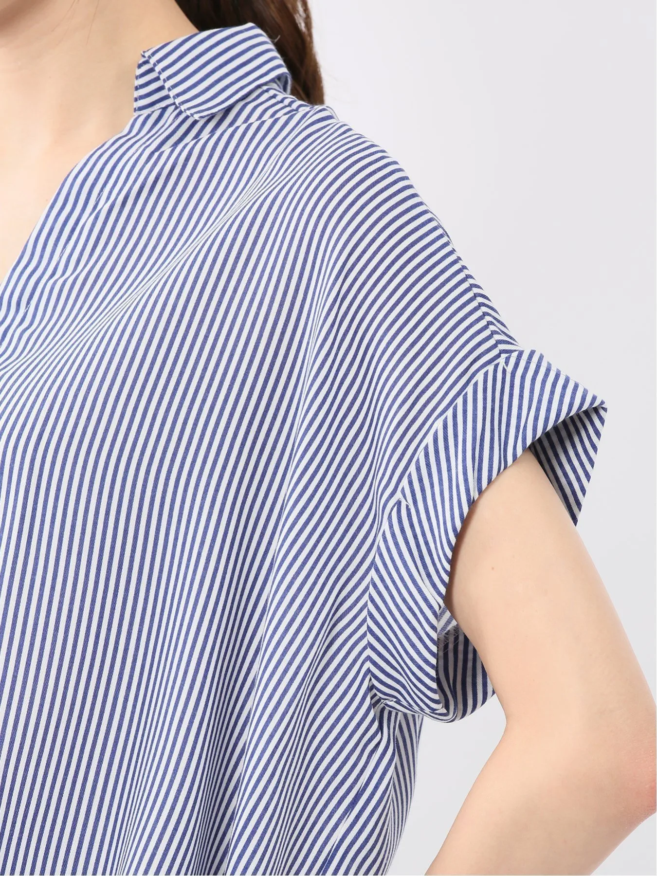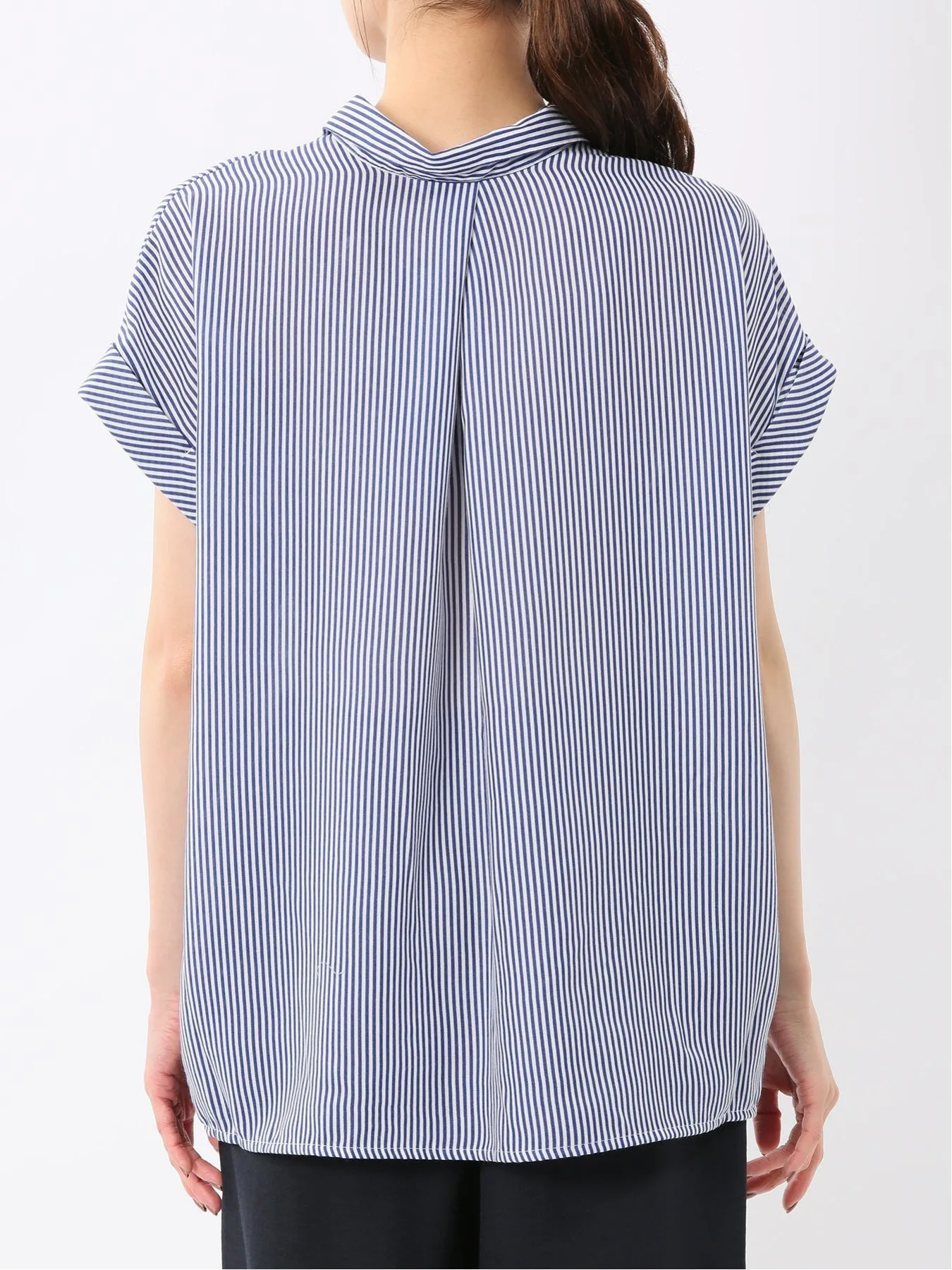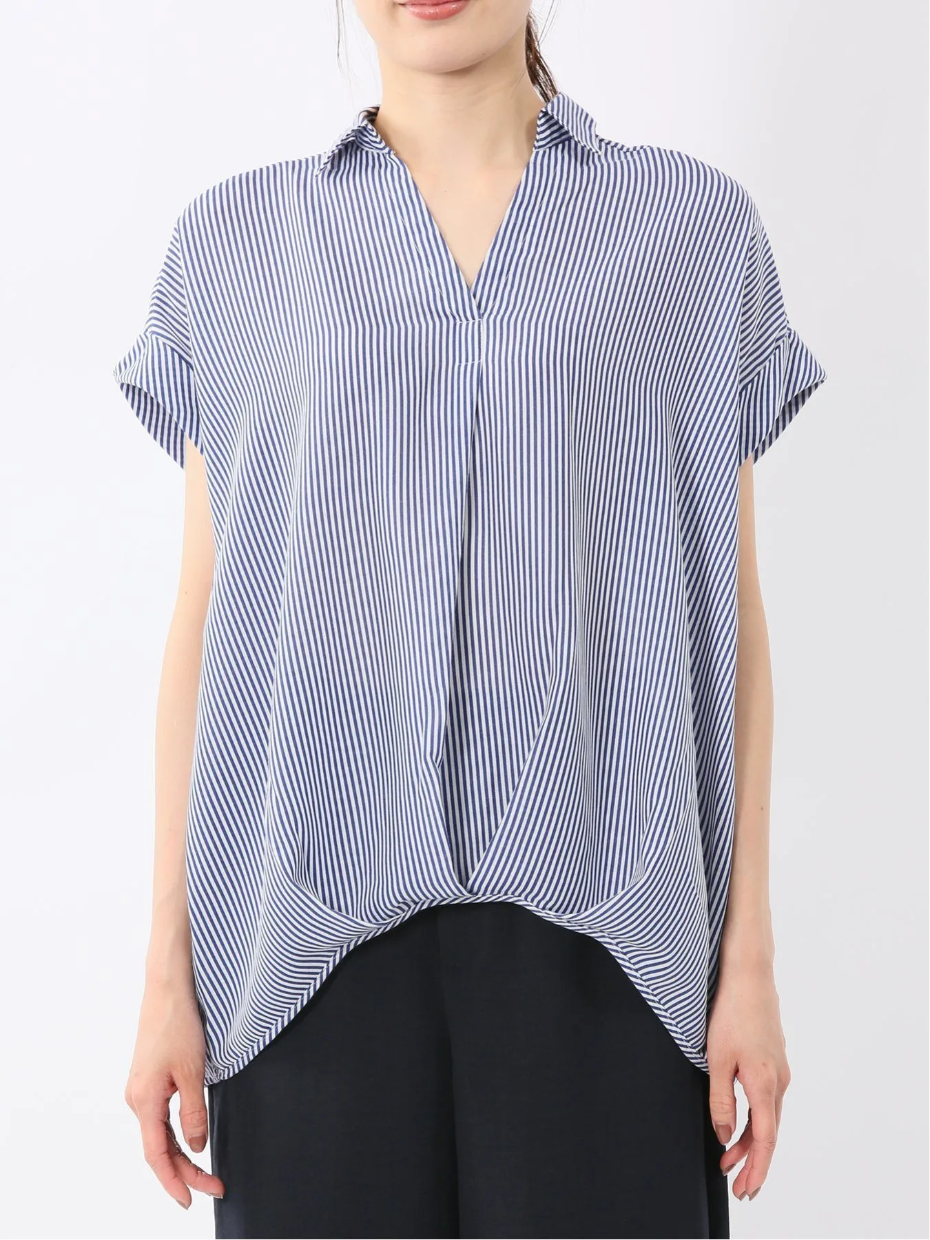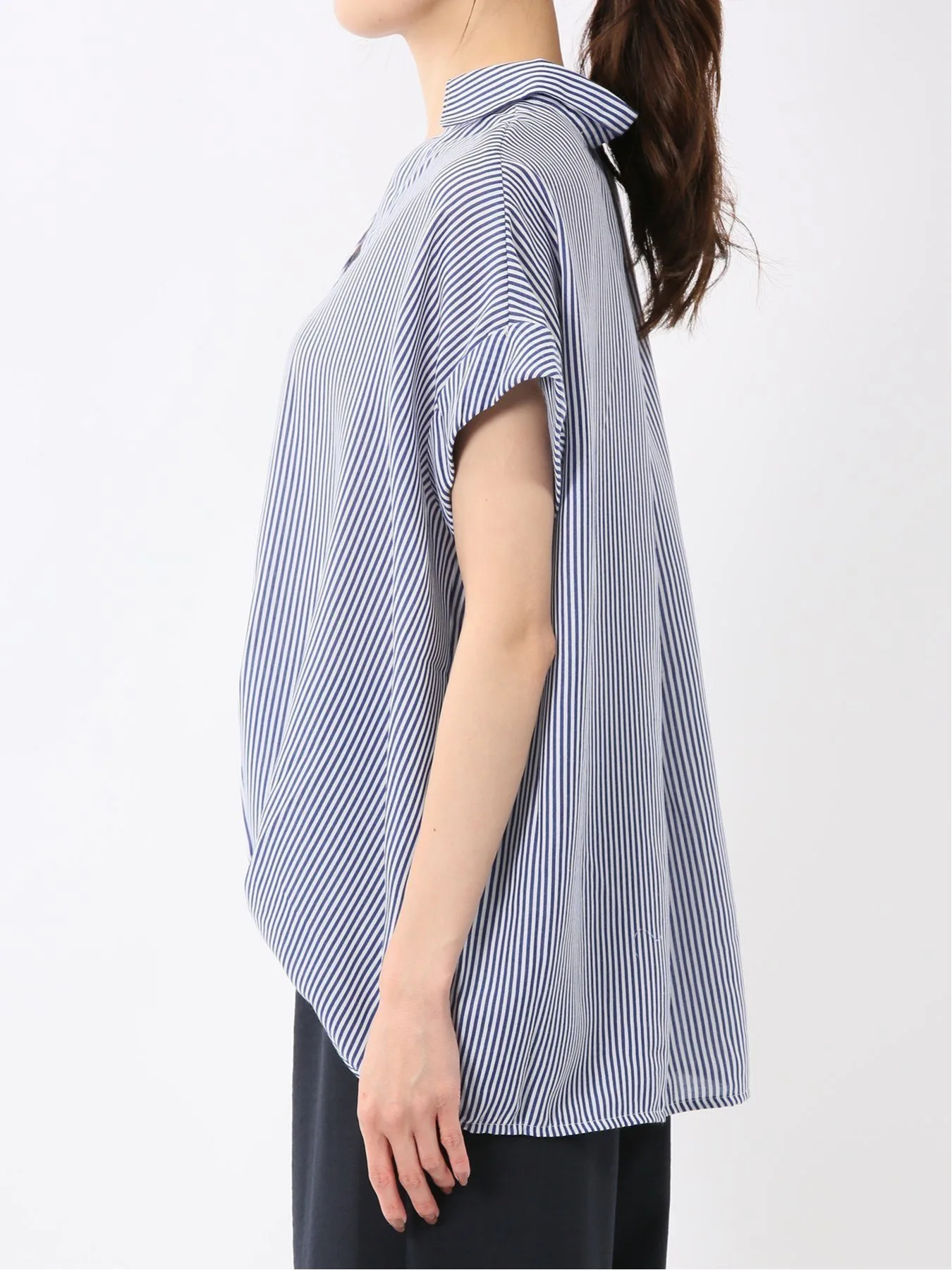 Эта рубашка с короткими рукавами имеет свободный воротник-стойку, мягкие складки по низу спереди и длину подола, которая меняется от передней части к задней для аккуратного, обтекаемого вида.
