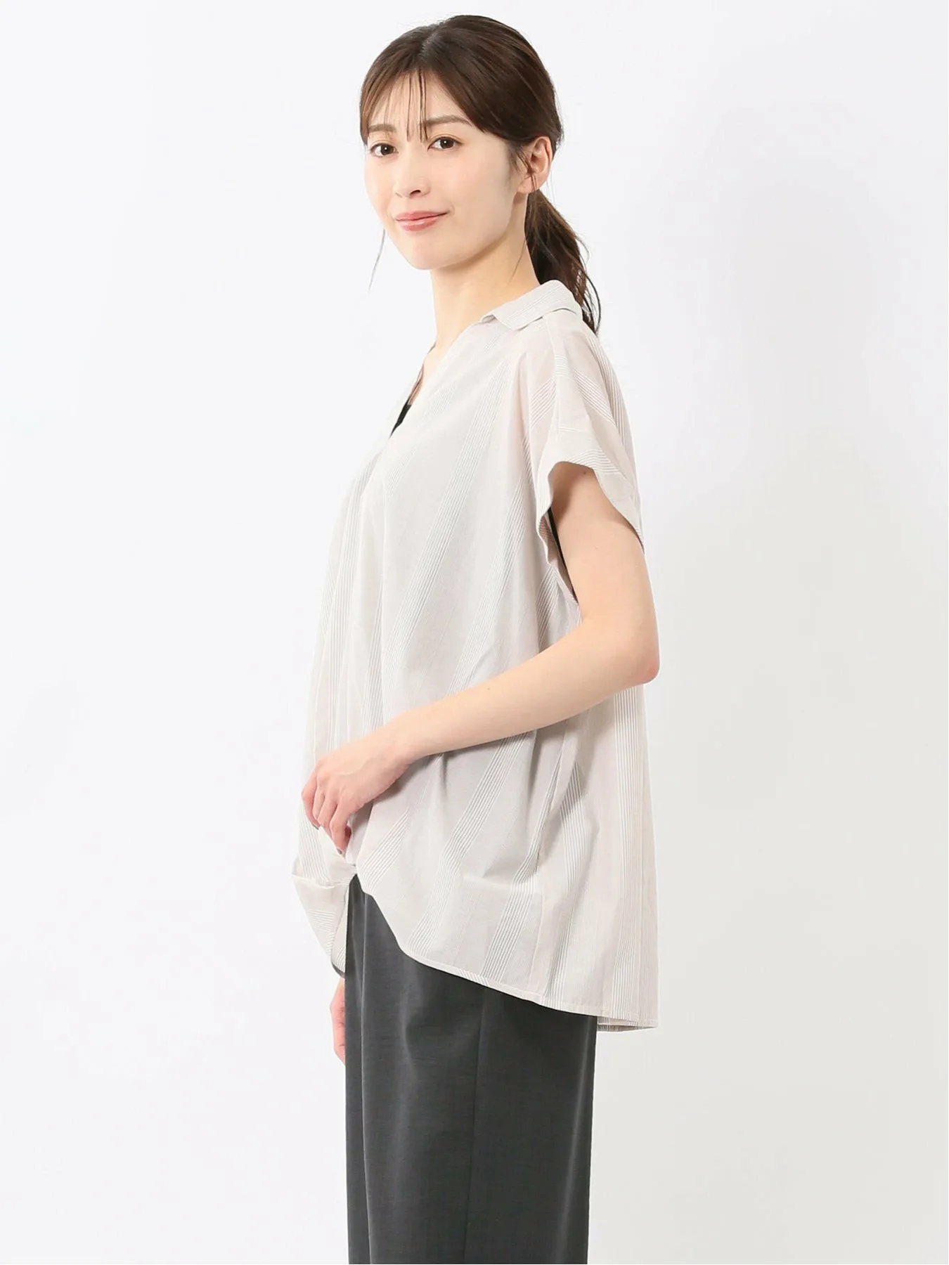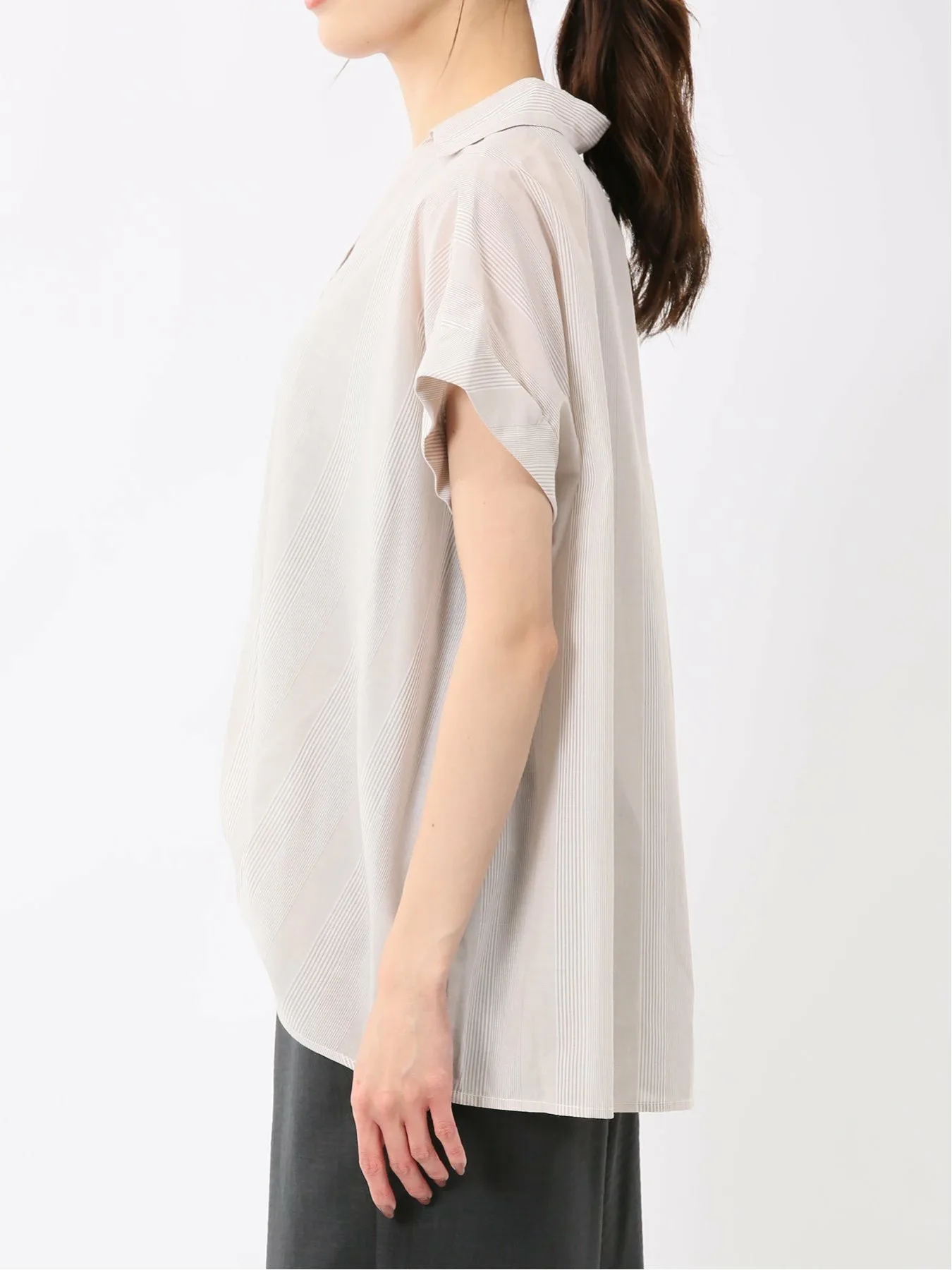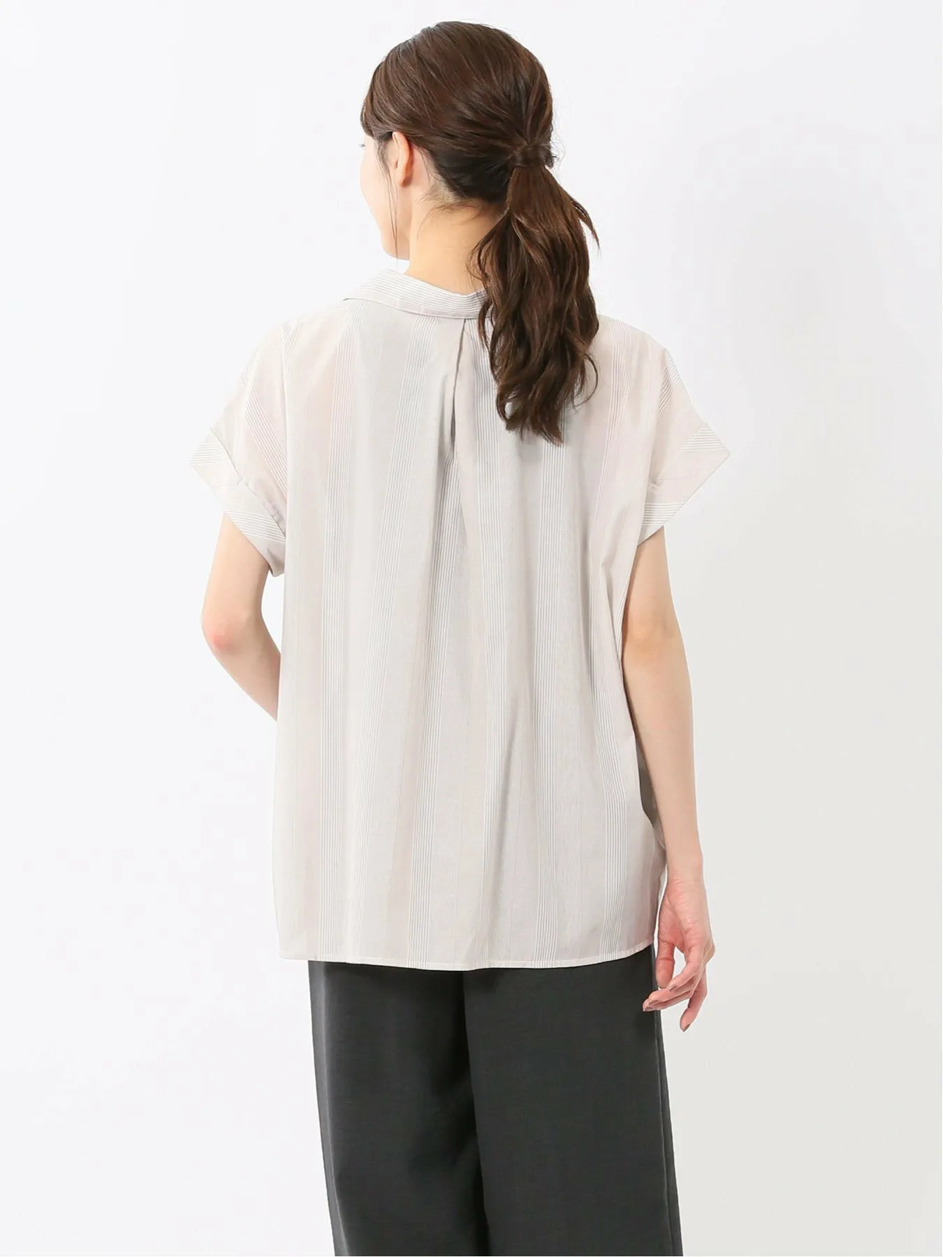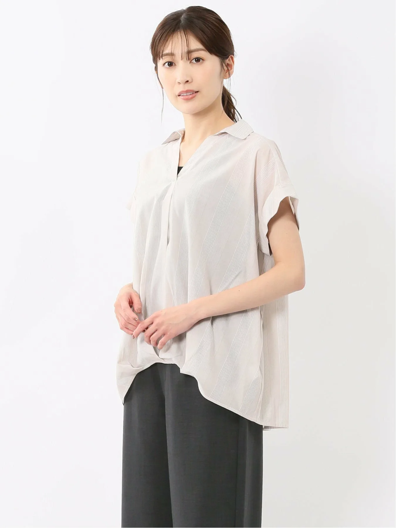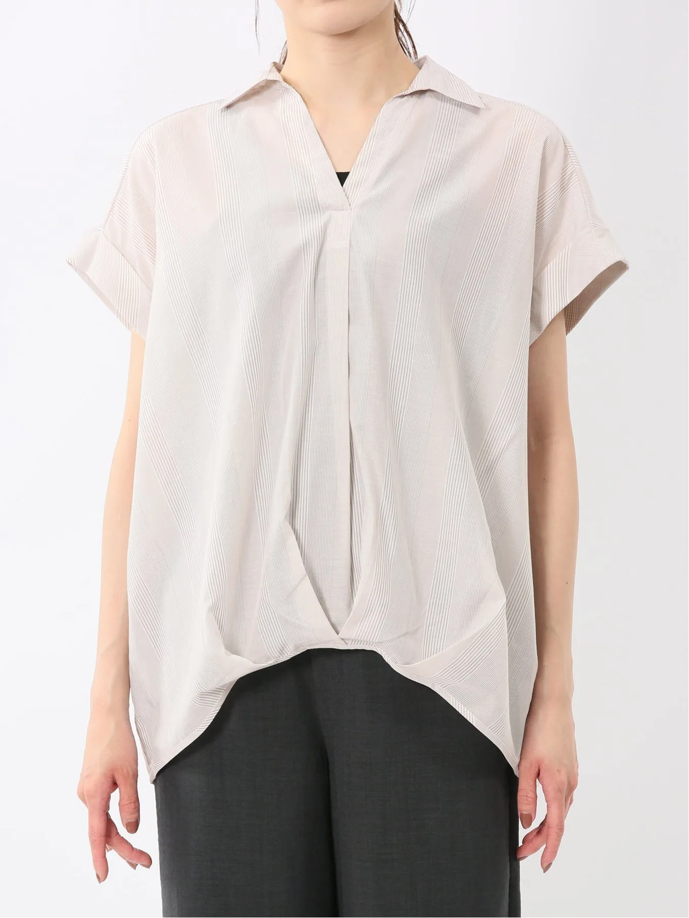Эта рубашка с короткими рукавами имеет свободный воротник-стойку, объемные складки спереди и подол, длина которого меняется от передней части к задней для аккуратного и обтекаемого вида.