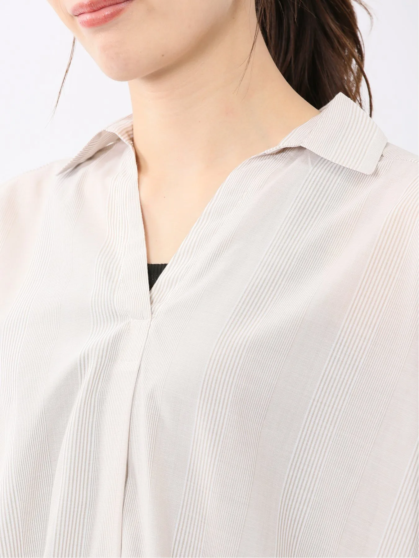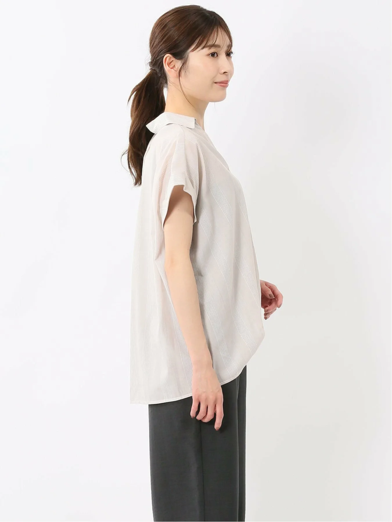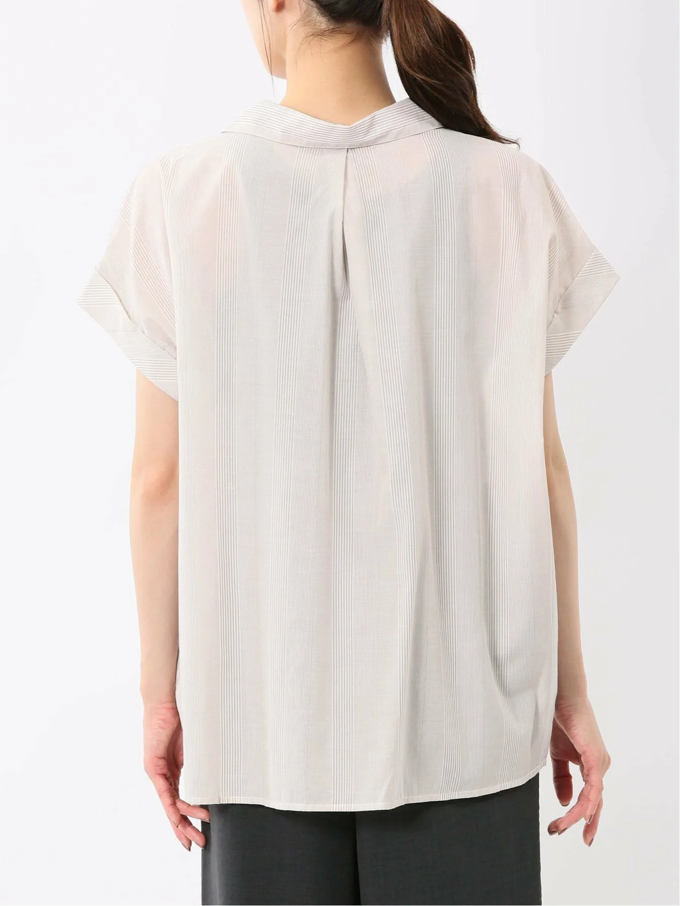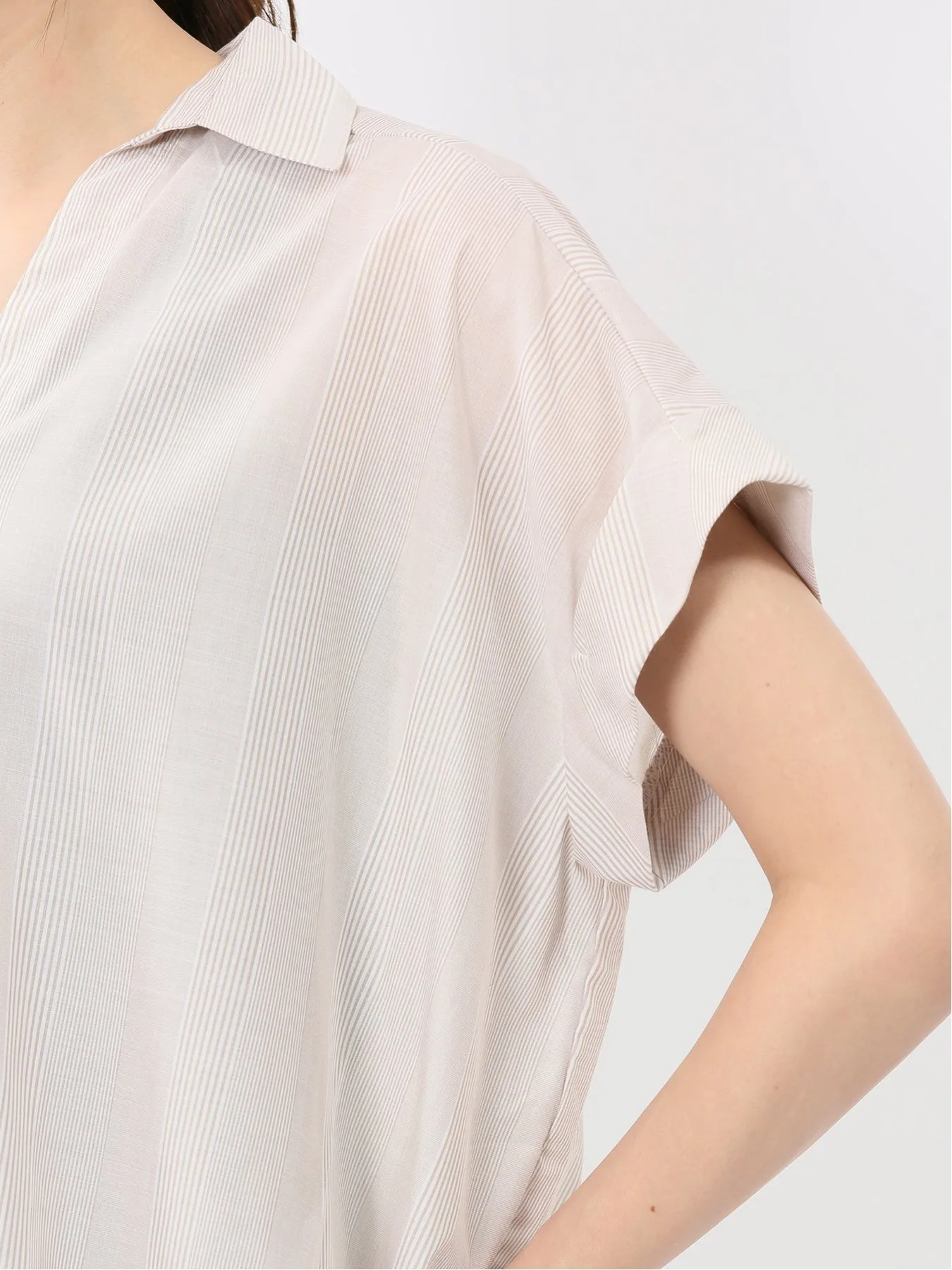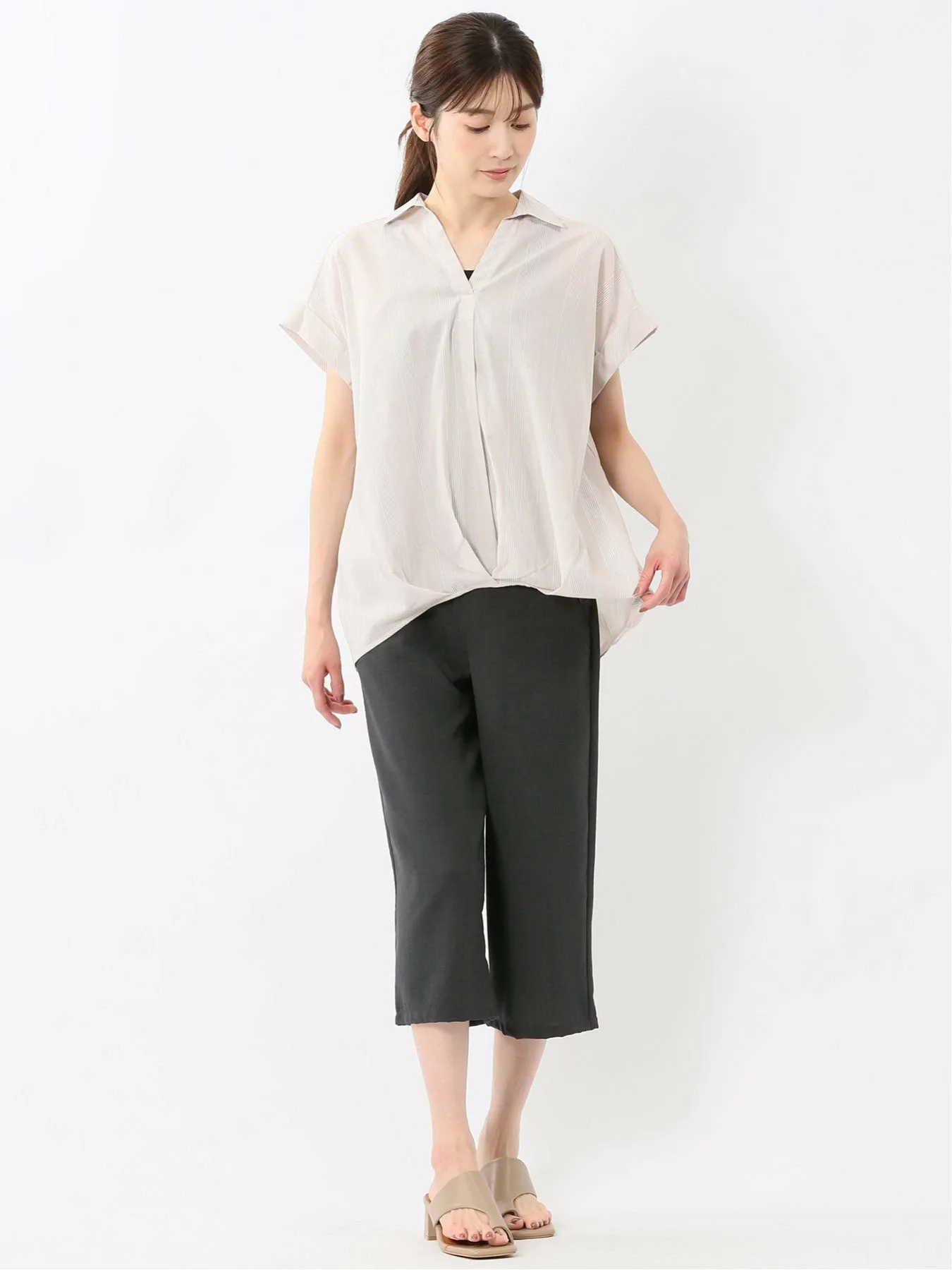 Эта рубашка с короткими рукавами имеет свободный воротник-стойку, объемные складки спереди и подол, длина которого меняется от передней части к задней для аккуратного и обтекаемого вида.