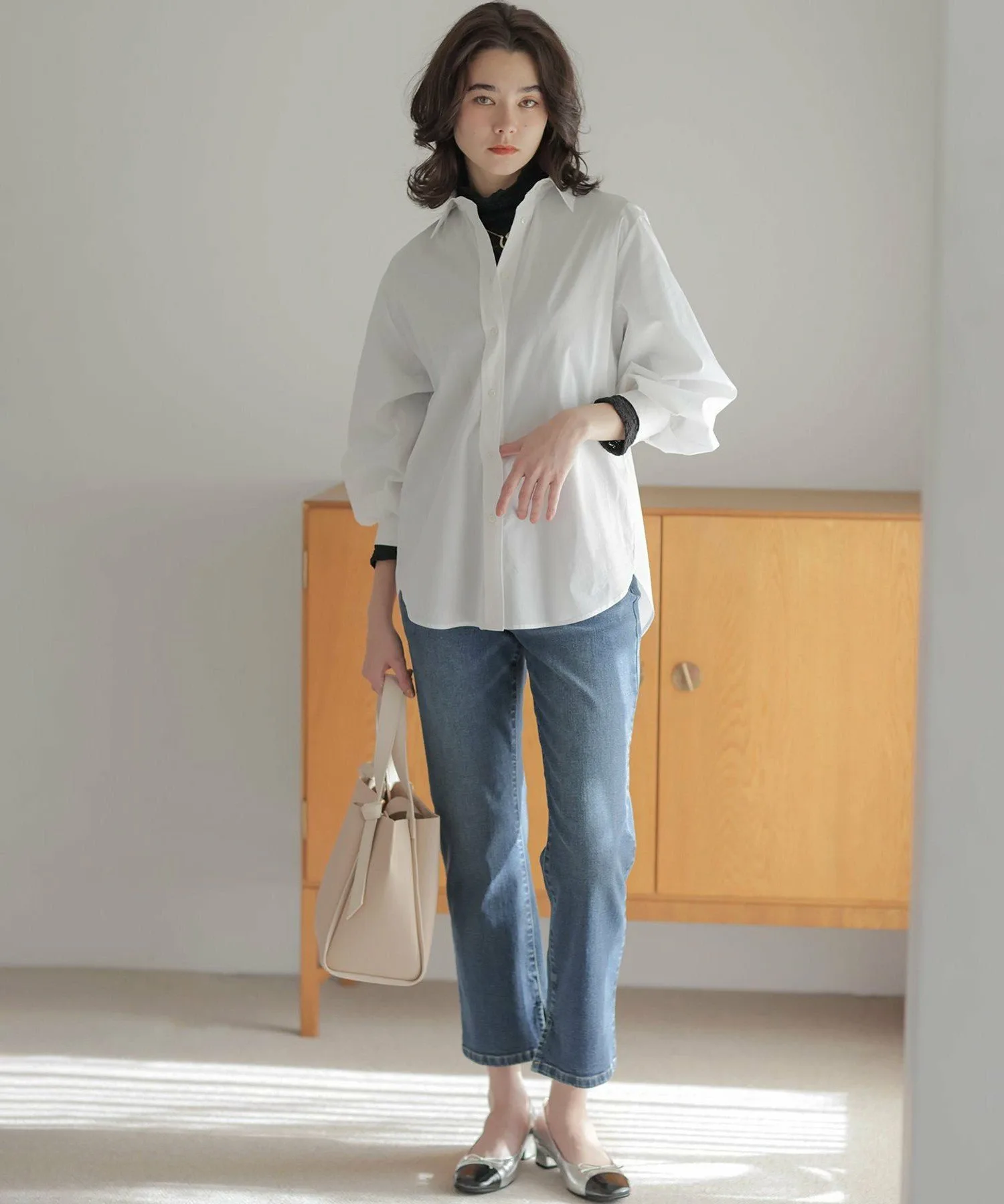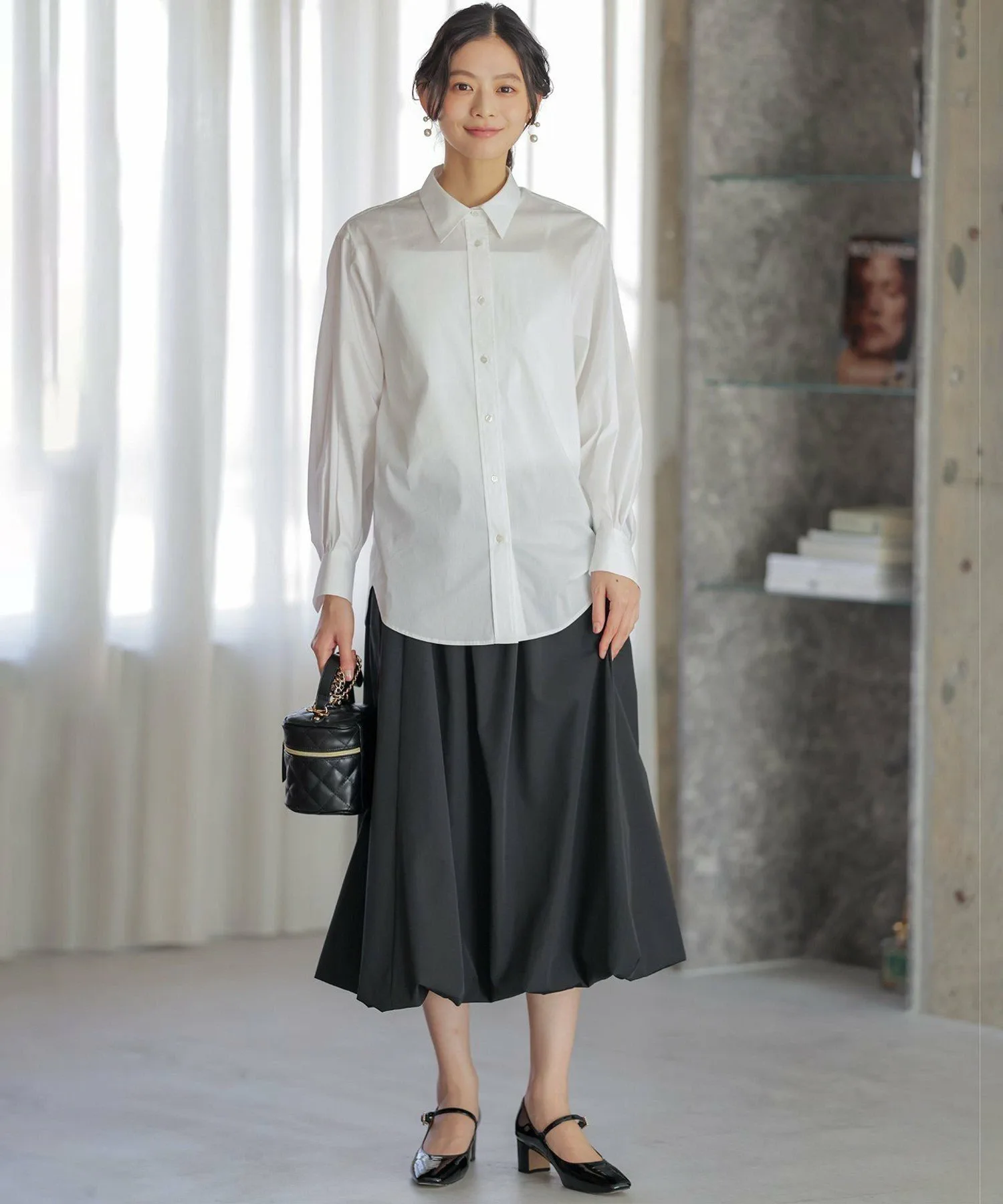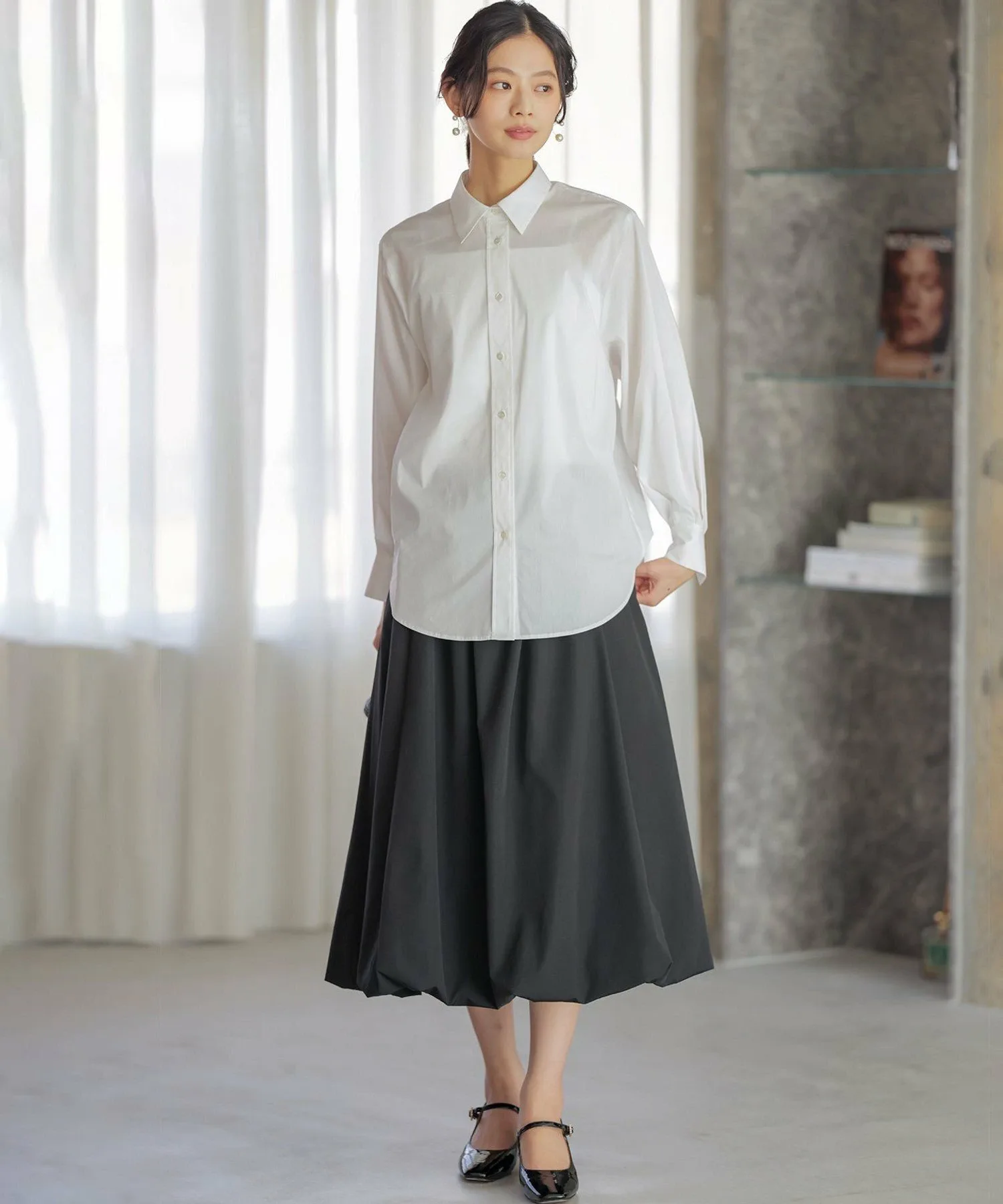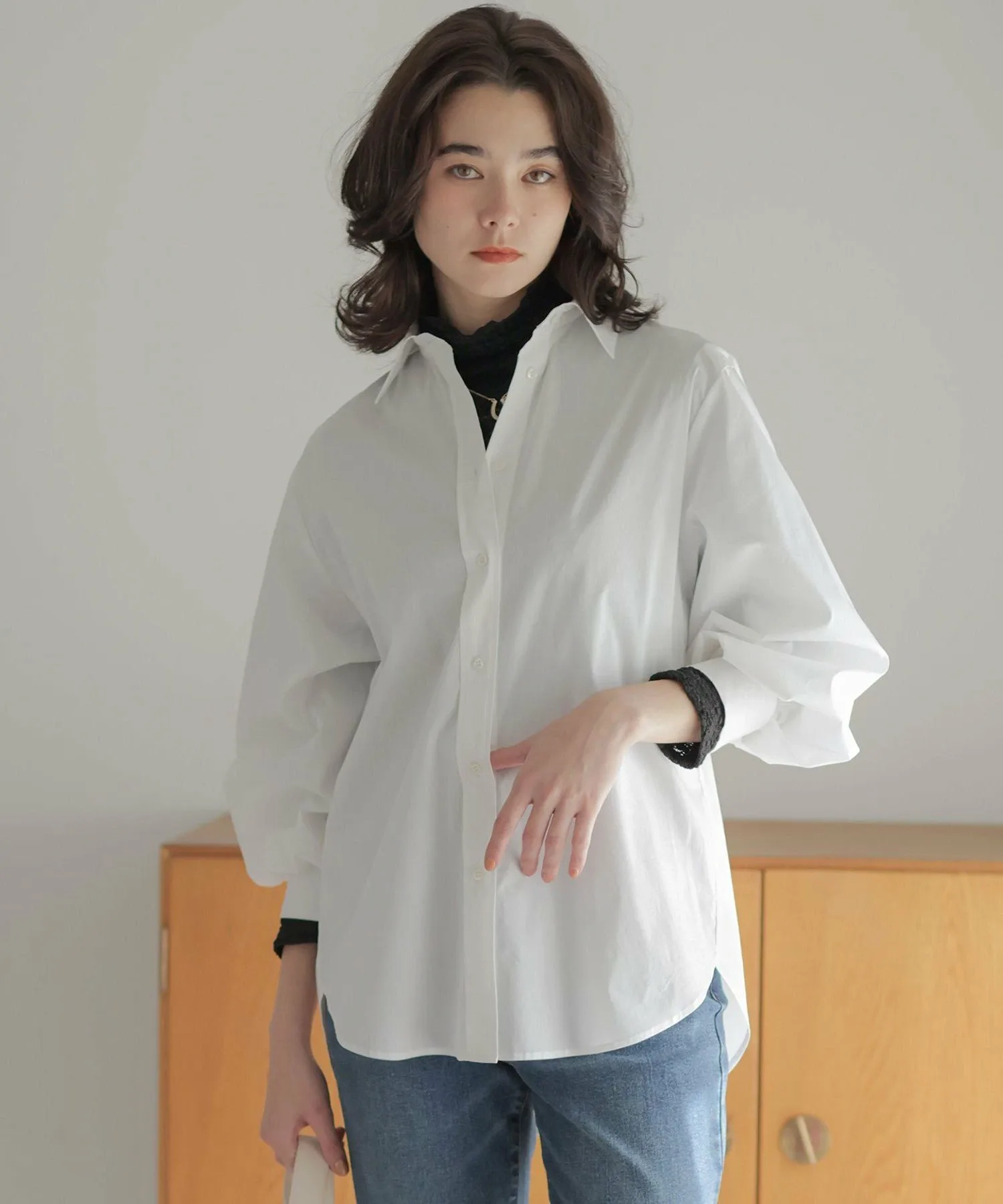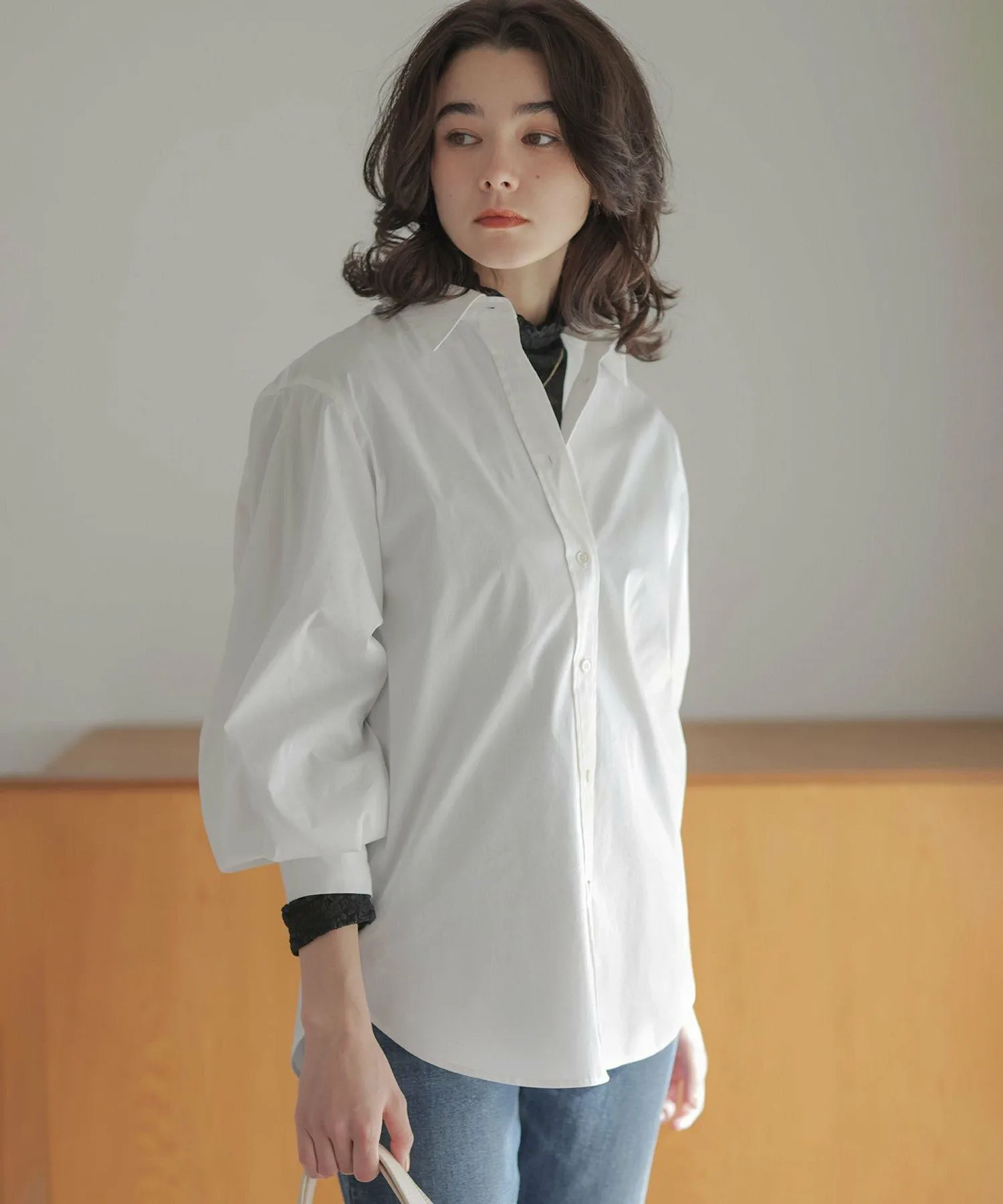 Дизайн: Объемная рубашка с умеренным силуэтом и округлым кроем. ・Рекомендуем сочетать рукава с рукавами свободного кроя. Объем, напоминающий воздушный шар, выглядит привлекательно. ・Мягкий и легкий материал позволяет легко носить ее с любой верхней одеждой. ・Скрытая вышивка на левой манжете. Этот дизайн призван обеспечить долговечность, поскольку рубашка напоминает лучшего друга. (BFF: Лучший друг навсегда.)