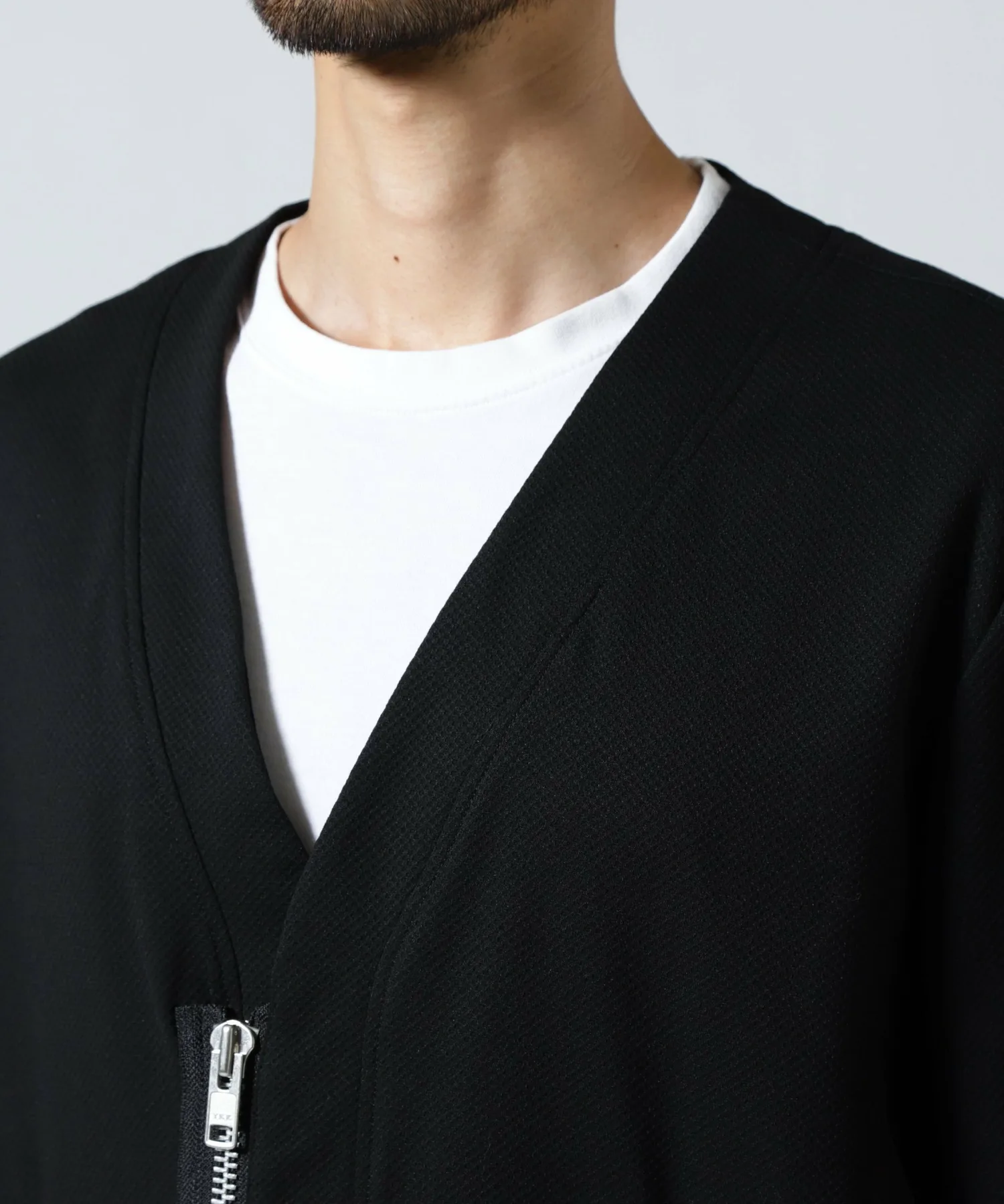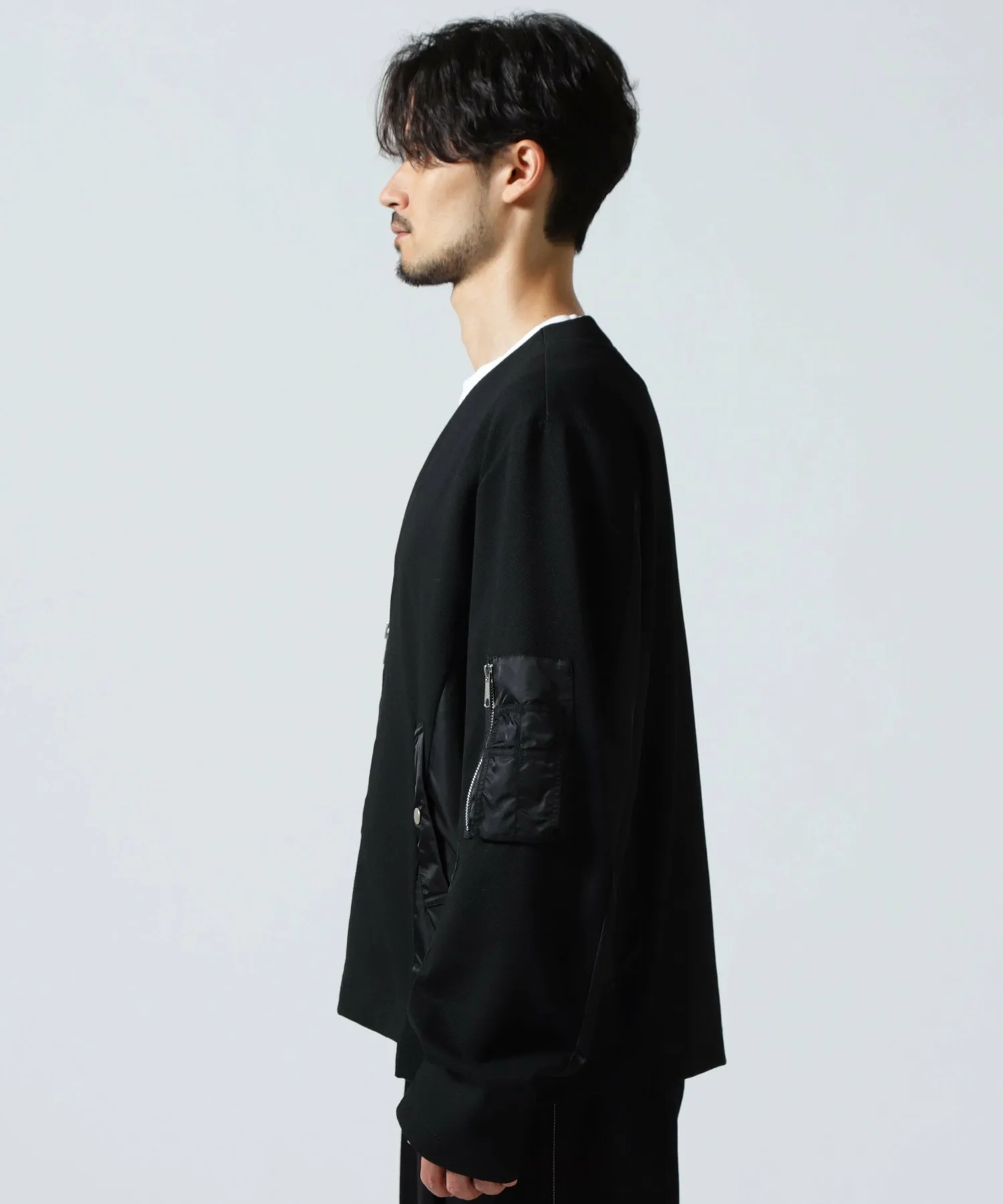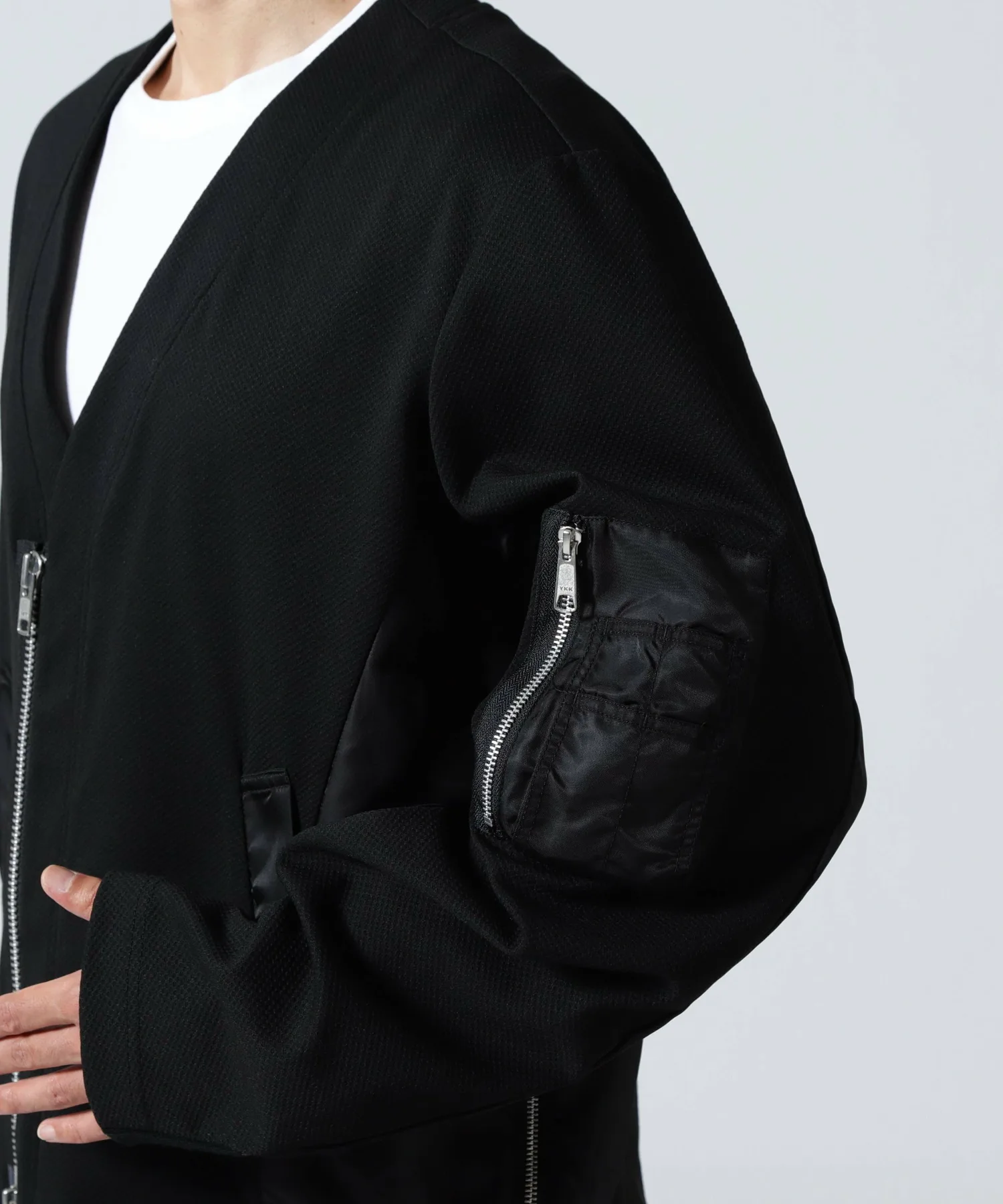 Этот кардиган выполнен в стиле милитари, с нейлоновой вставкой от основной части до рукавов, что создает впечатление куртки.