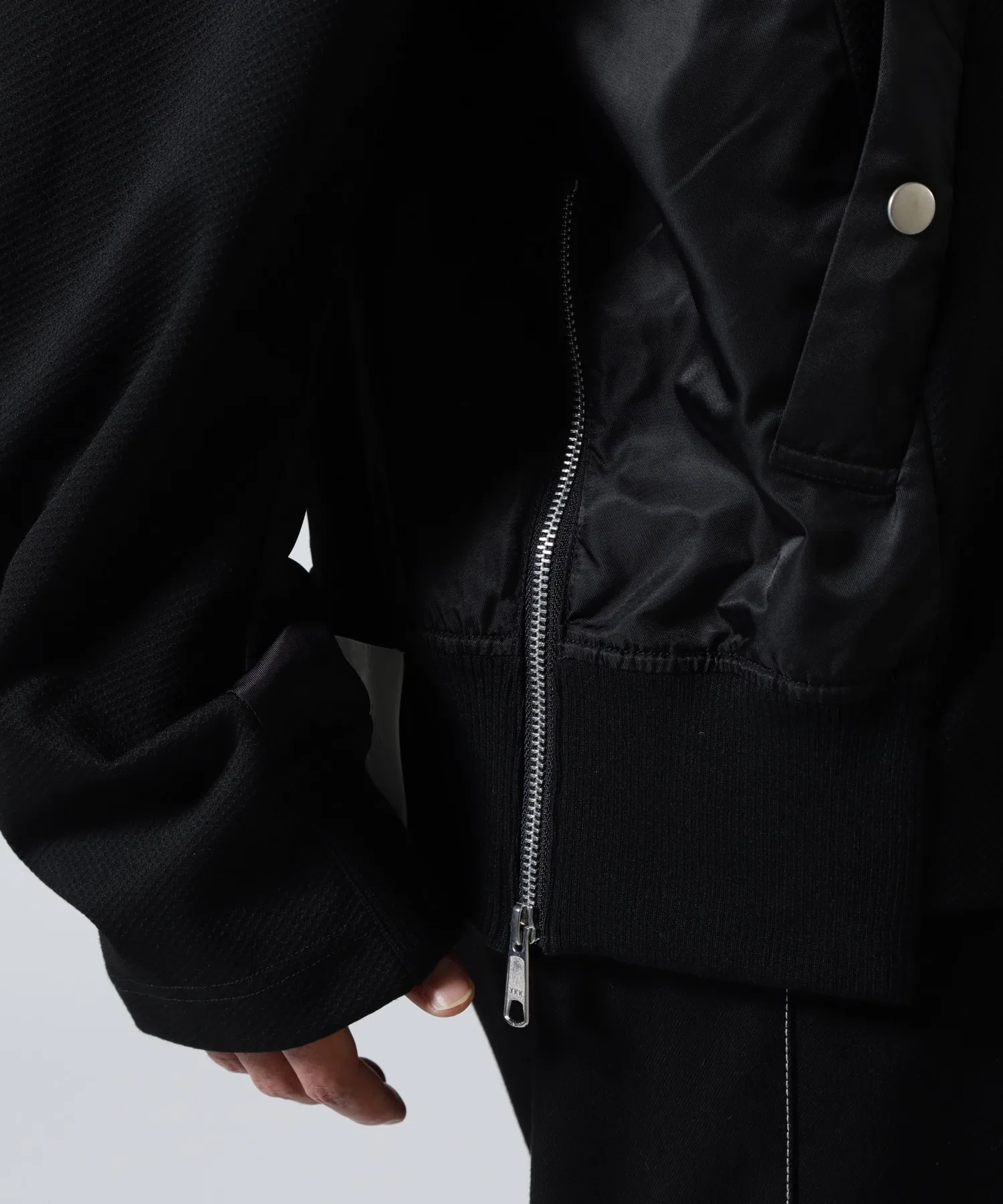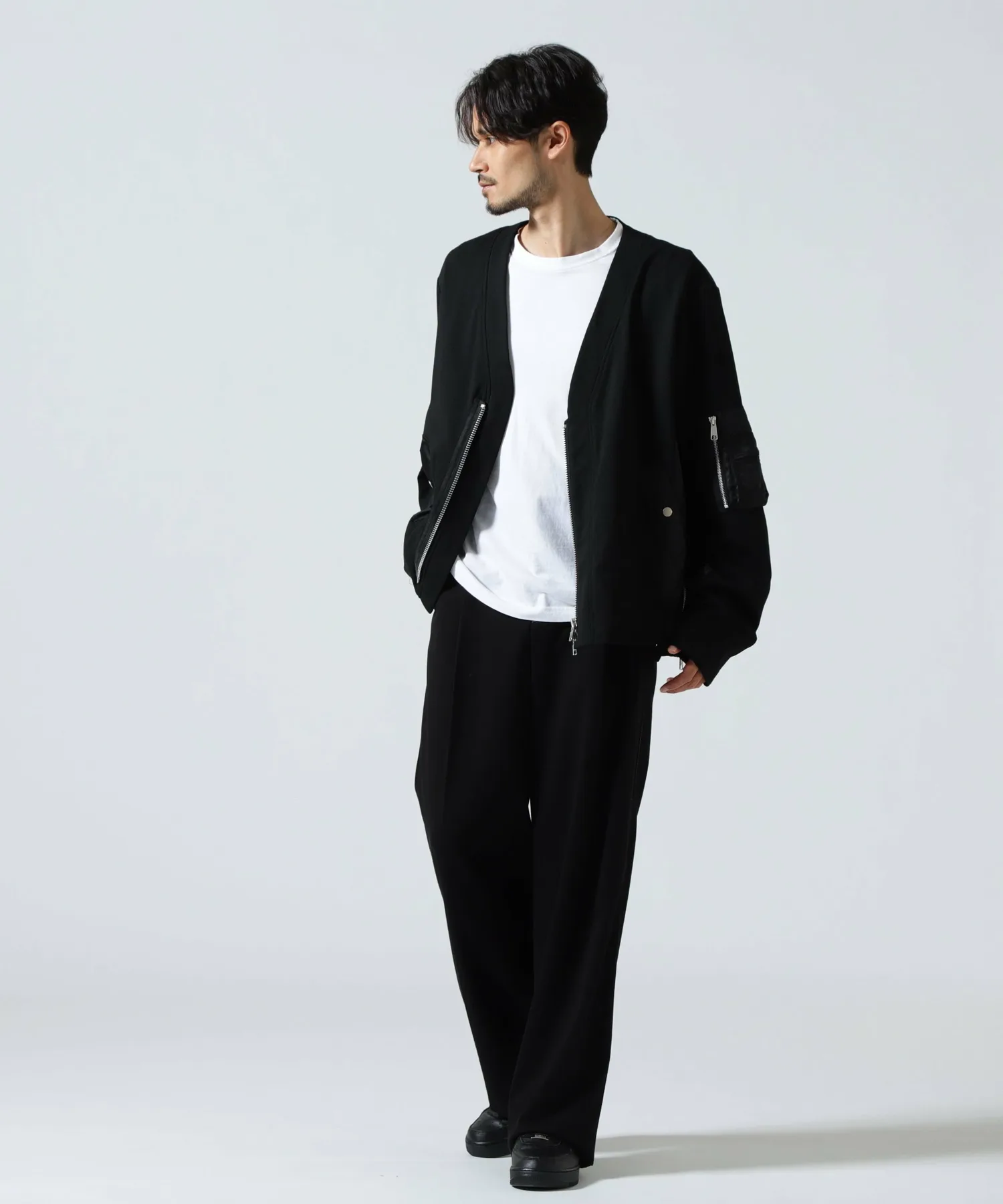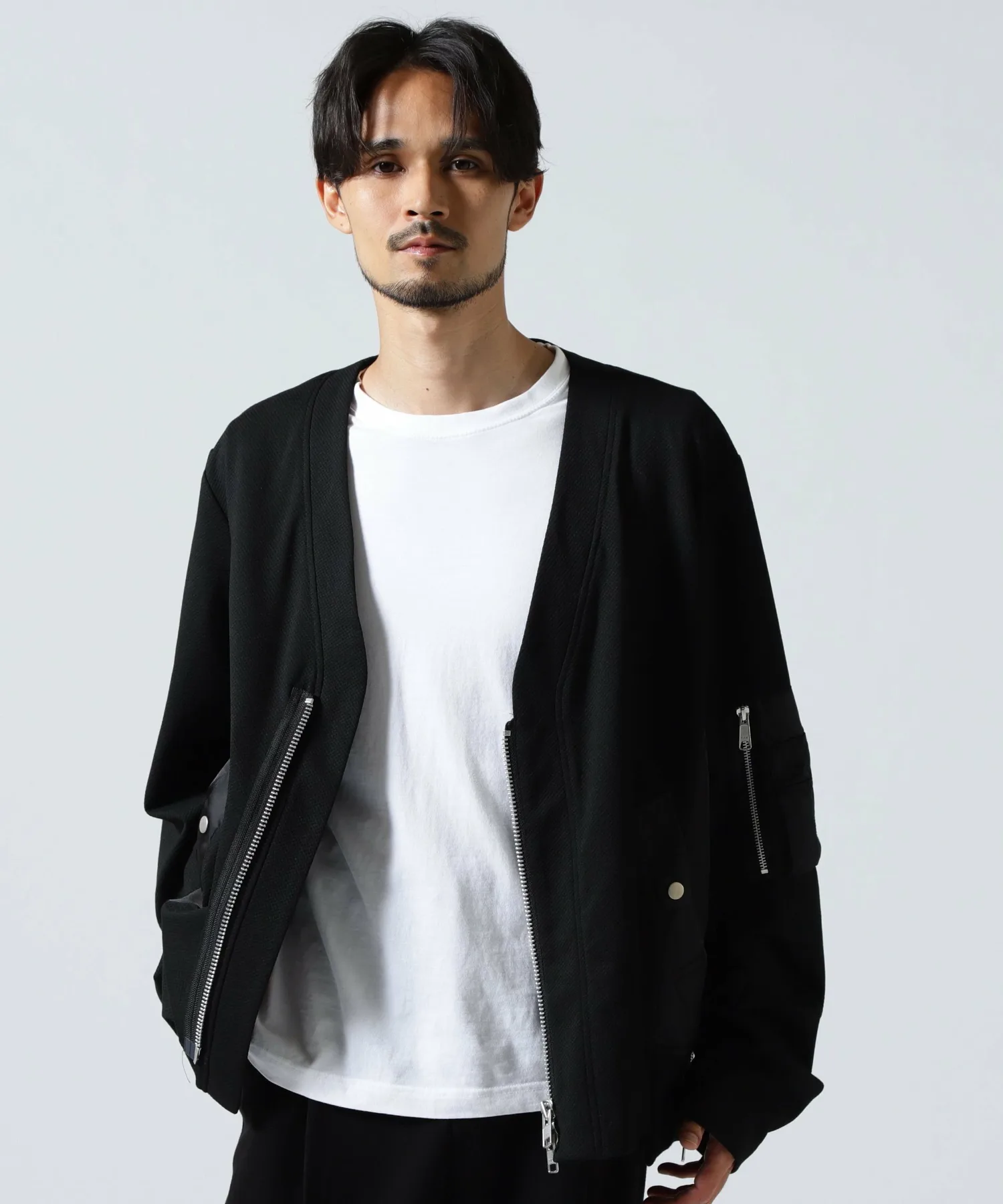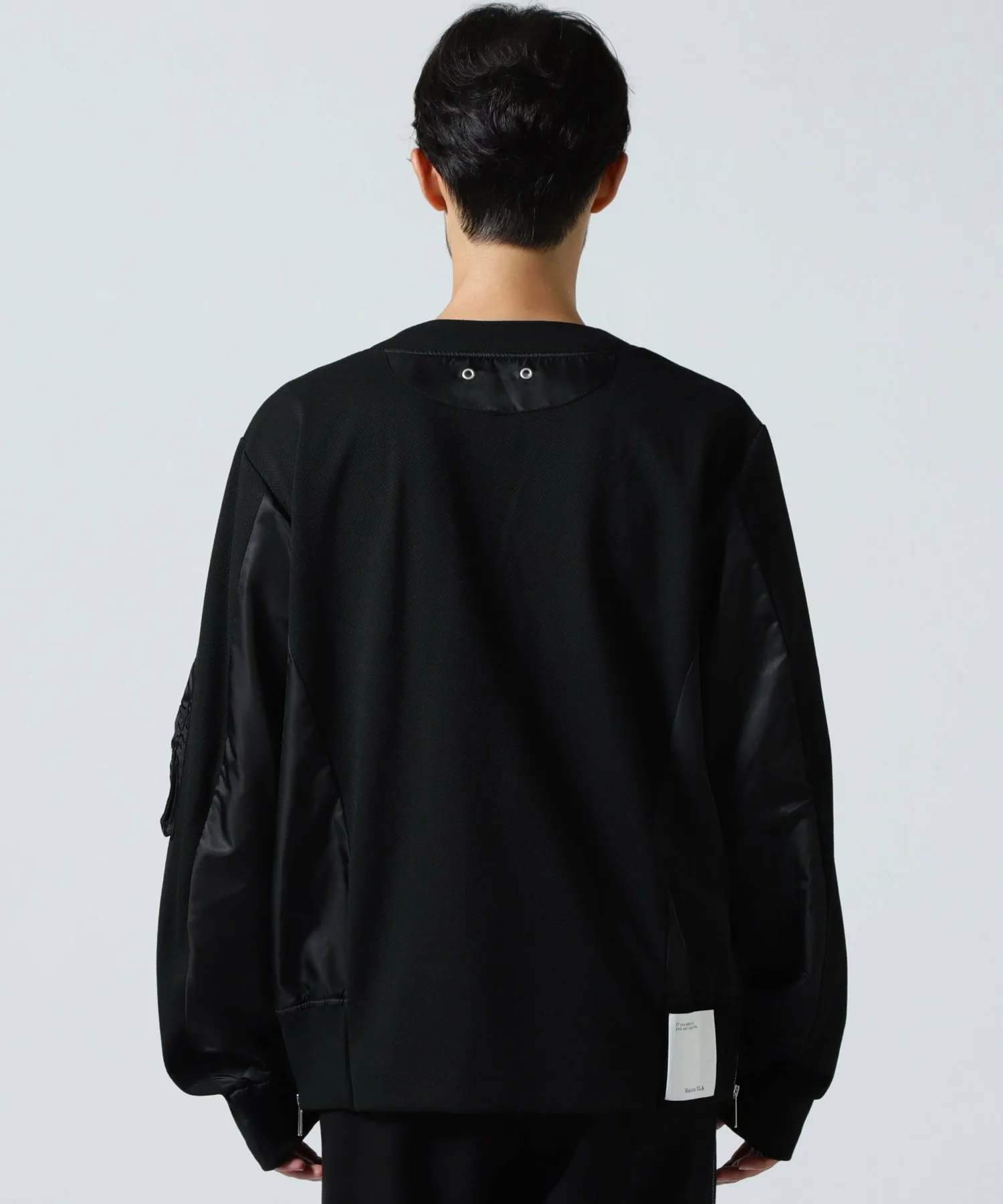 Этот кардиган выполнен в стиле милитари, с нейлоновой вставкой от основной части до рукавов, что создает впечатление куртки.