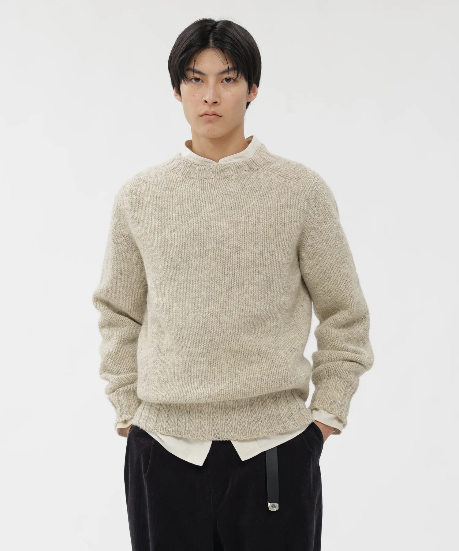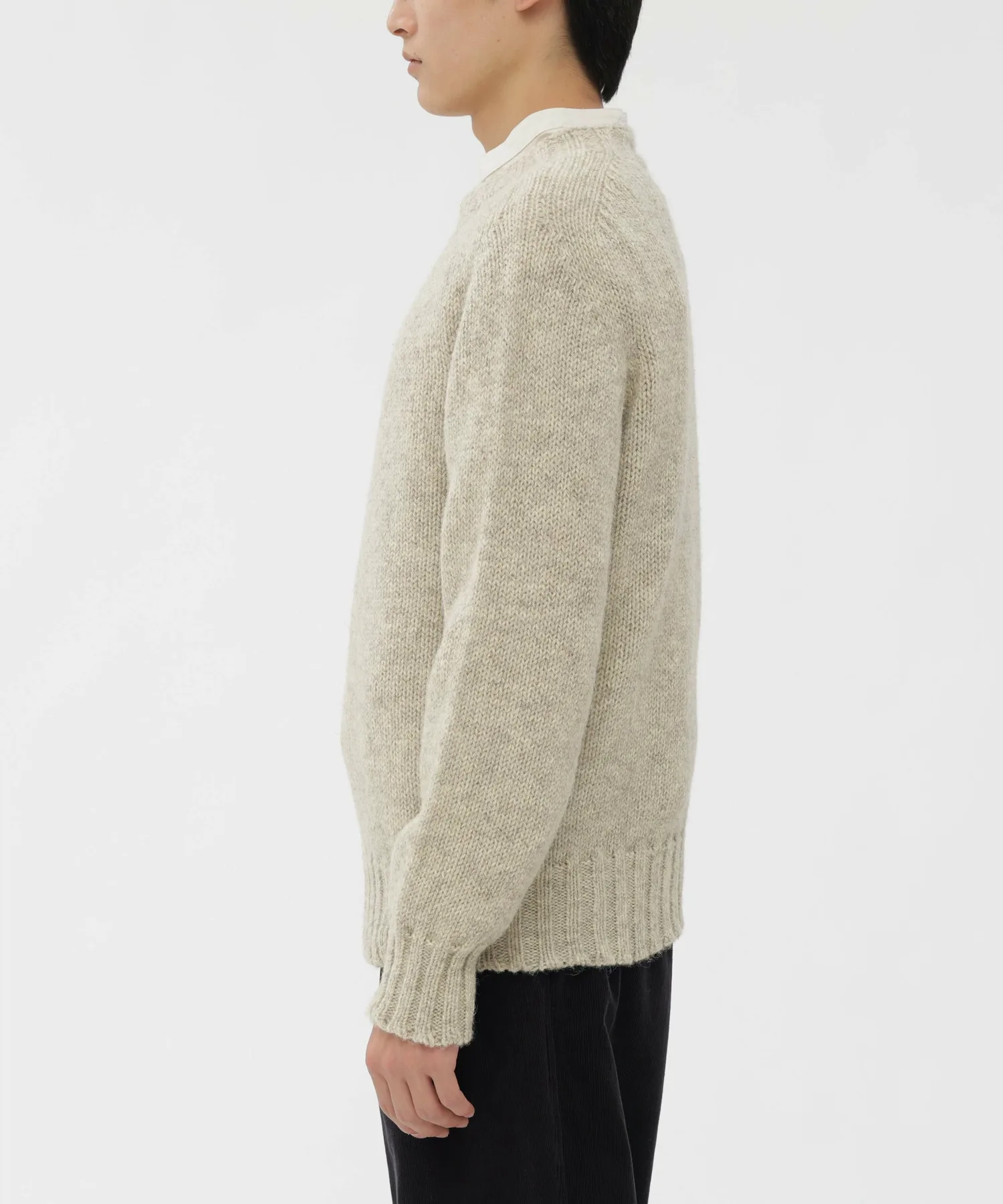 Трикотажное изделие из прочной британской шерсти. Естественная текстура неокрашенного материала привлекательна, а функциональная красота сочетает в себе воздухопроницаемость и сохранение тепла. Вся эта вещь тщательно связана на старинной шотландской трикотажной фабрике (HARLEY) и отличается мягкостью, достигаемой без чрезмерного напряжения пряжи.