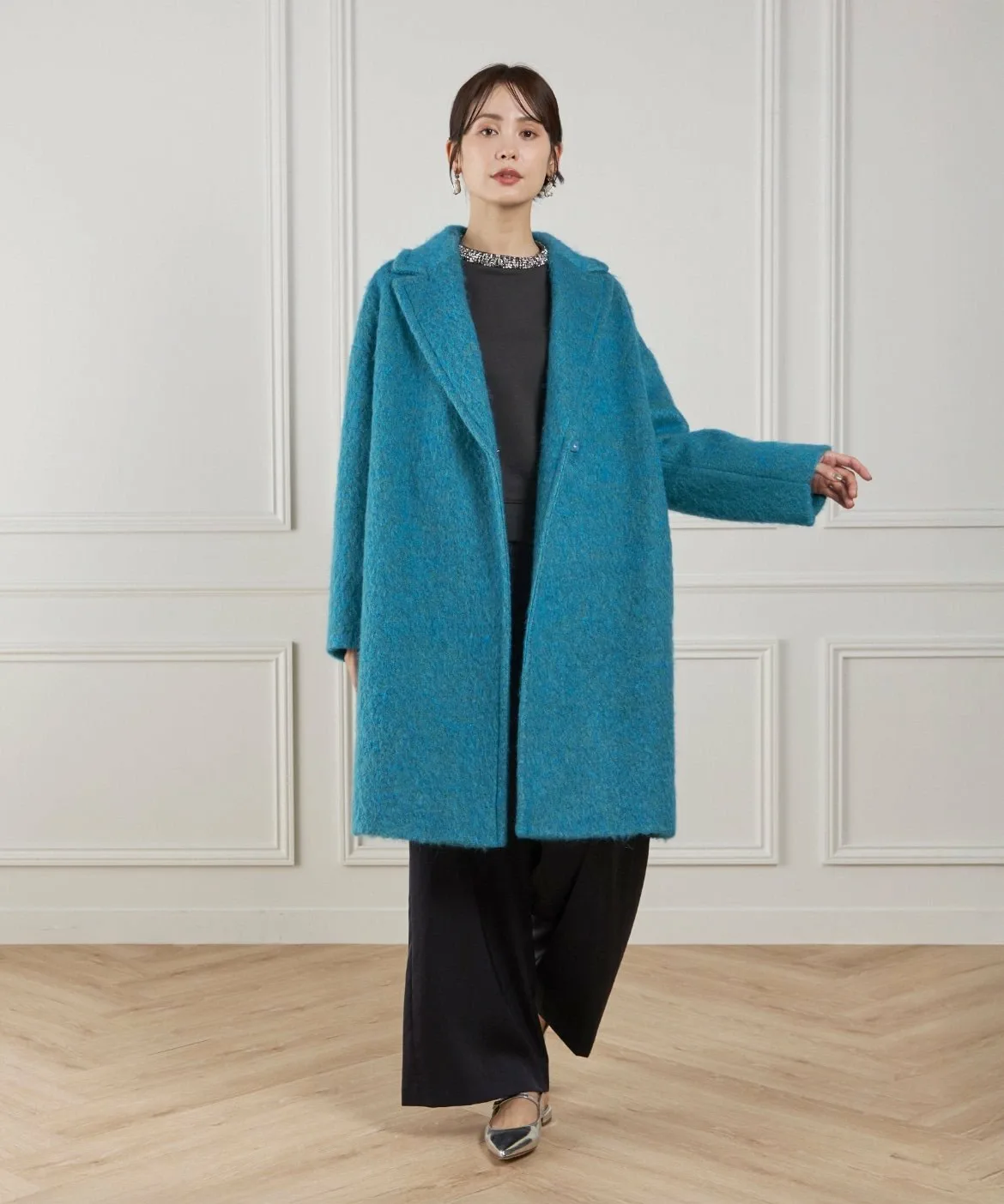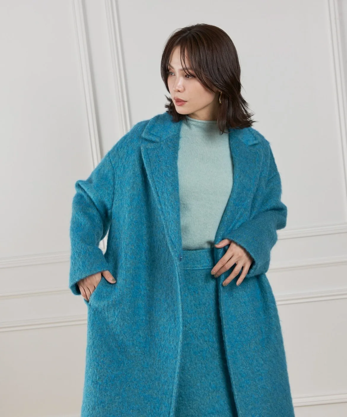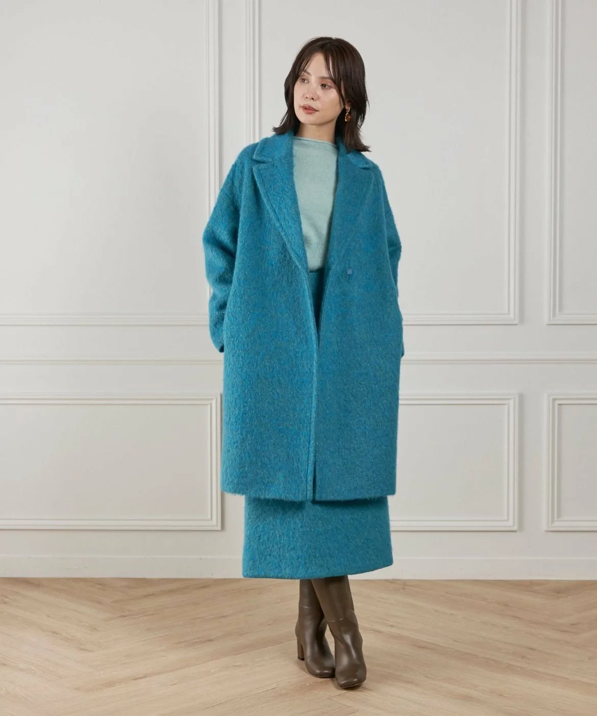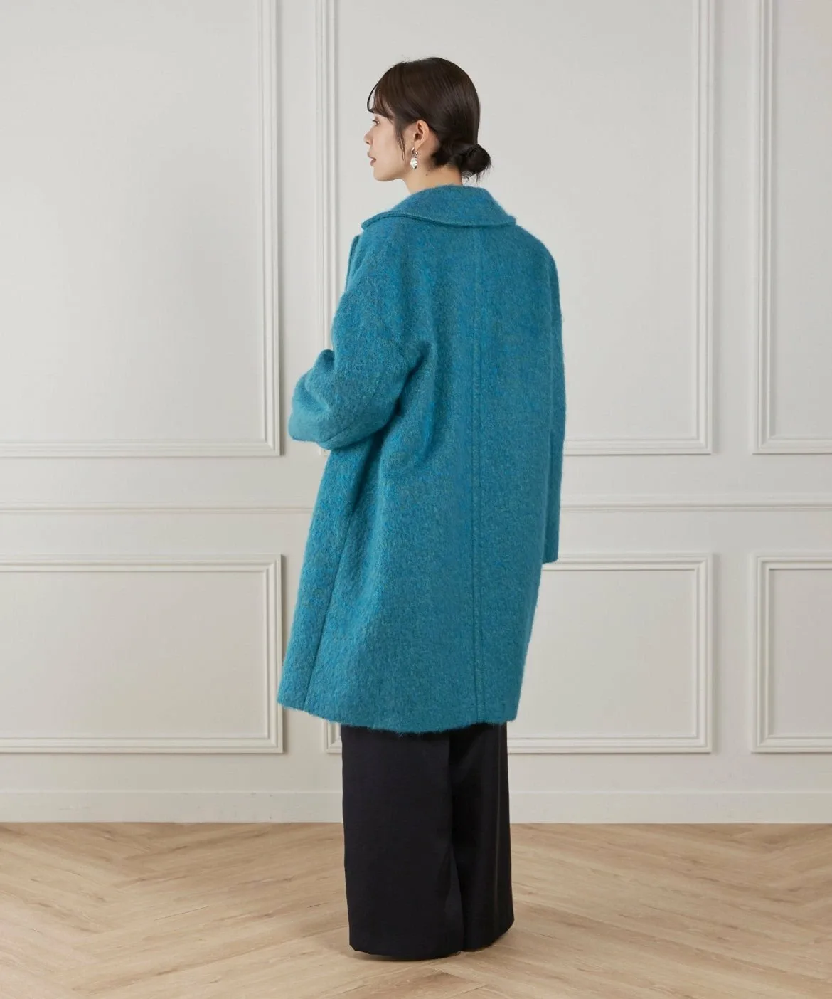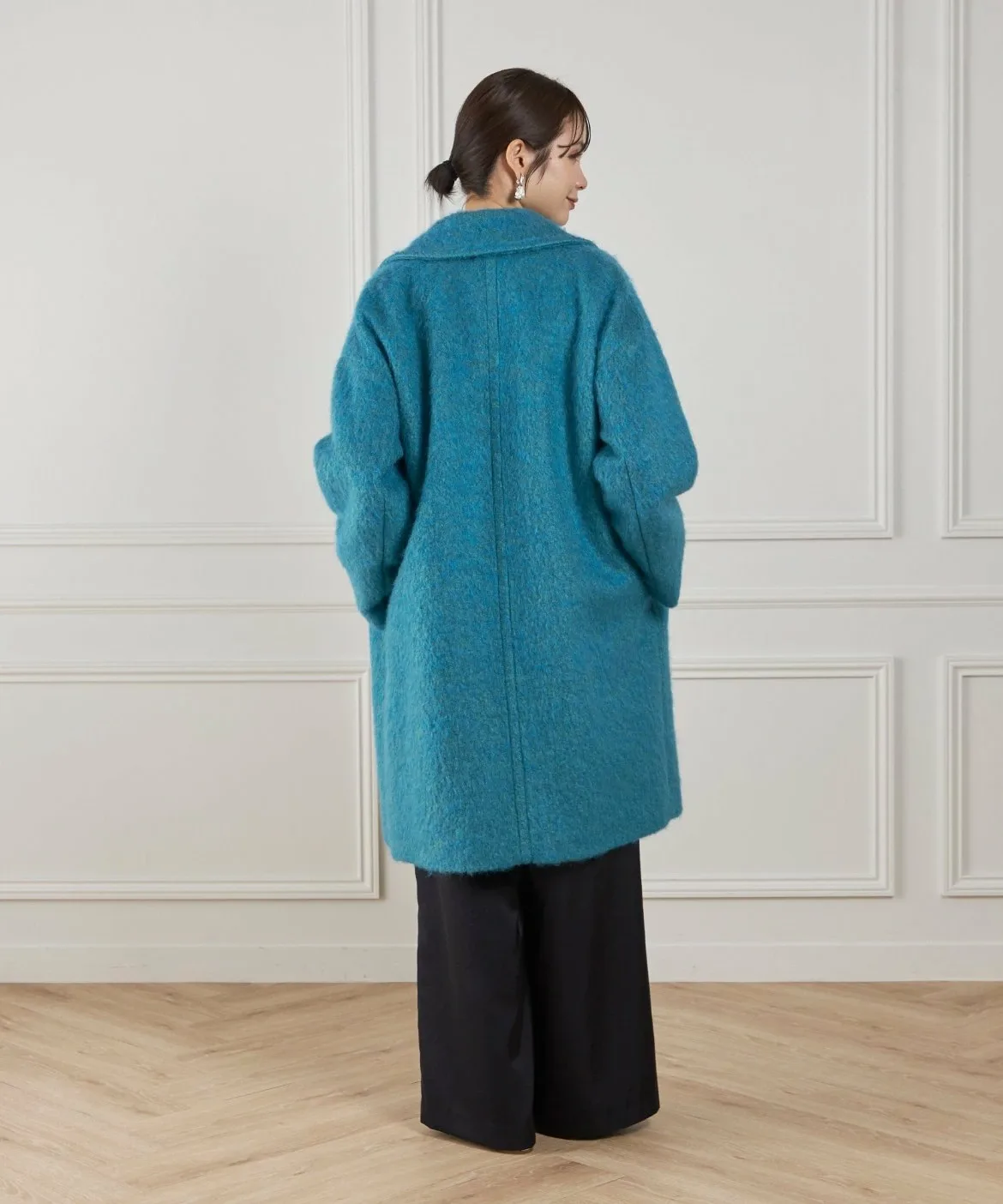 Материал этого пальто отличается впечатляющей текстурой мохера и насыщенным цветом. Изготовлено из высококачественного необработанного мохера и выразительной петлевой пряжи. Петлевая пряжа нарезается таким образом, чтобы создать уникальный поток, в результате чего получается богатая выразительная отделка, с использованием процесса, называемого «петлевая нарезка ворса». Глубокий цвет, созданный окрашиванием в два разных цвета, и чрезвычайно легкая и пушистая текстура также являются ключевыми особенностями. Это ткань отечественного производства, все процессы прядения, вязания и обработки выполняются внутри страны.