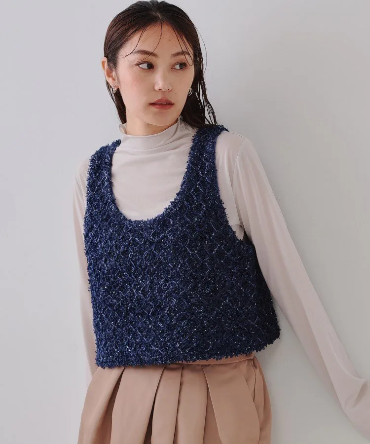 - Короткий вязаный бюстье с пайетками и узорчатой вязкой.