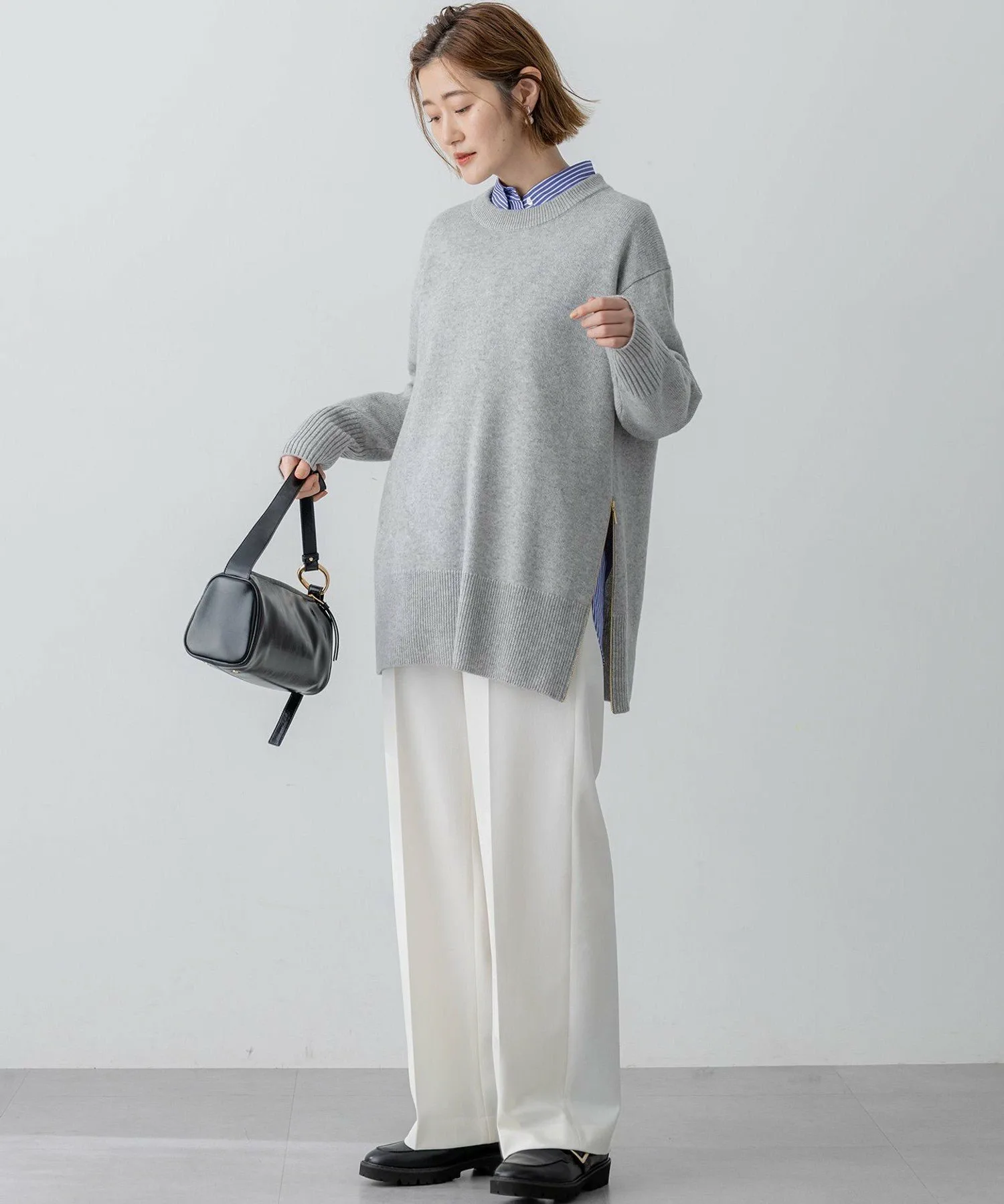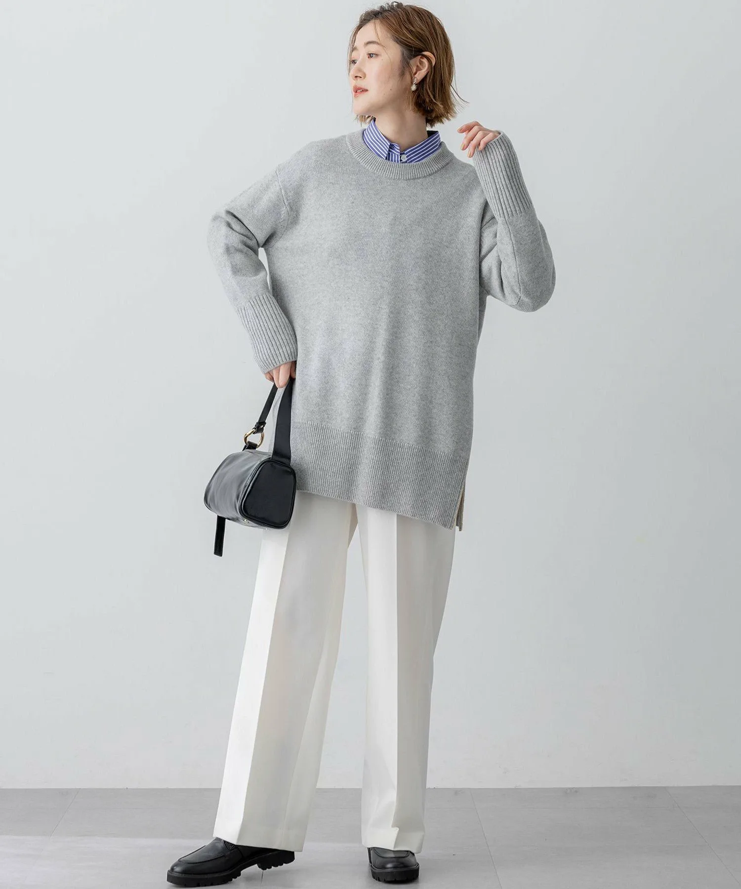 В нашу популярную серию из кашемировой смеси добавлена новая туника-пуловер. Свободный силуэт обеспечивает достаточное покрытие бедер, гарантируя комфортную посадку, которую оценят зрелые женщины. Сочетая роскошное тепло с расслабленным кроем, эта вещь идеально подходит для повседневной носки. Боковая молния может быть открыта или закрыта, создавая различные силуэты и предоставляя множество возможностей для создания стильных образов. Застегните молнию для аккуратного вида или оставьте ее открытой, чтобы создать разрез для более расслабленного ощущения. Эта универсальная вещь дополняет широкий спектр нарядов, от повседневных стилей с узкими брюками или леггинсами до стильных выходов с юбкой. Доступна в четырех цветах: повседневный светло-серый (#003), изысканный серый (#004), мягкий бежевый (#033) и освежающий светло-зеленый (#062). Материал