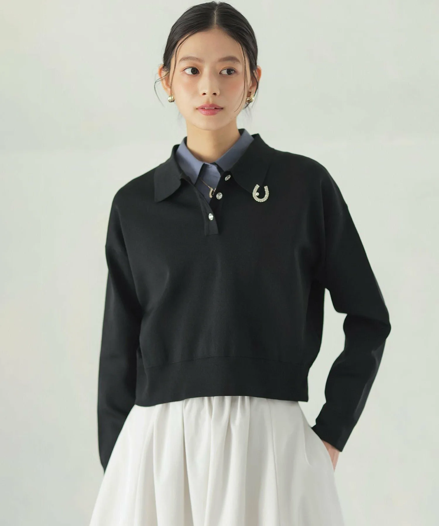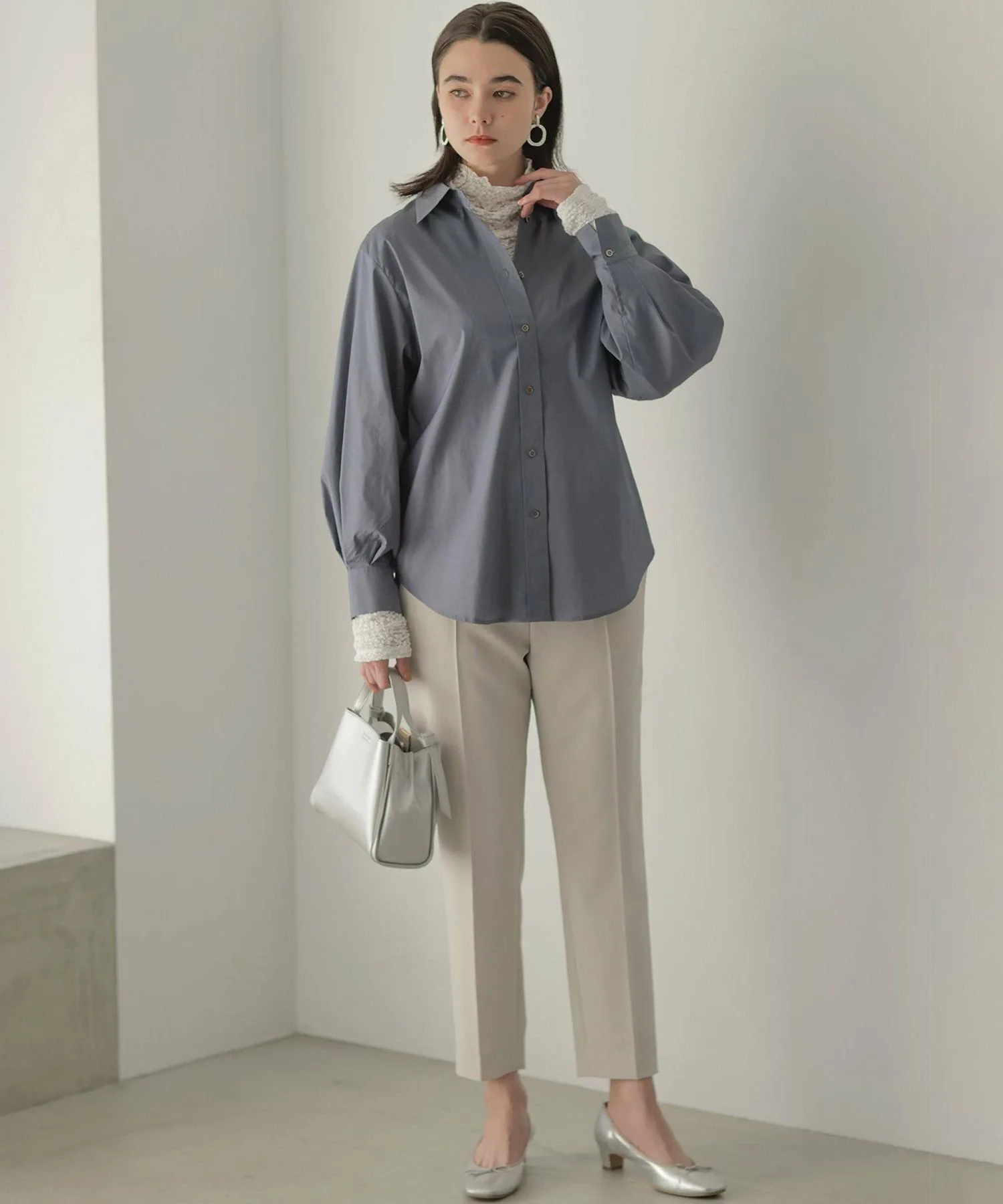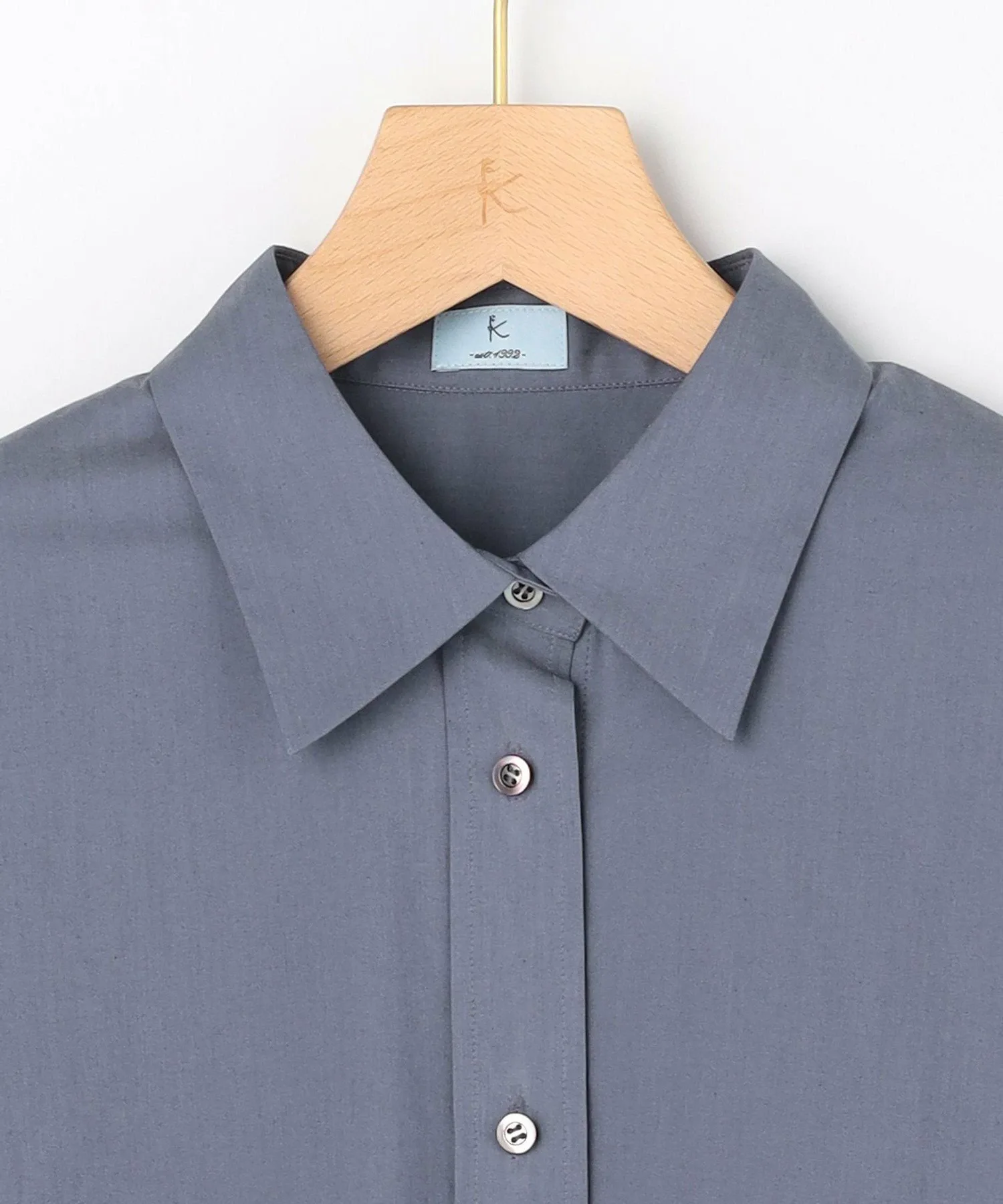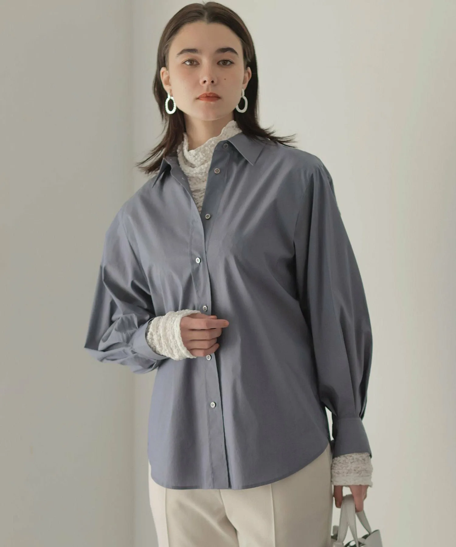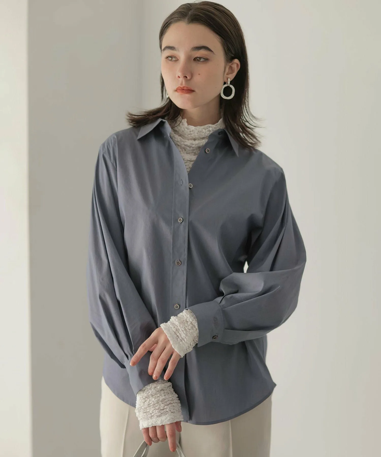 Дизайн: Объемная рубашка с умеренным силуэтом и округлым кроем. ・Рекомендуем сочетать рукава с рукавами свободного кроя. Объем, напоминающий воздушный шар, выглядит привлекательно. ・Мягкий и легкий материал позволяет легко носить ее с любой верхней одеждой. ・Скрытая вышивка на левой манжете. Этот дизайн призван обеспечить долговечность, поскольку рубашка напоминает лучшего друга. (BFF: Лучший друг навсегда.)