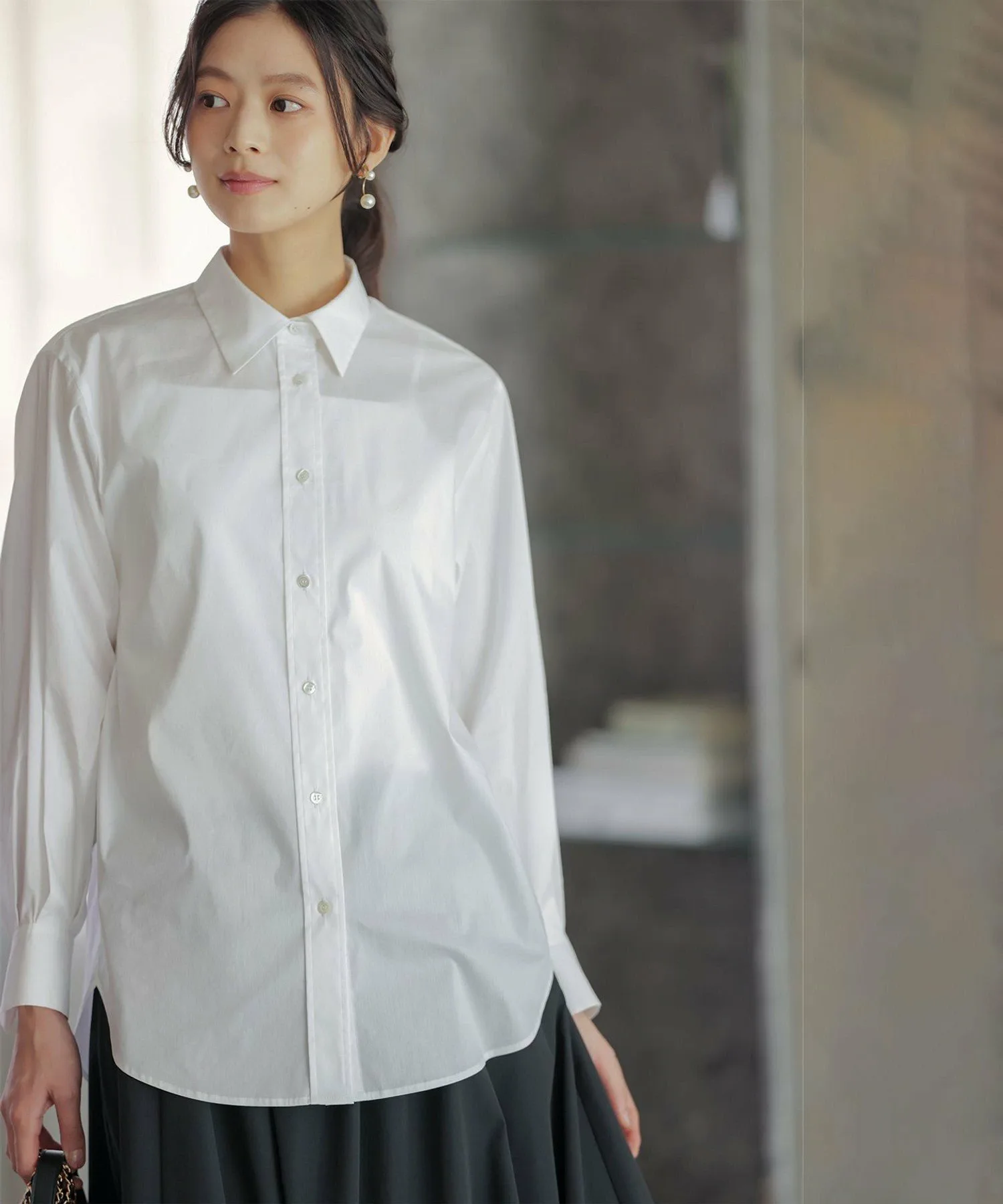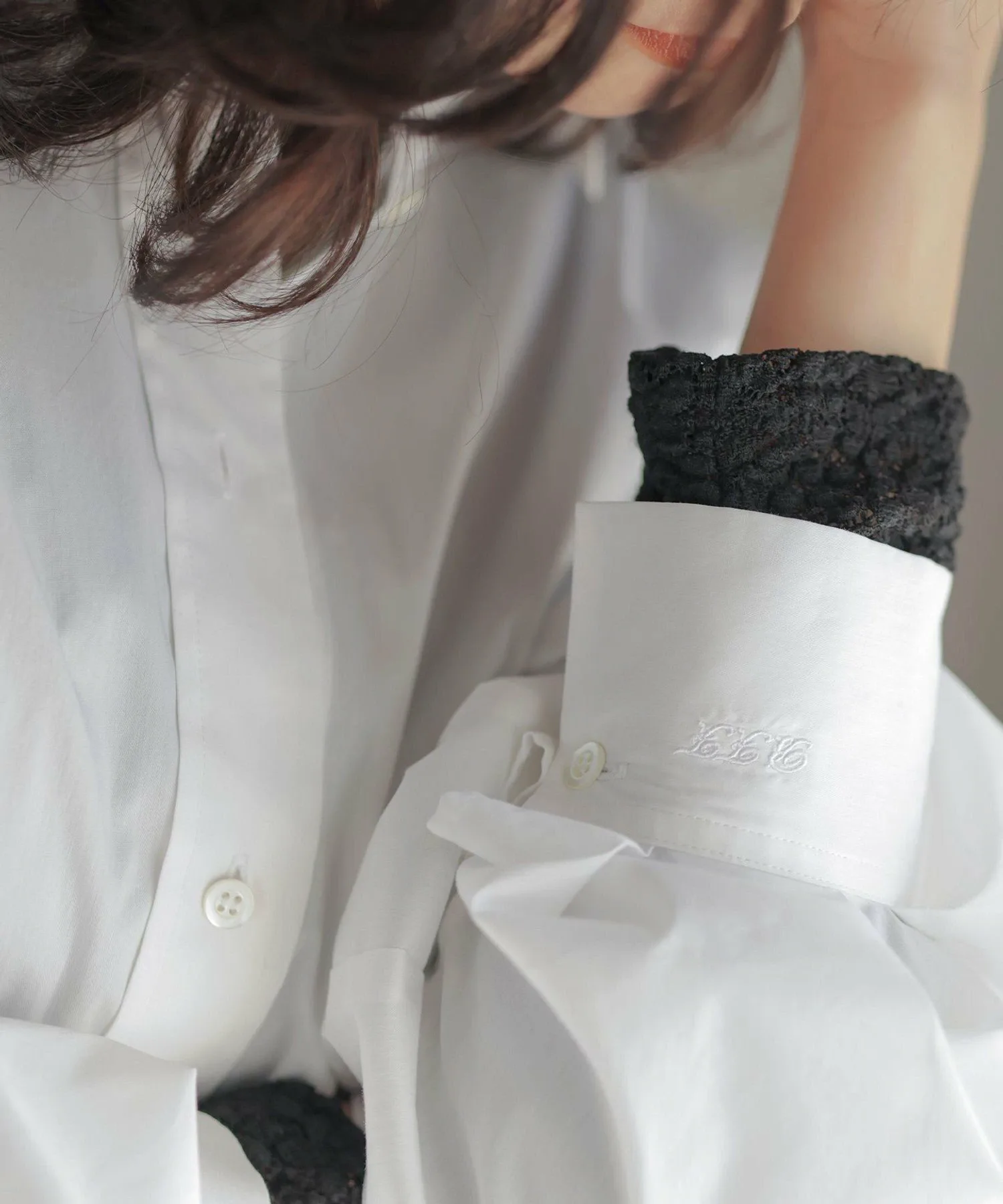 Дизайн: Объемная рубашка с умеренным силуэтом и округлым кроем. ・Рекомендуем сочетать рукава с рукавами свободного кроя. Объем, напоминающий воздушный шар, выглядит привлекательно. ・Мягкий и легкий материал позволяет легко носить ее с любой верхней одеждой. ・Скрытая вышивка на левой манжете. Этот дизайн призван обеспечить долговечность, поскольку рубашка напоминает лучшего друга. (BFF: Лучший друг навсегда.)