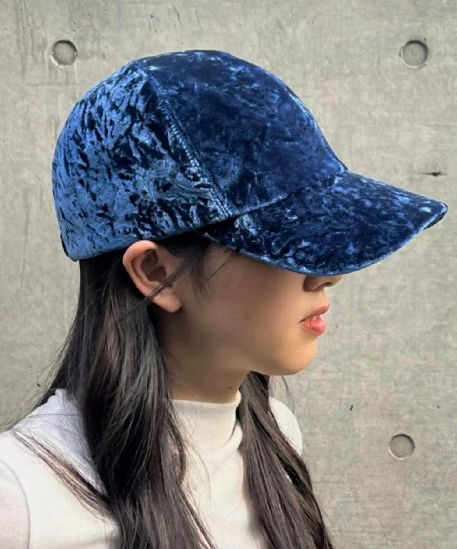 Мятый велюр, меняющий блеск в зависимости от угла обзора, создает модный вид.Задний ремешок имеет присборенную конструкцию, обеспечивающую плотное прилегание и комфорт.Эта кепка имеет изысканный вид, минималистичный, чистый силуэт и не содержит металлических деталей.