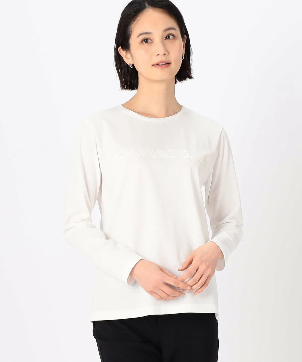 Это пуловер с круглым вырезом и длинными рукавами, украшенный вышивкой пайетками на груди.