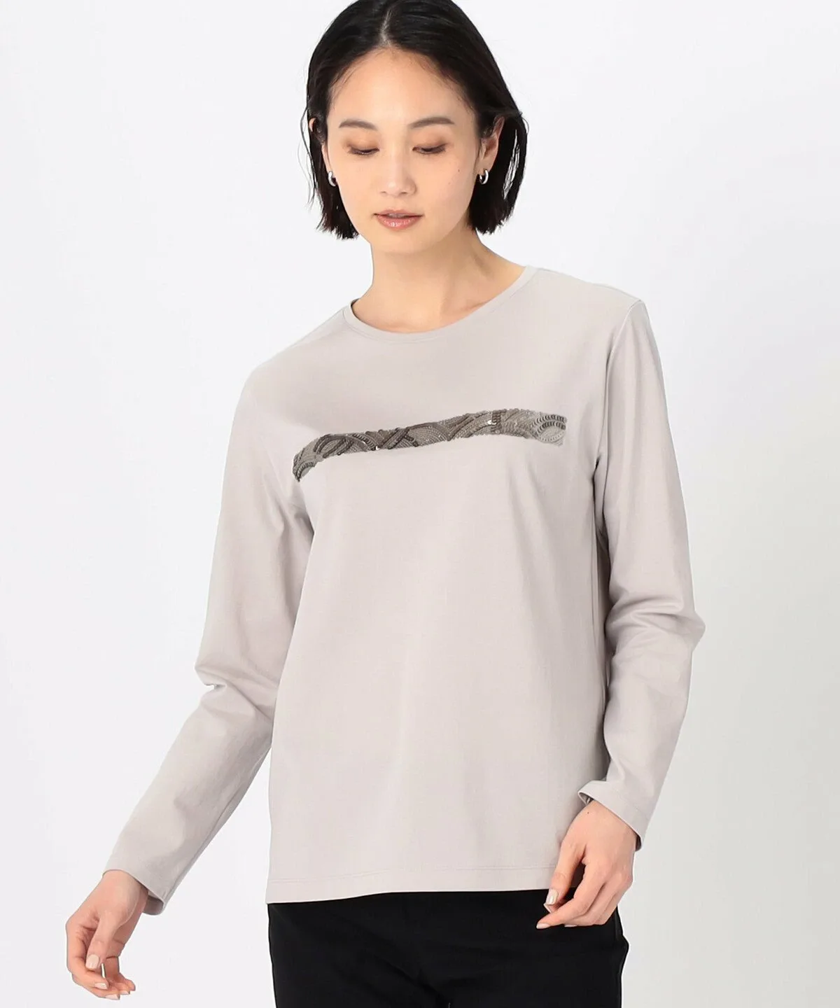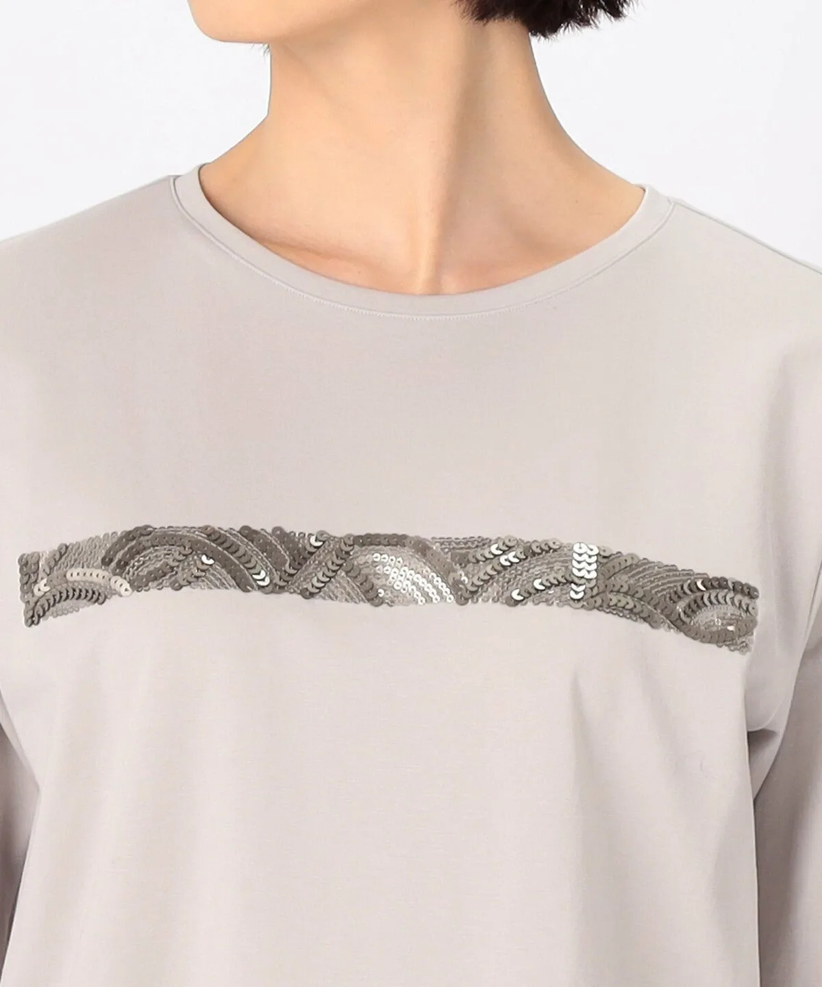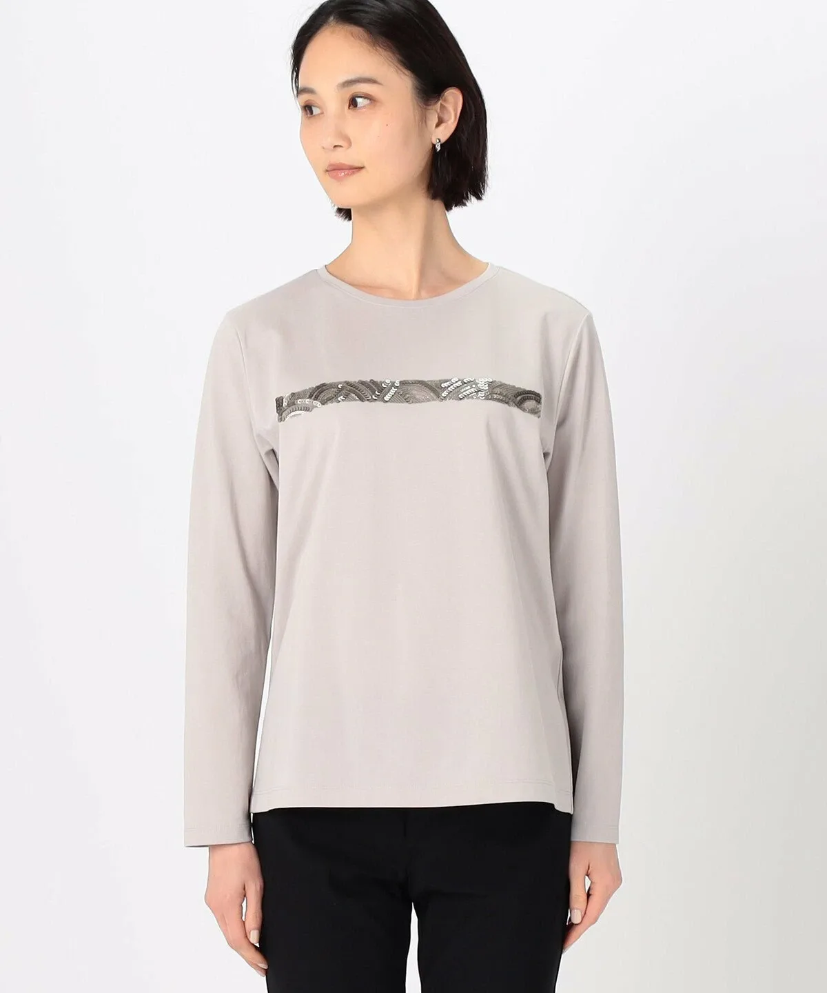 Это пуловер с круглым вырезом и длинными рукавами, украшенный вышивкой пайетками на груди.