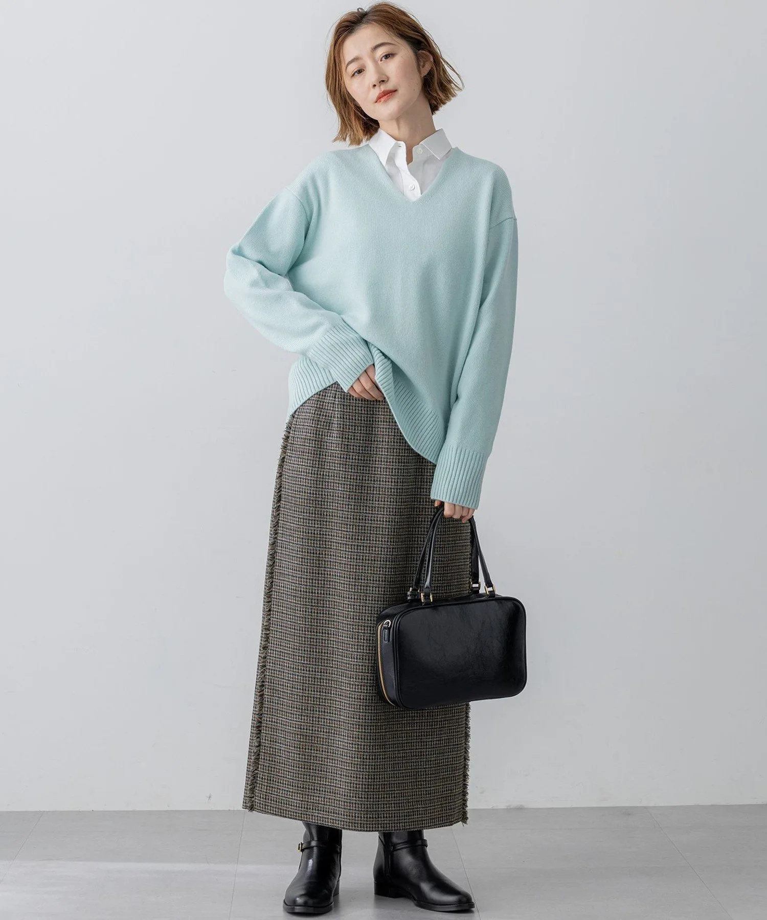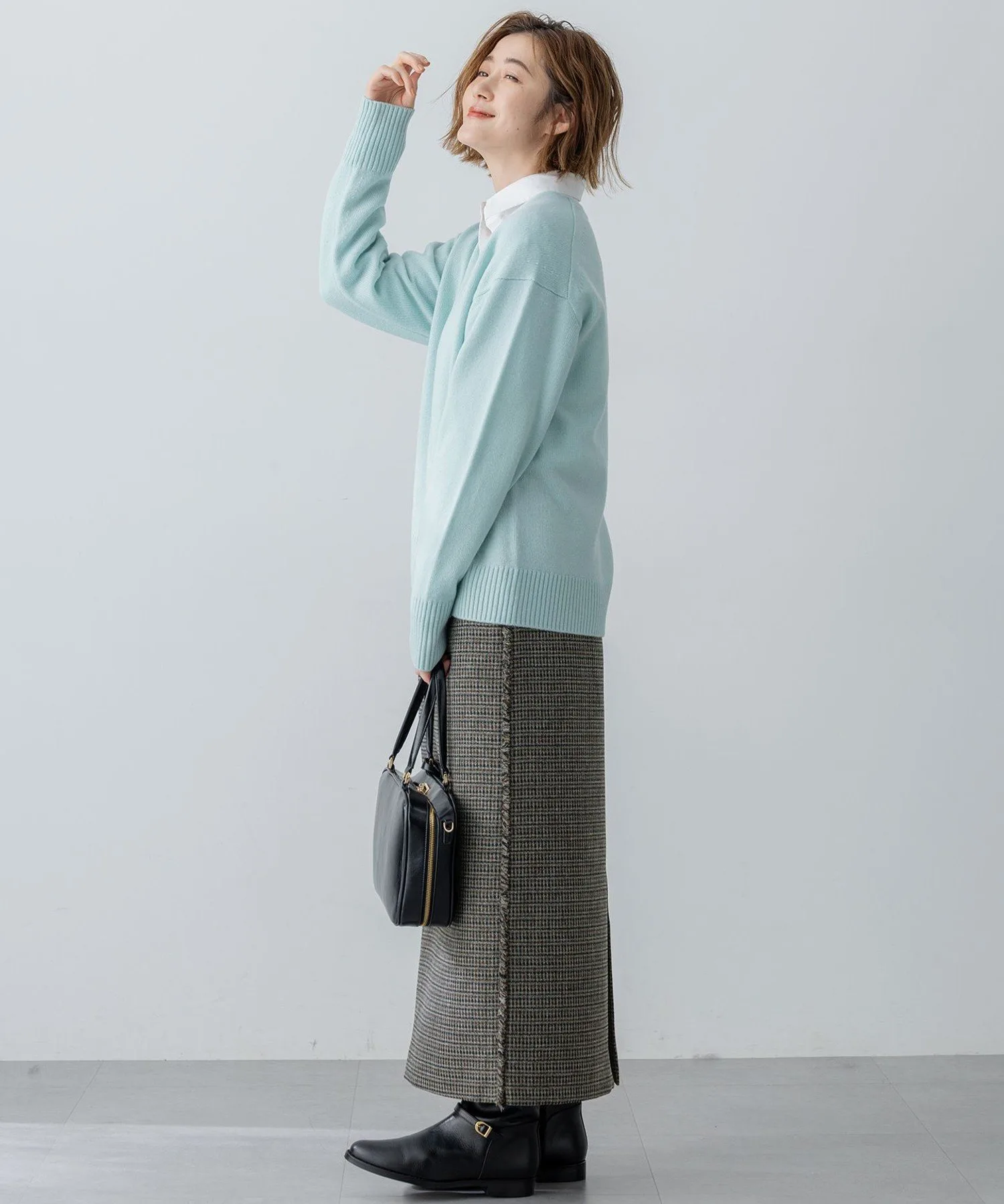 Пуловер без выреза с V-образным вырезом, создающий аккуратный вид вокруг шеи. Несмотря на простой силуэт, дизайн подчеркнут легким расклешением спереди и смелой, привлекательной ребристой отделкой рукавов. Хотя его можно носить и в повседневной жизни, мы также рекомендуем надевать его под низ с футболкой или блузкой для более изысканного образа. Его можно элегантно носить с нарядными брюками в офисе или сочетать с джинсами или расклешенной юбкой в выходные, создавая универсальный образ, излучающий утонченный, женственный стиль. Доступен в семи цветах: чистый и изысканный белый (#001), светло-серый (#003), который хорошо сочетается с любым цветом, серый (#004), который добавляет глубины вашему образу, яркий и женственный пурпурный (#014), мягкий и нежный бежевый (#033), изысканный и утонченный павлиний зеленый (#061) и освежающий и яркий светло-зеленый (#062). Два новых цвета добавлены в сотрудничестве с Ай Миками. Фиолетовый (#080) сочетает в себе яркость и изысканность, а сине-серый (#074) создает утонченный образ, что делает их идеальными акцентными цветами для вашего осенне-зимнего гардероба.