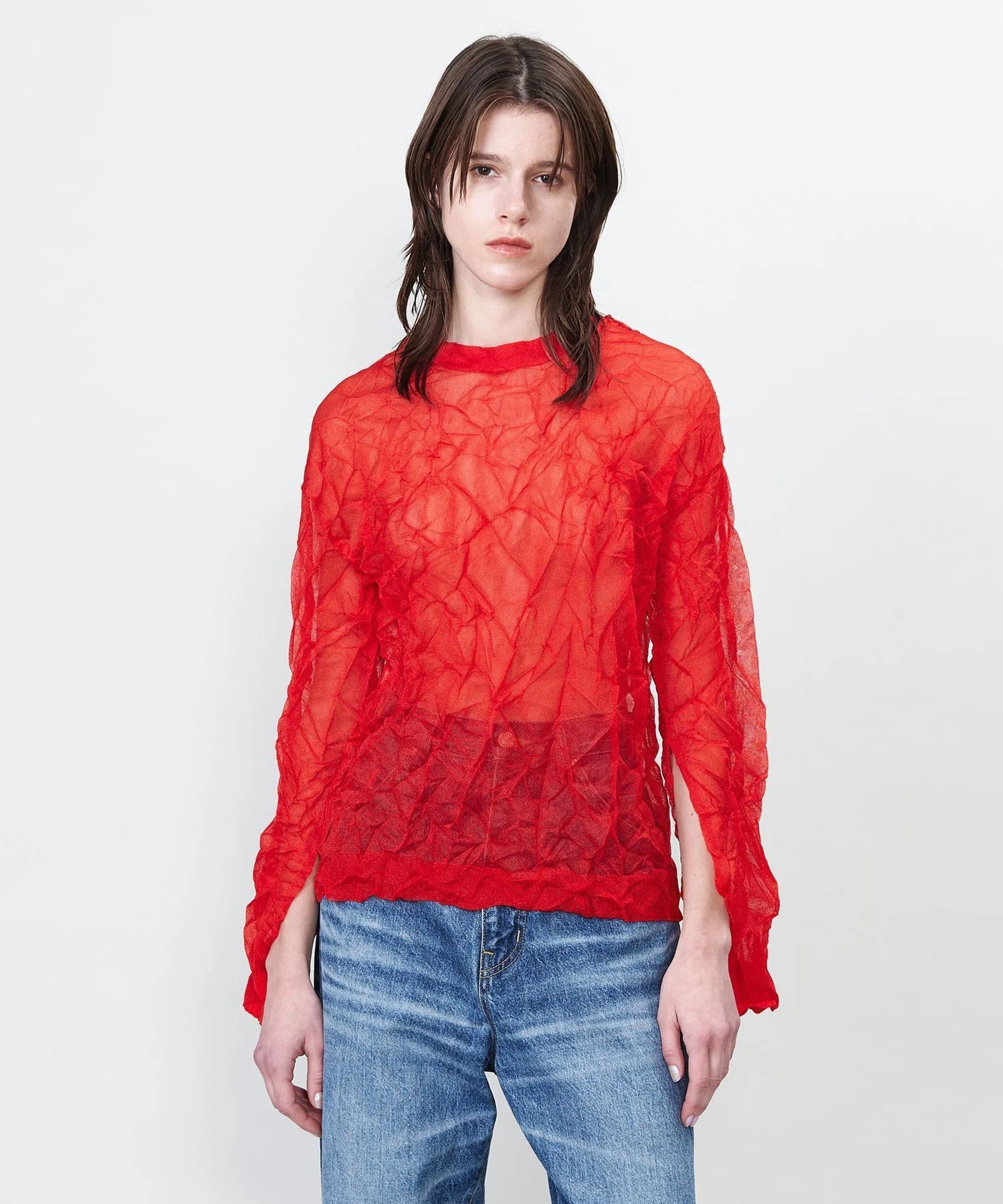 Трикотажная блузка с длинными рукавами и эффектным дизайном, с разрезами на манжетах и мятой отделкой.
