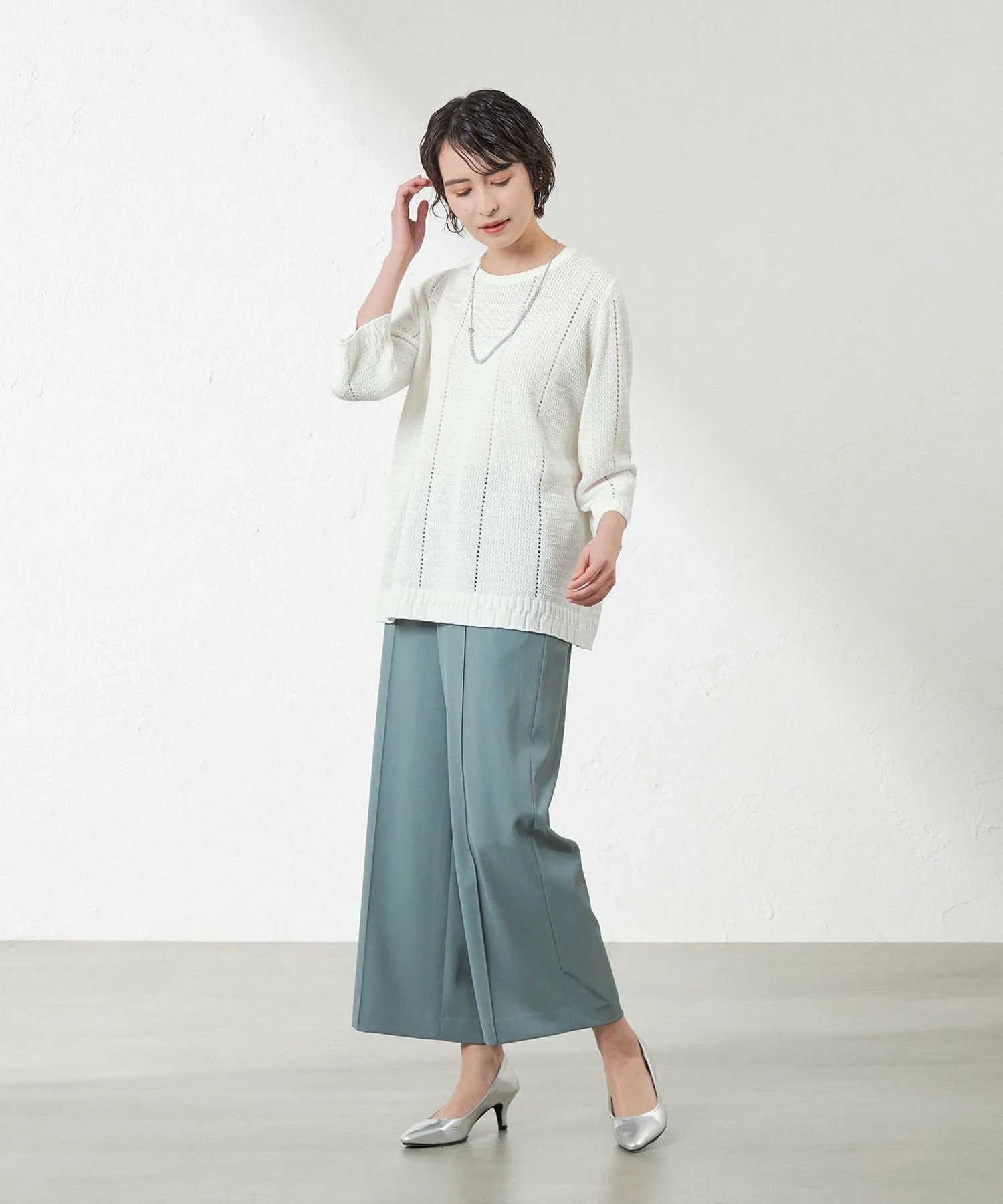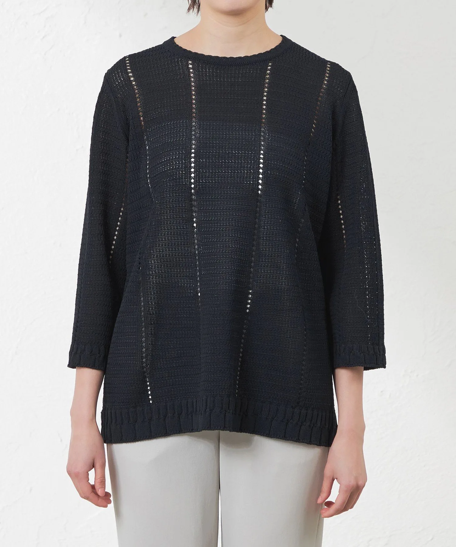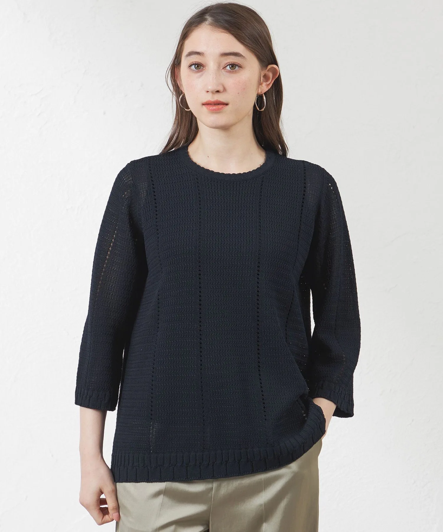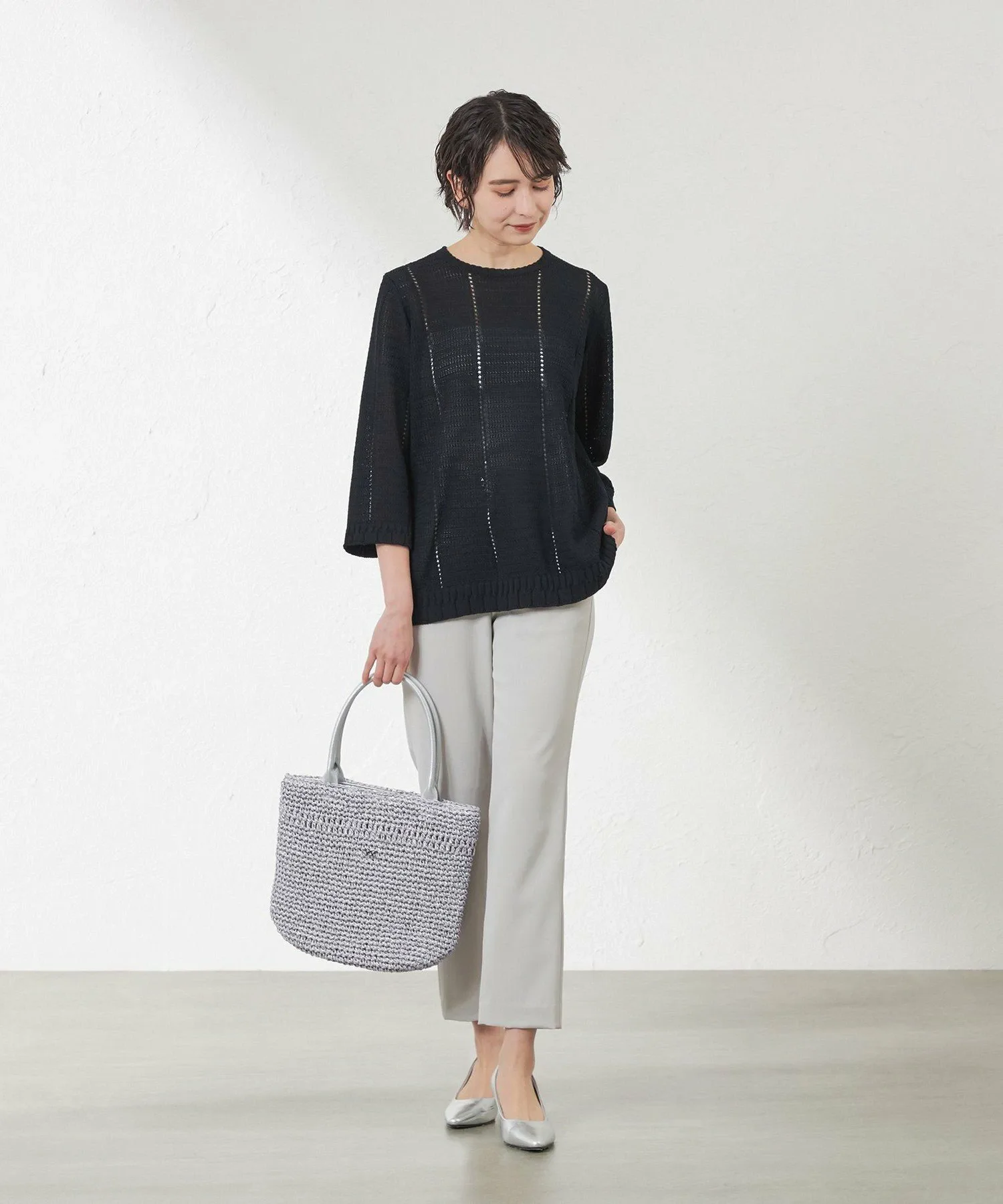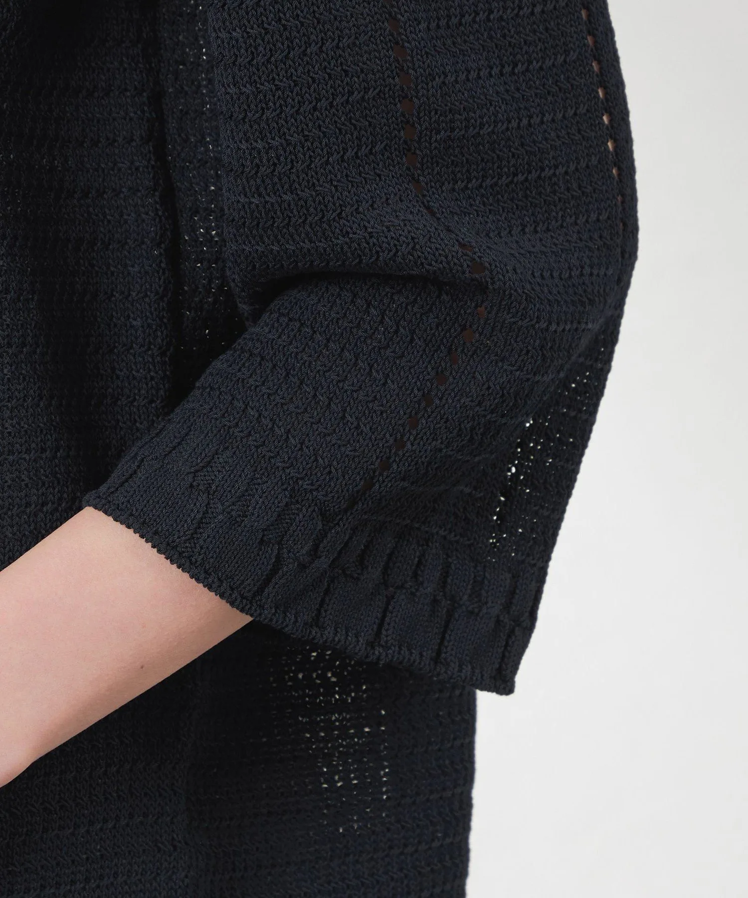 ※В связи со специальным методом вязания, пожалуйста, стирайте вручную и растягивайте изделие вертикально и горизонтально перед сушкой. Рост: 164 см, Обхват груди: 76 см, Обхват талии: 60 см, Обхват бедер: 89 см, Размер одежды: 38