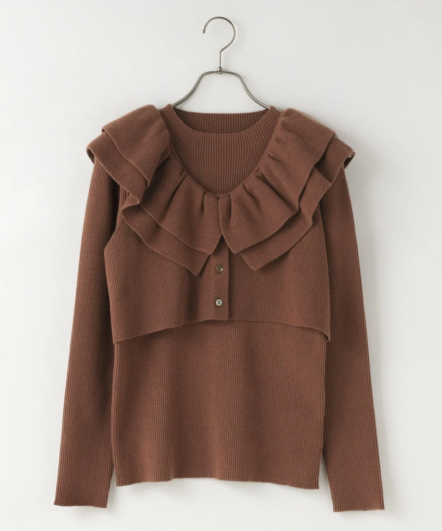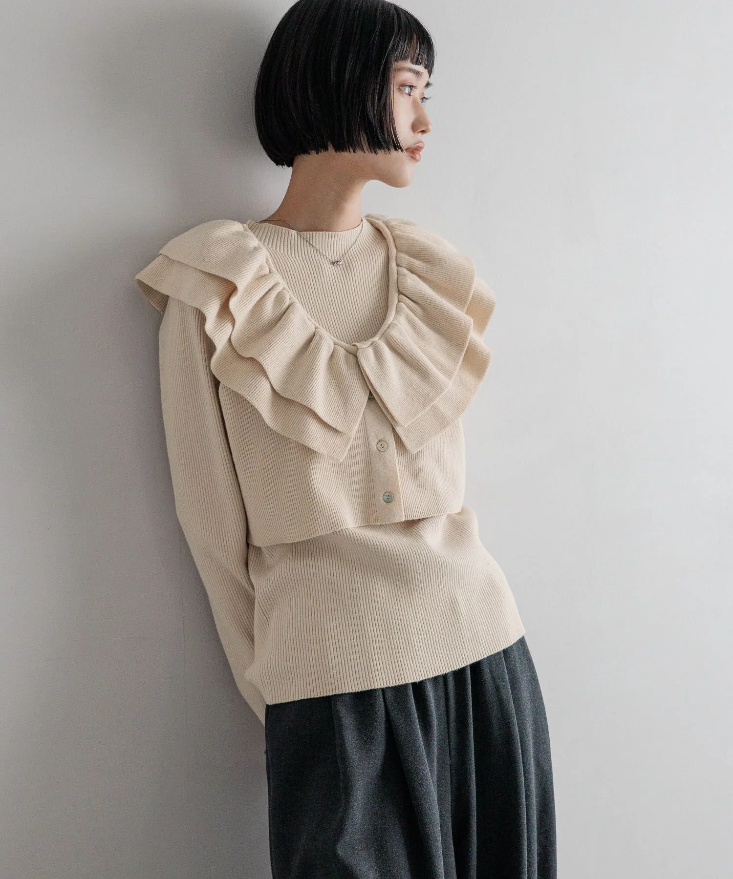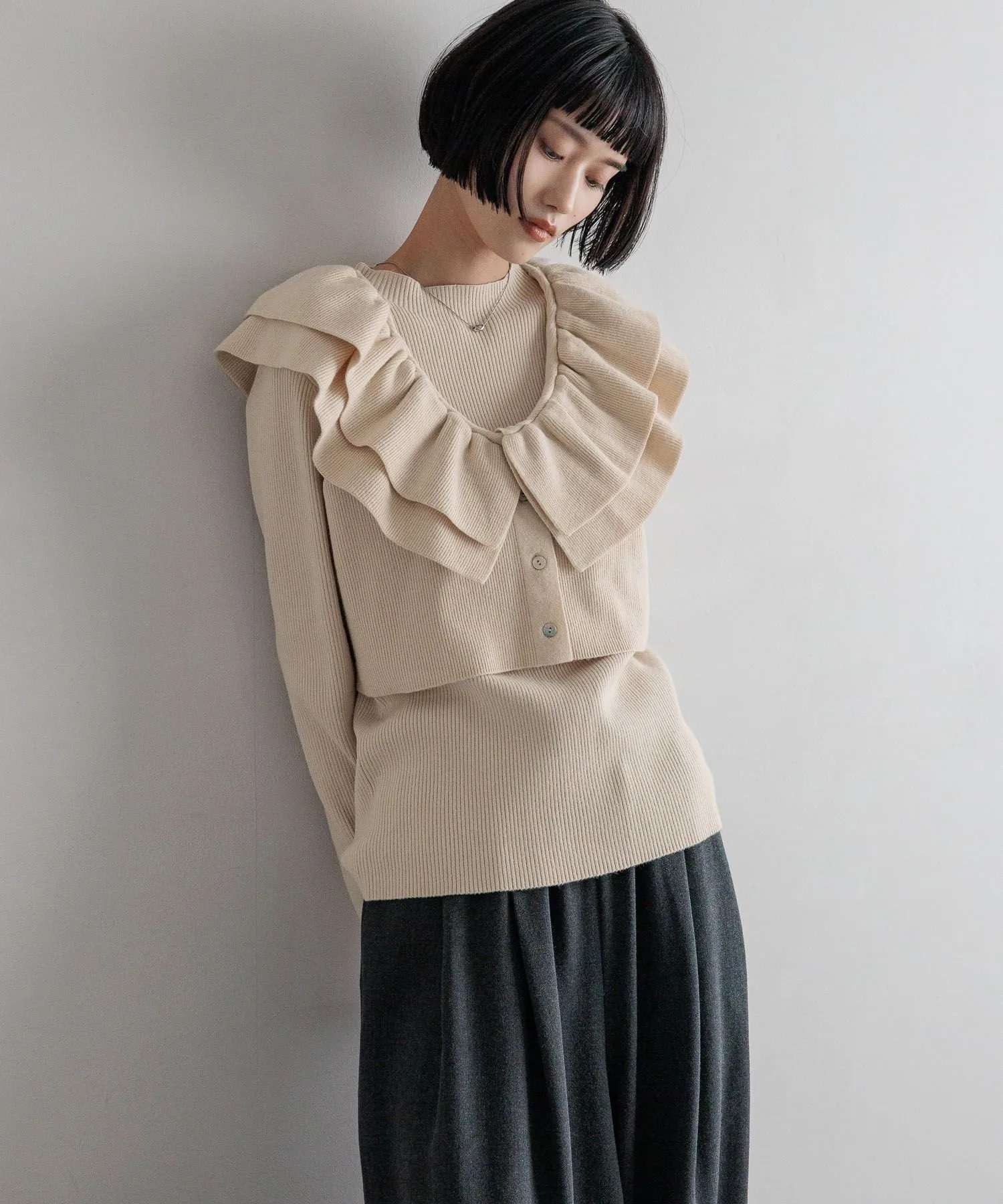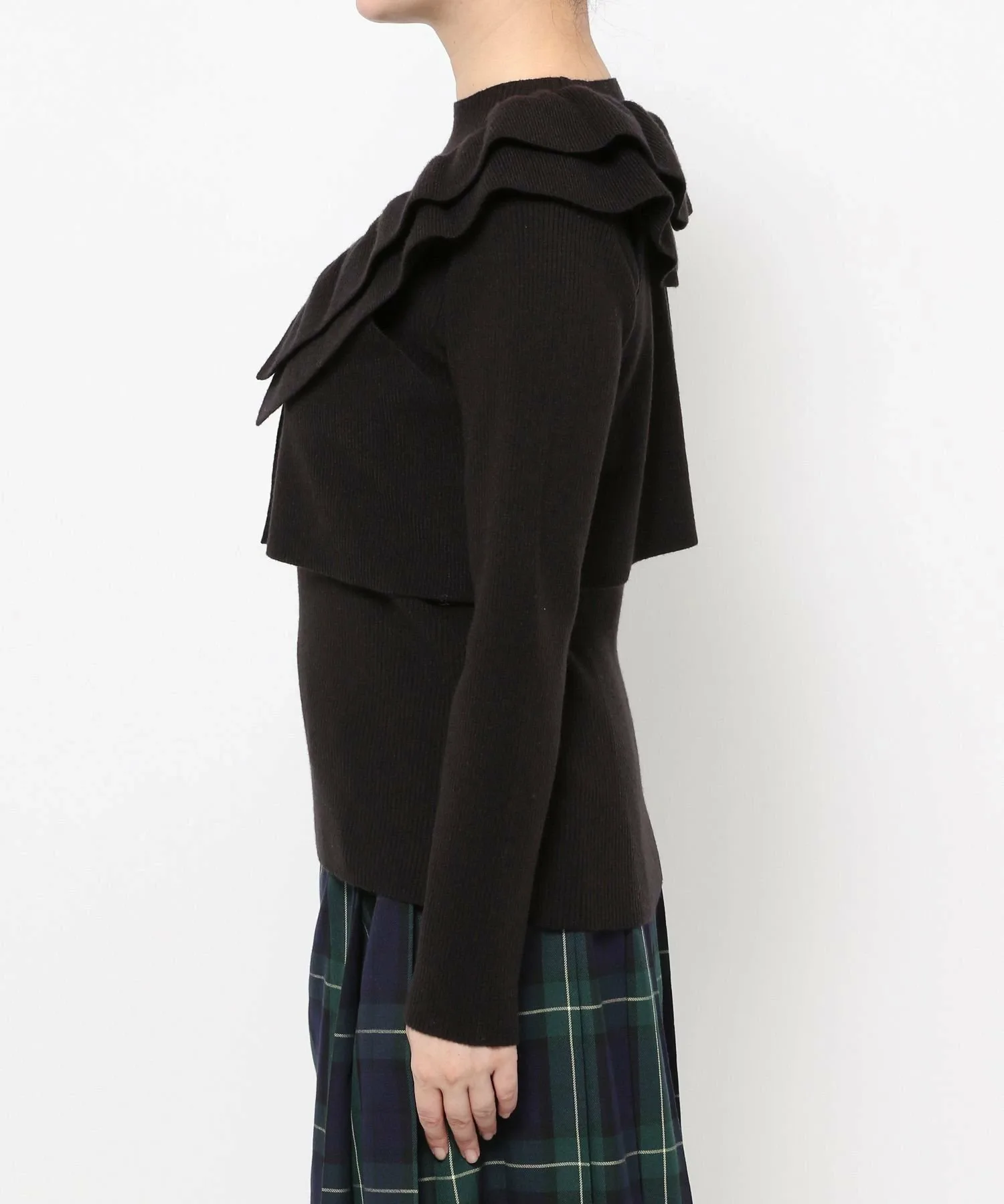 Комплект из двух предметов, состоящий из короткого жилета с оборками и ребристого пуловера с высоким воротником.